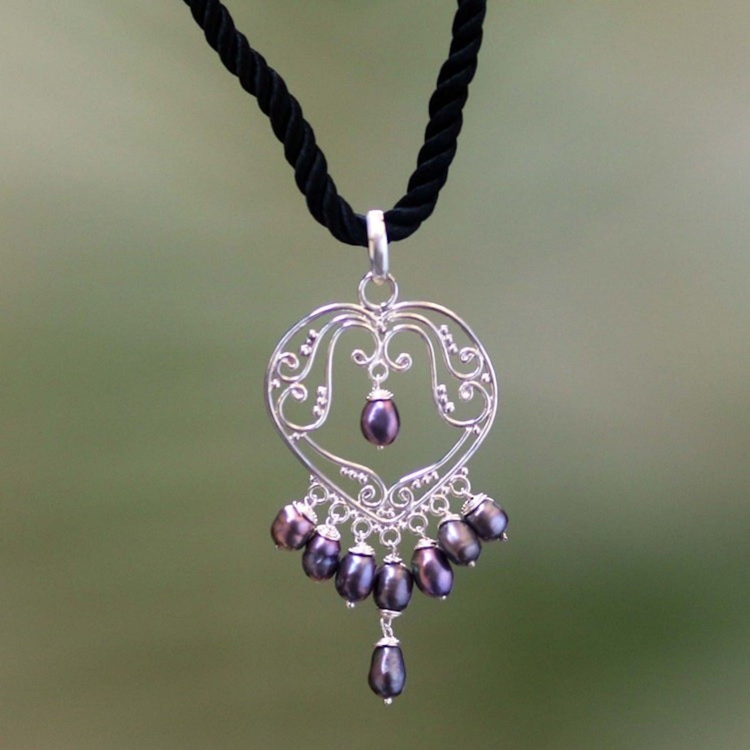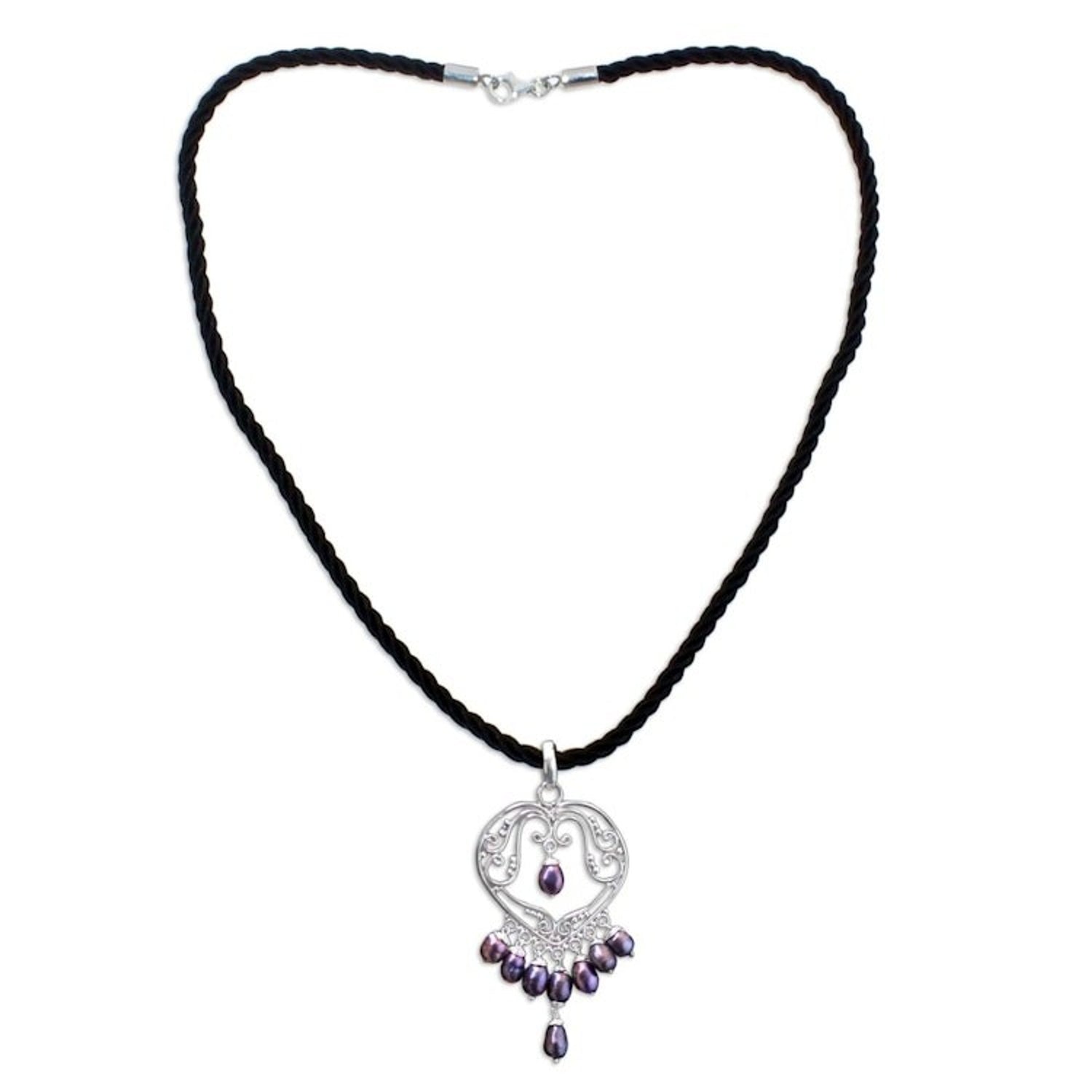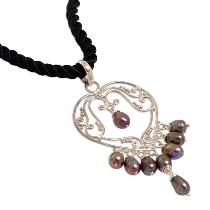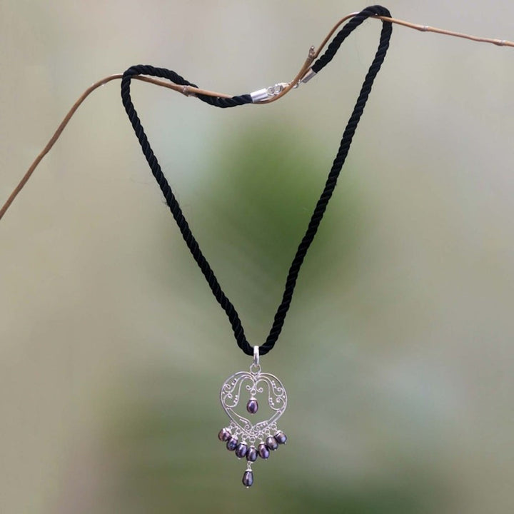 Pearl heart necklace '' This 'heart necklace' by Independent Artisans is a captivating piece that evokes all the nuances of a symphony in sterling silver. Balinese artisan Nyoman Rena has created an opulent pendant in the shape of a heart that is adorned with shimmering pearls. Displayed on a black silk cord, the contrast between the polished silver, the glowing pearls, and the deep black cord is exquisite. This necklace is a prime example of Rena’s art, blending his unique skills in both carving and metalwork to create a piece that is both personal and timeless.