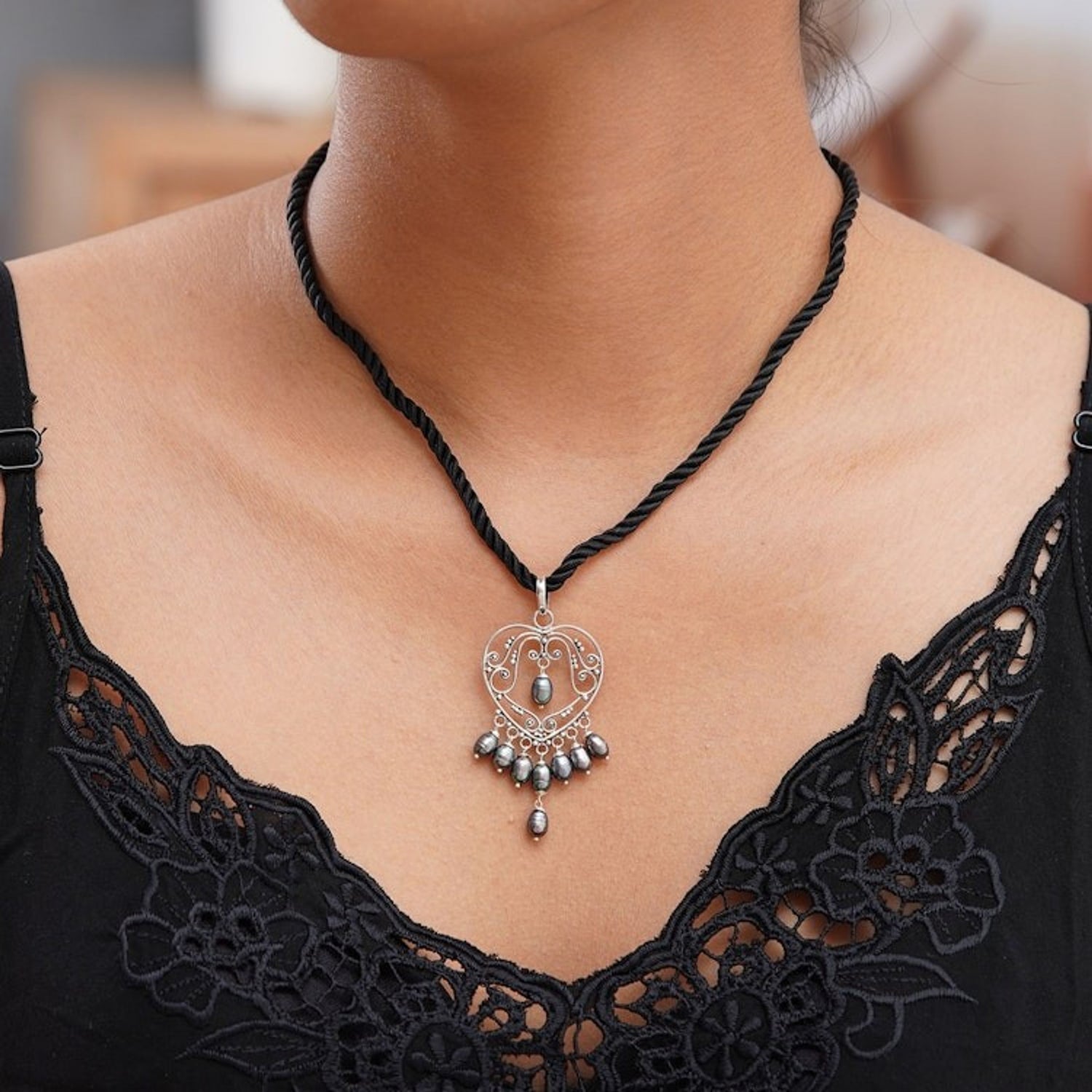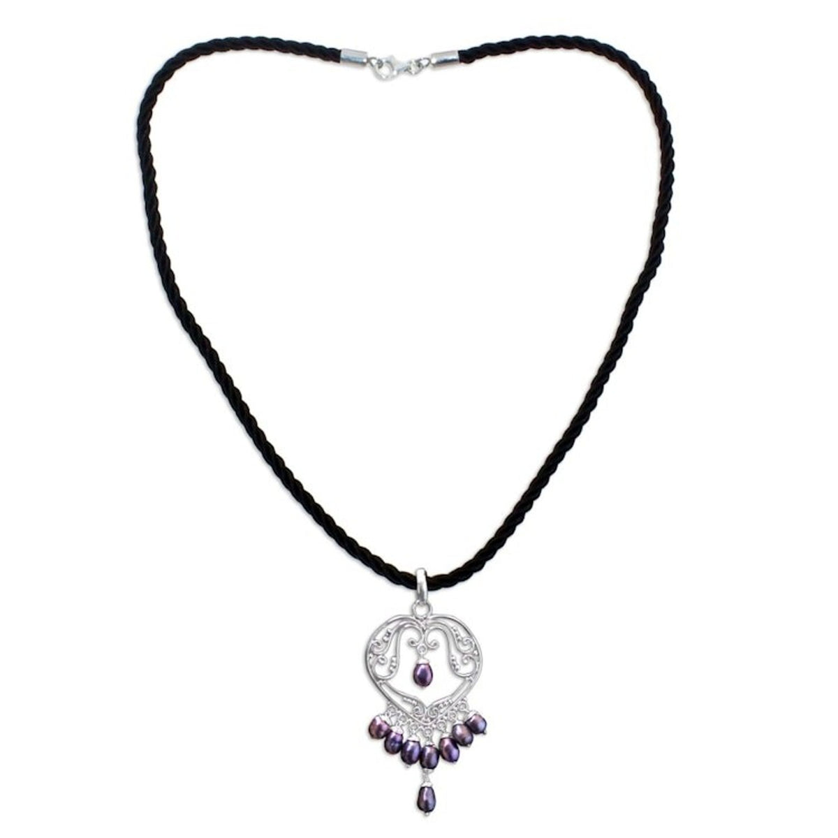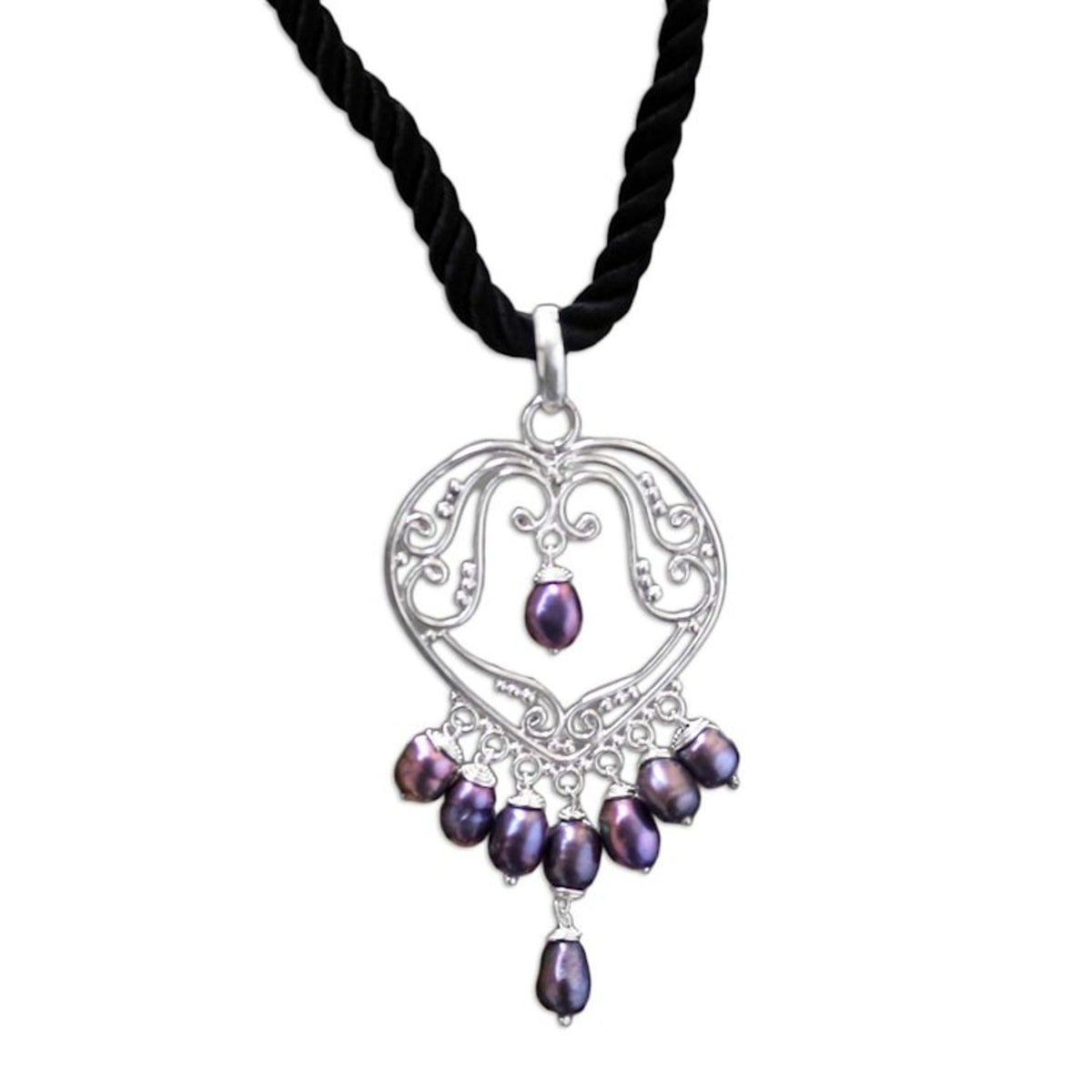Pearl heart necklace '' This 'heart necklace' by Independent Artisans is a captivating piece that evokes all the nuances of a symphony in sterling silver. Balinese artisan Nyoman Rena has created an opulent pendant in the shape of a heart that is adorned with shimmering pearls. Displayed on a black silk cord, the contrast between the polished silver, the glowing pearls, and the deep black cord is exquisite. This necklace is a prime example of Rena’s art, blending his unique skills in both carving and metalwork to create a piece that is both personal and timeless.