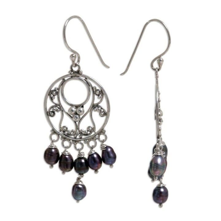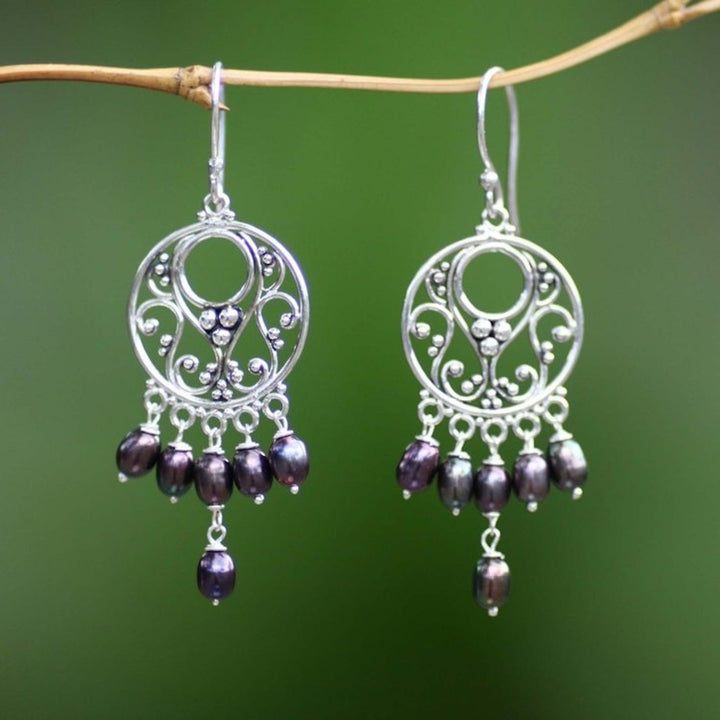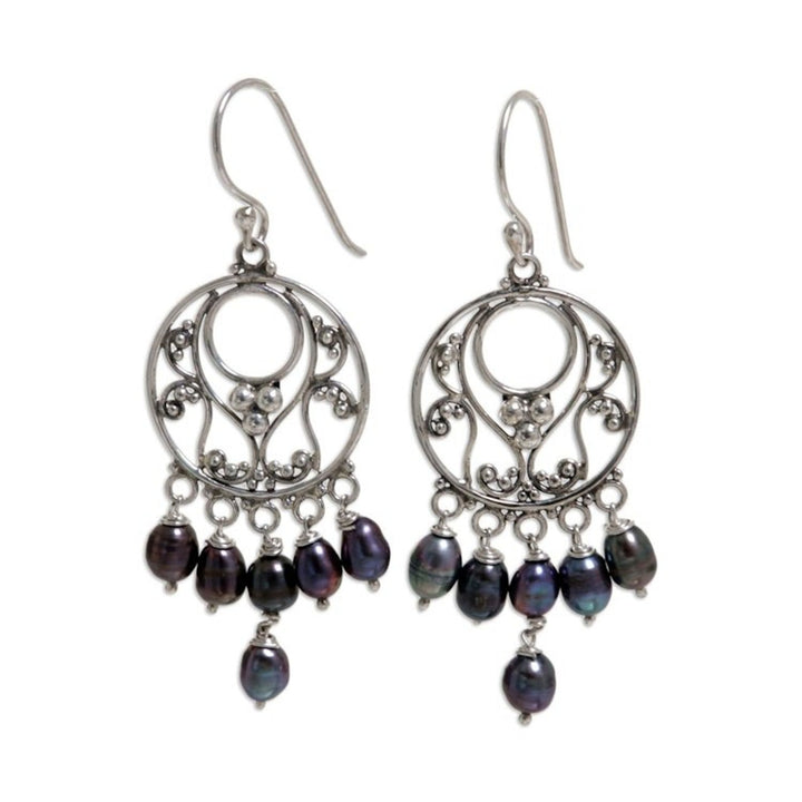 Pearl Sterling Silver Chandelier Earrings 'Dark Moonbeams' These 'Dark Moonbeams' chandelier earrings by Independent Artisans are an original design from Balinese artisan Nyoman Rena. An ornate sterling silver medallion at the top of the design conjures the image of a full moon. Falling below like mystical "moonbeams," iridescent black pearls add a touch of drama and mystery. This unique piece is a testament to Rena's ability to blend Balinese heritage with a modern, fashion-forward sensibility.