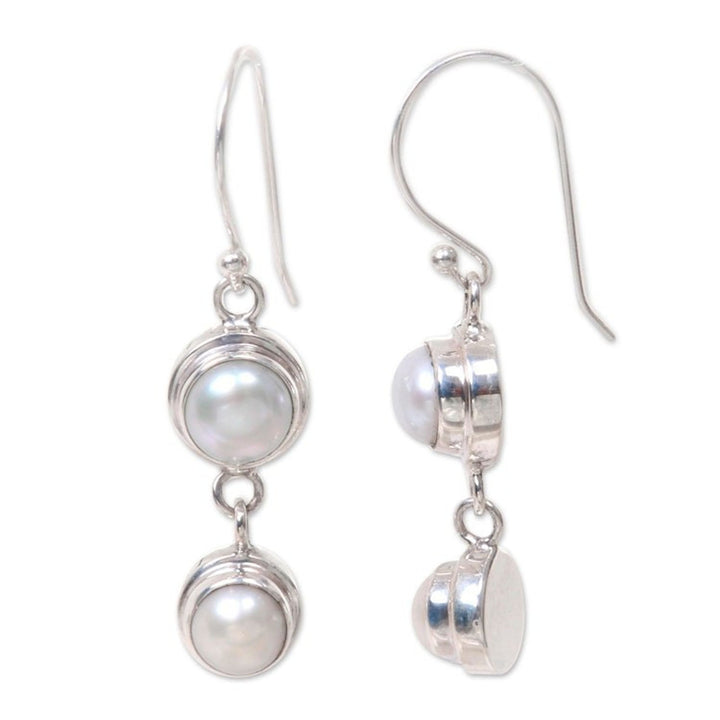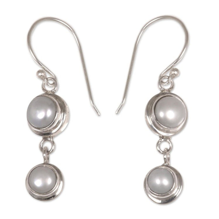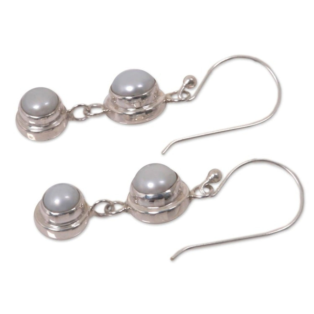 Pearl Sterling Silver Dangle Earrings 'Two Full Moons' These 'Two Full Moons' dangle earrings by Independent Artisans are a classic and elegant design from Balinese artisan Nyoman Rena. Luminous freshwater pearls, which represent June's birthstones, are set within highly polished argent circles. The pearls appear to radiate "silver moonlight," creating a beautiful and symbolic piece that is both timeless and ethereal. The design is a perfect blend of modern style and traditional craftsmanship.