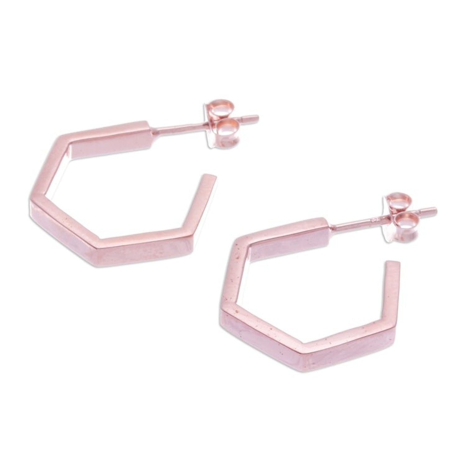 Pentagon-Shaped 18k Rose Gold-Plated Half-Hoop Earrings 'Pentagon of Grace' These 'Pentagon of Grace' half-hoop earrings from Independent Artisans are a graceful and modern design by Thai artisan Lalana Thawiaphiradimani. Inspired by the pentagon, a symbol of natural balance and harmony, the earrings are exquisitely sharp and minimalist. They are crafted from 18k rose gold-plated sterling silver, with a high-polish finish that adds a touch of sophistication and warmth. This piece reflects Lalana’s ability to blend traditional Karen hill tribe symbols with contemporary trends.