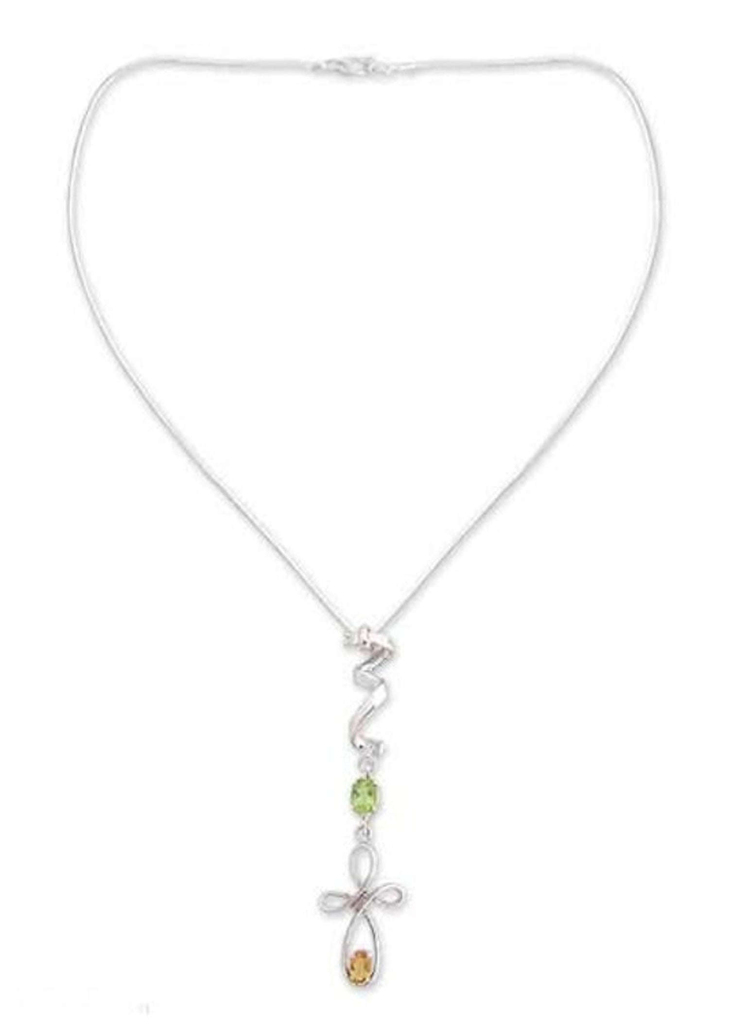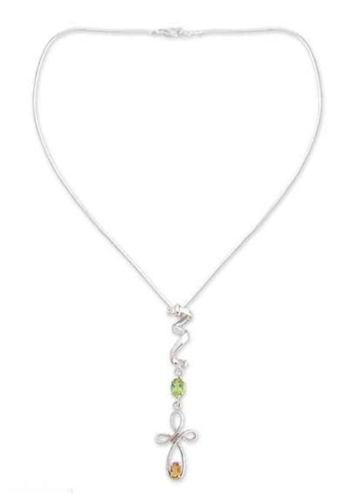 Peridot and citrine Y-necklace 'Spin' This 'Spin' Y-necklace from Independent Artisans is a cheerful and contemporary design from Indian artisan Hema. Sterling silver whirls and spins to culminate in polished loops, with peridot and citrine stones clasped within the argent strands. The necklace is rhodium-plated to prevent tarnish, ensuring a lasting high-polish finish. This piece is an artistic calling for Hema, representing her joy in innovation and her desire to see Indian artistry celebrated globally.