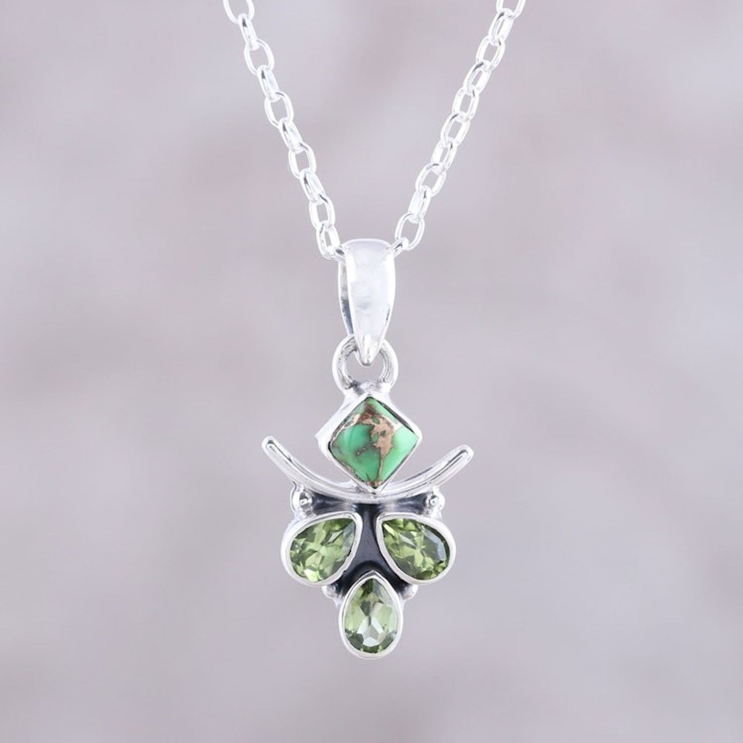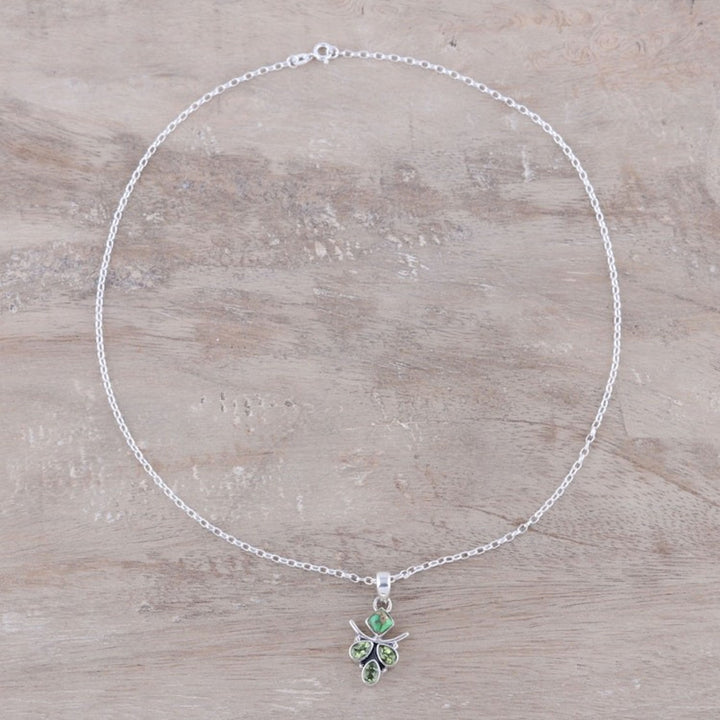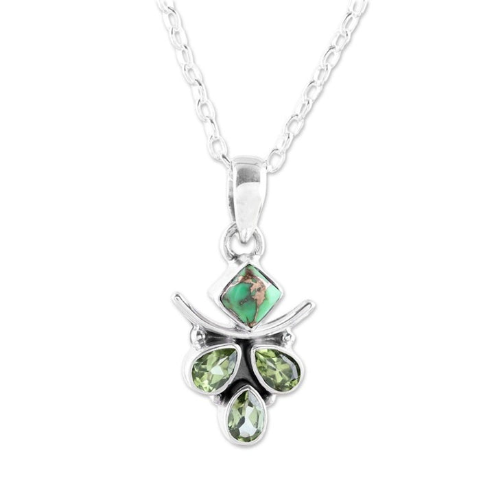 Peridot and Composite Turquoise Pendant Necklace from India 'Verdant Wonder' This 'Verdant Wonder' pendant necklace from Independent Artisans is a fascinating piece by Indian artisan Shanker. Crafted by local artisans, it combines verdant pear-shaped peridots with a square piece of green composite turquoise. The sterling silver setting highlights the beautiful contrast of the different stone shapes and colors. This piece reflects Shanker's journey from farming to jewelry design, showcasing his dedication, creativity, and commitment to originality.