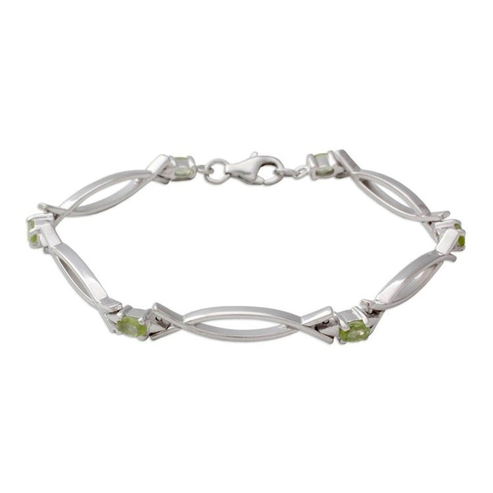 Peridot bracelet 'Modern Grace' This 'Modern Grace' bracelet from Independent Artisans is a delightful and original design by Indian artisan Hema. Sleek arcs of rhodium-plated sterling silver form an elegant, intertwining pattern. Each arc is set with a polished oval peridot, giving the bracelet a contemporary feel while honoring traditional artistry. This piece represents Hema’s passion for jewelry and her desire to see Indian artistry celebrated globally.