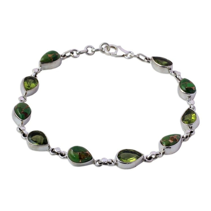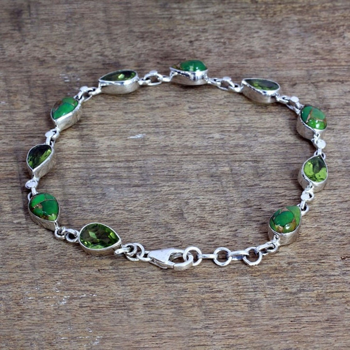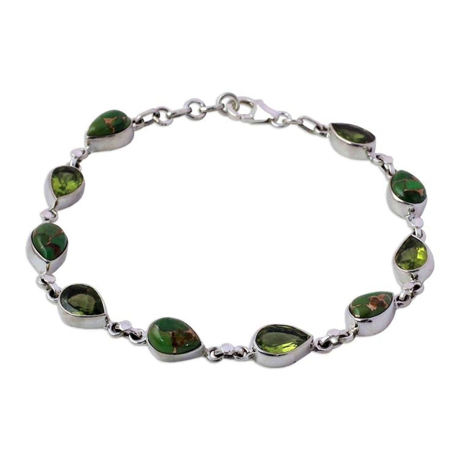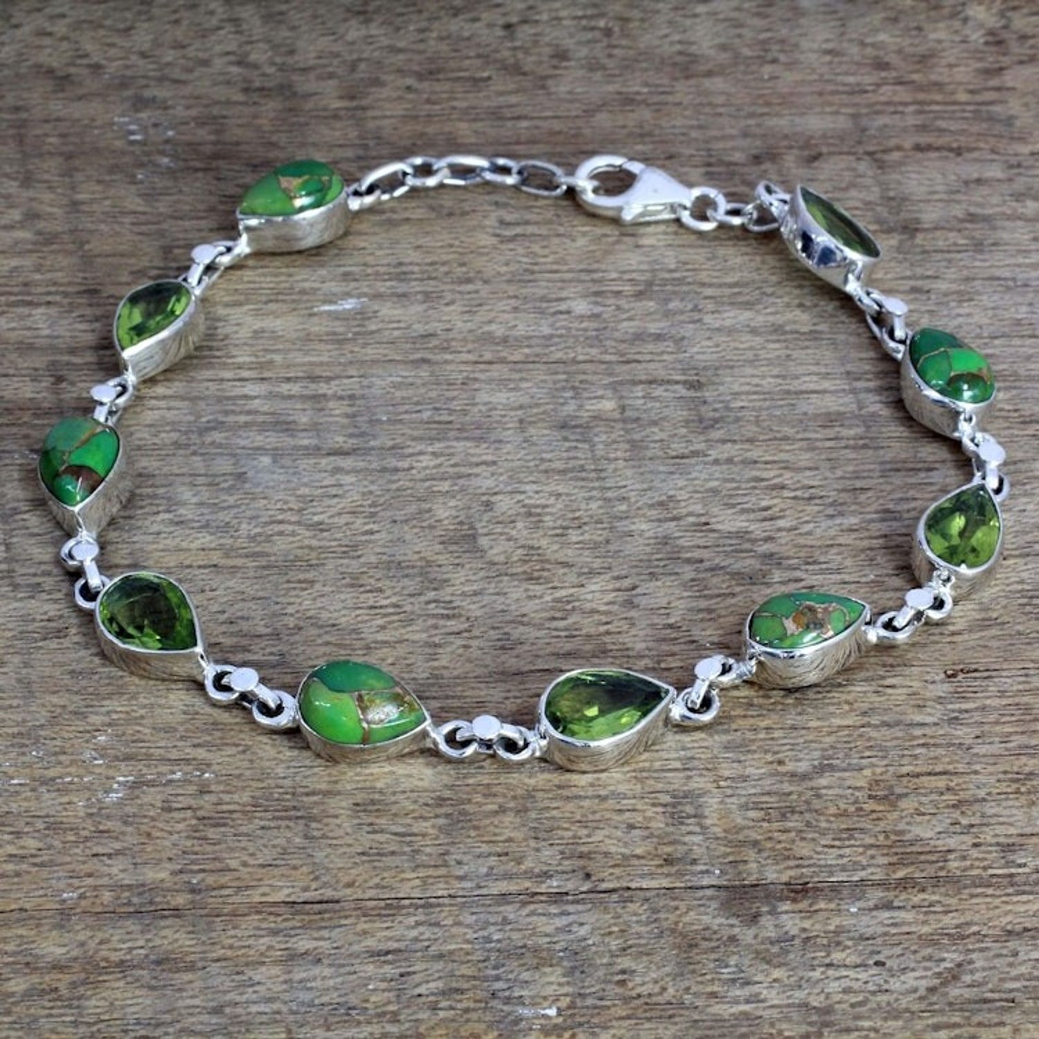 Peridot Composite Turquoise Link Bracelet from India 'Sunny Drops in Green' This 'Sunny Drops in Green' link bracelet from Independent Artisans is a striking piece by Indian artisan Shanker. Handcrafted from sterling silver, it features a single-colored look with over seven carats of peridot stones alongside green composite turquoise. This piece highlights the artisan's commitment to quality and originality, as well as his dedication to his craft and the local artisans he works with.
