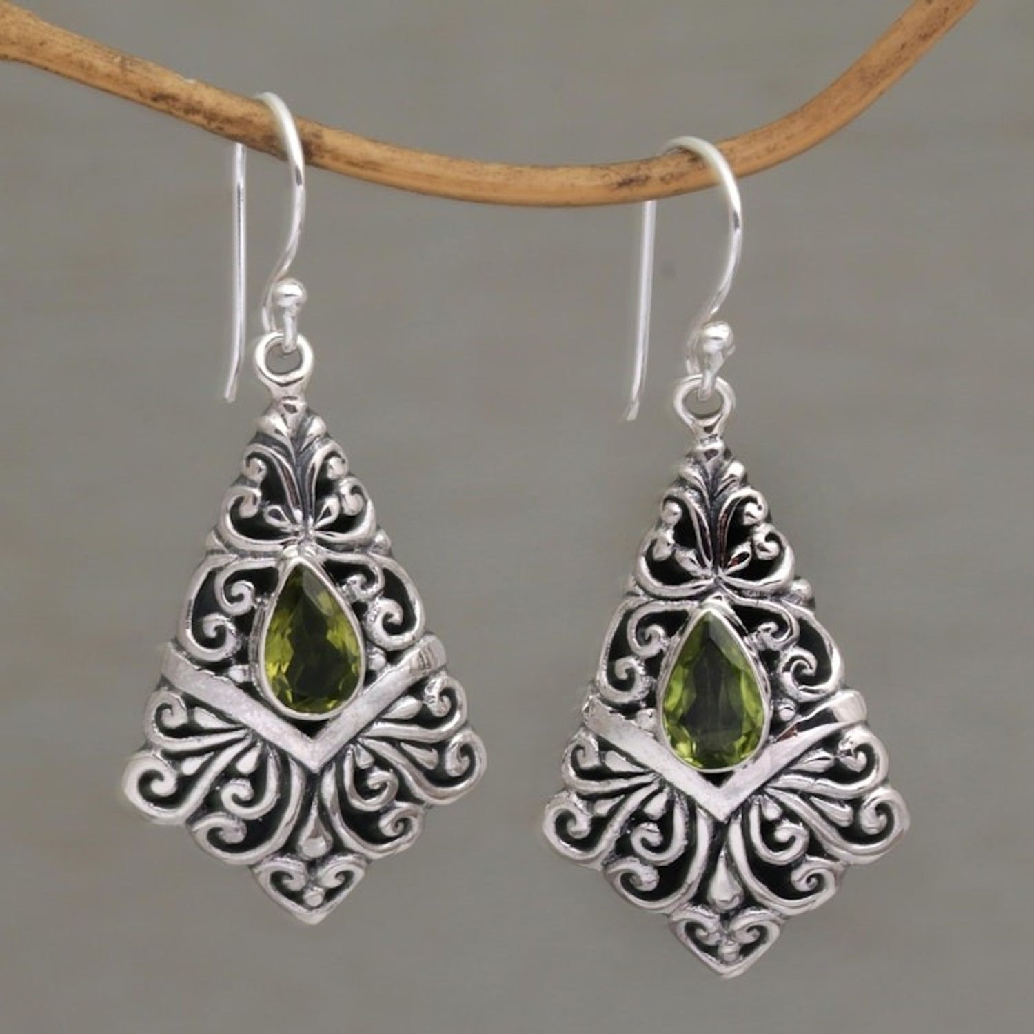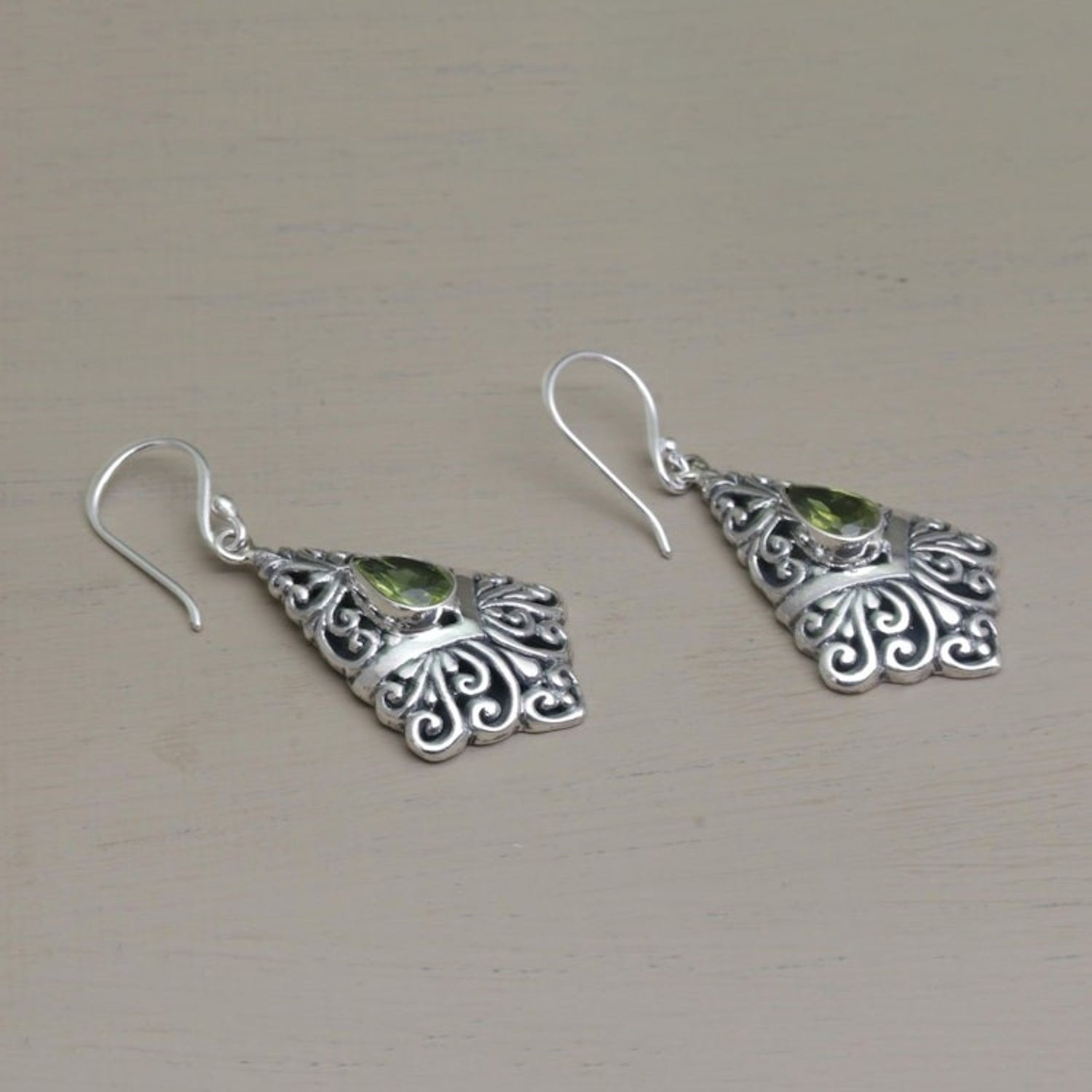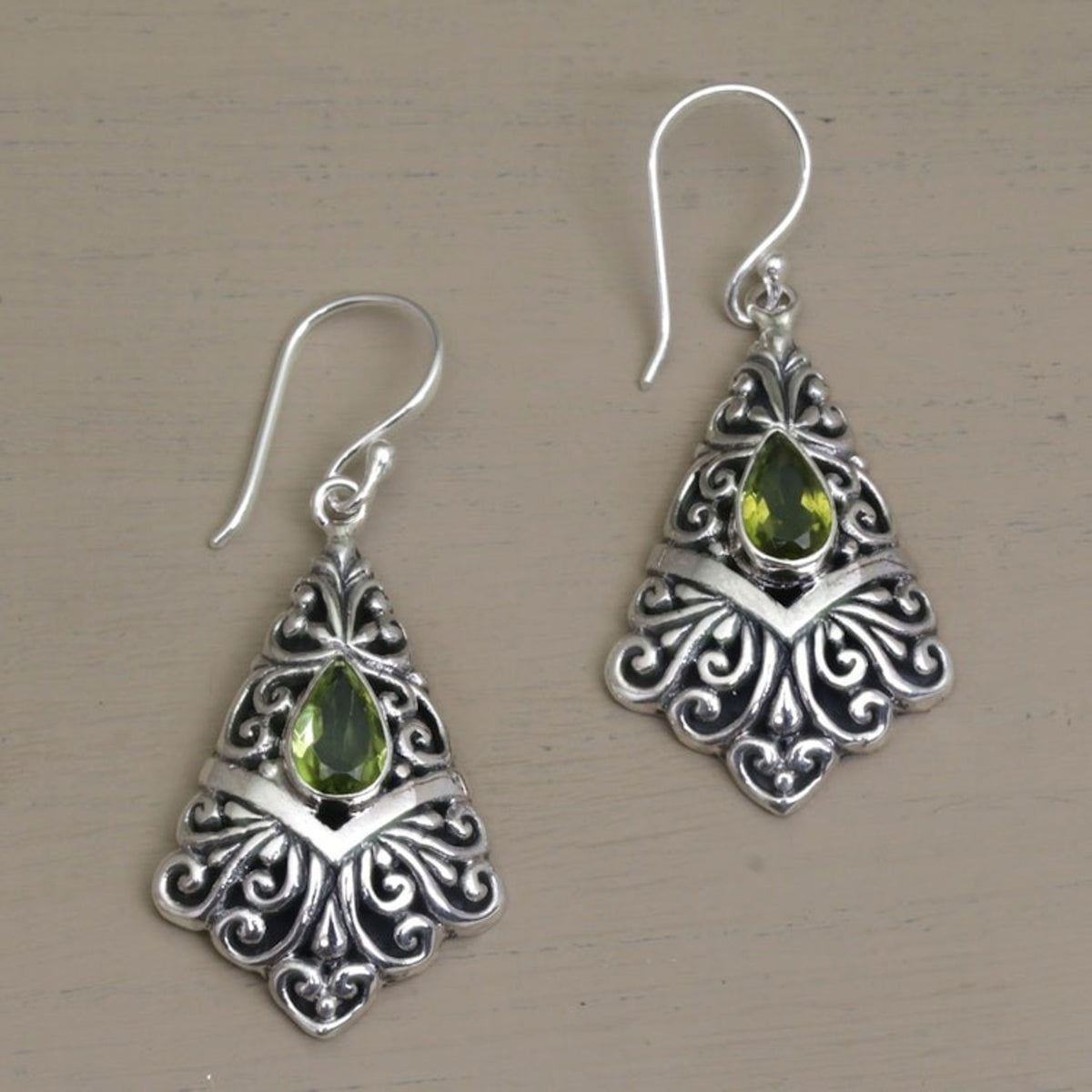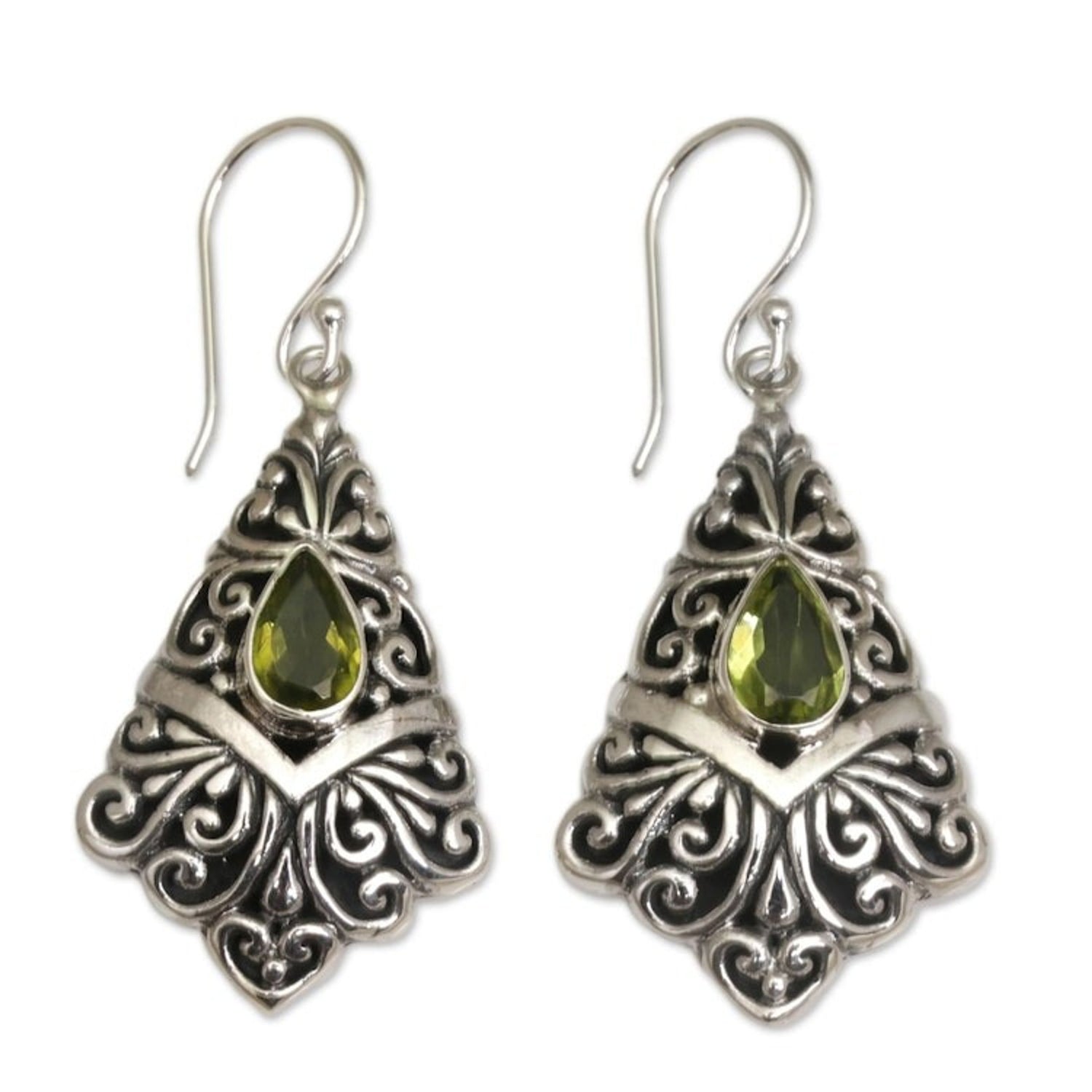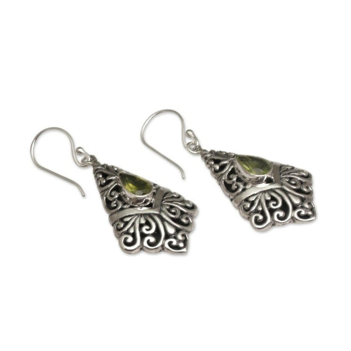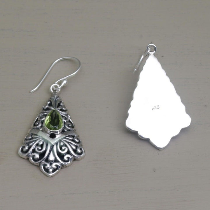 Peridot Dangle Earrings in Sterling Silver Settings 'Fanfare' These 'Fanfare' dangle earrings from Independent Artisans feature one carat of peridot gemstones that add their apple-green charm to a beautiful design by Balinese artisan Nyoman Rena. The earrings are handcrafted from sterling silver with magnificent openwork details, showcasing Rena’s distinctive style that blends Balinese heritage with contemporary design.