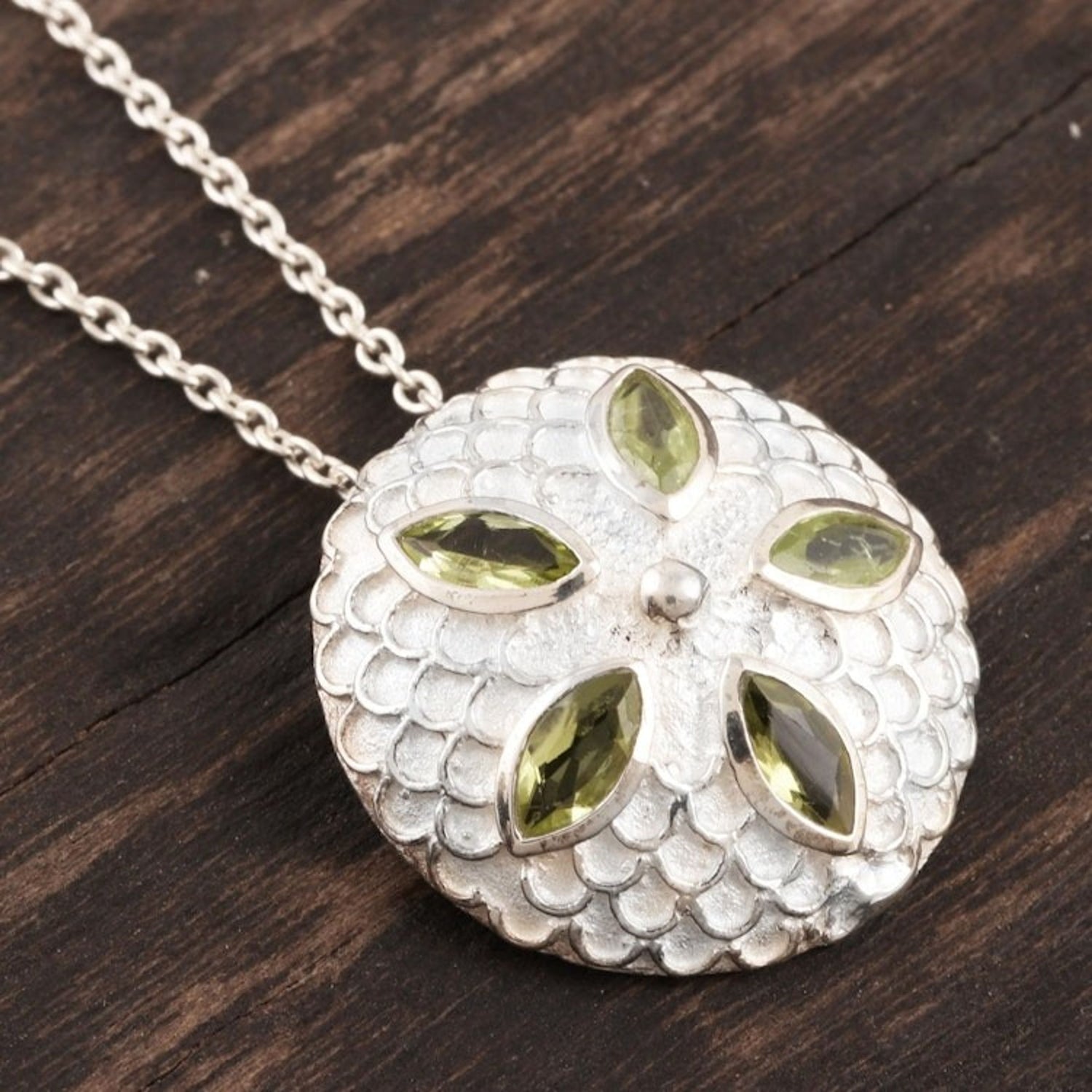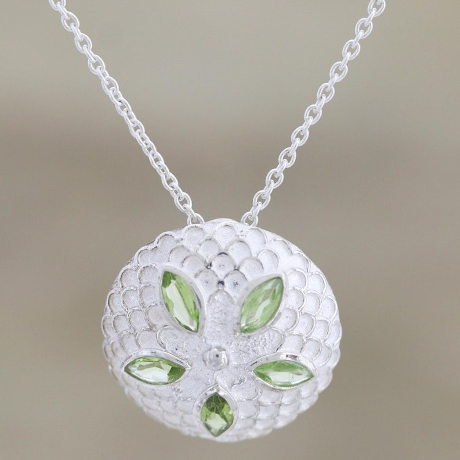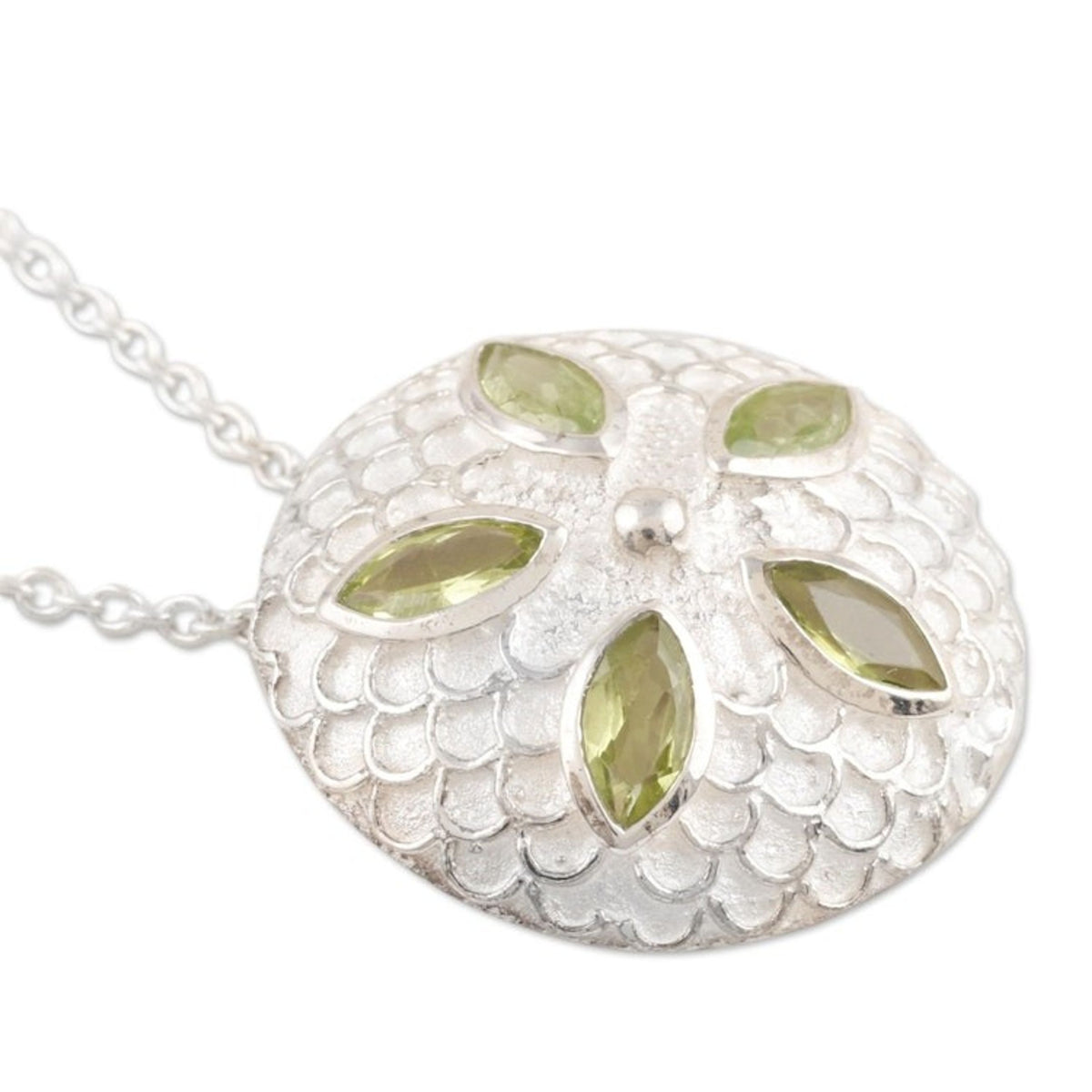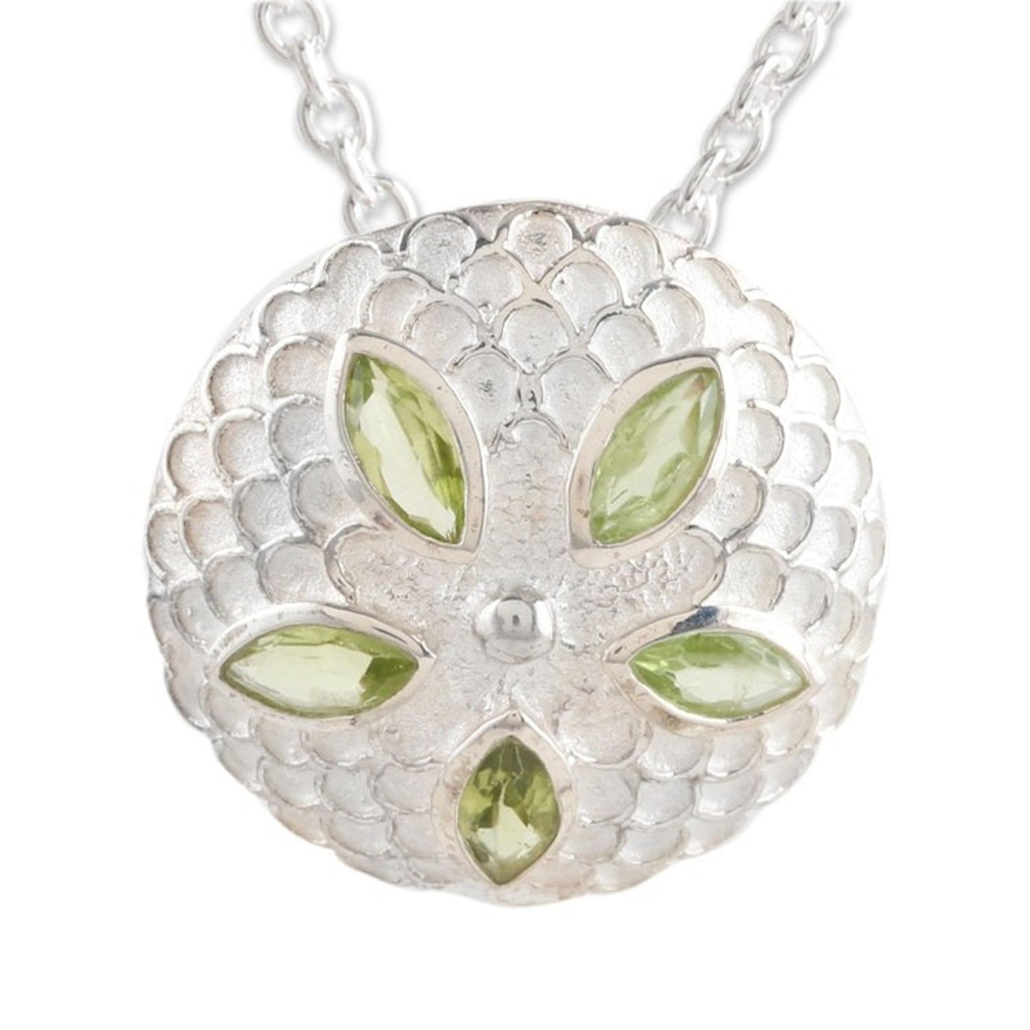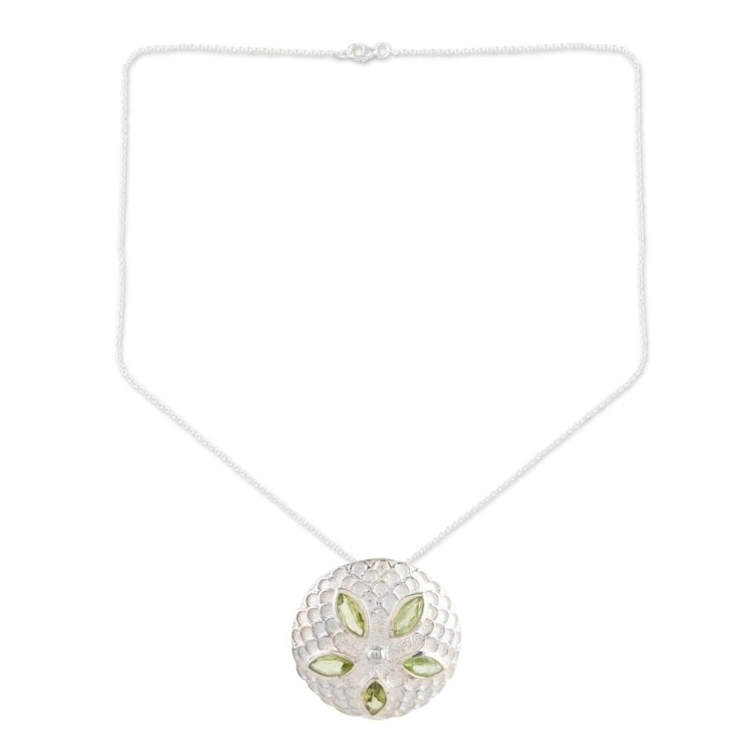 Peridot pendant necklace 'Chrysanthemum Star' This 'Chrysanthemum Star' pendant necklace from Independent Artisans is a lavish piece by Indian artisan Mahavir. A peridot, said to be nature's springtime gift, glows from the core of a chrysanthemum flower pendant. The sterling silver pendant is crafted with intricate detail, with each successive petal reflecting patient artistry. The exuberant pendant is accompanied by a sleek sterling silver chain, making this a beautiful piece that captures the vibrancy of Jaipur while remaining rooted in heritage and style.
