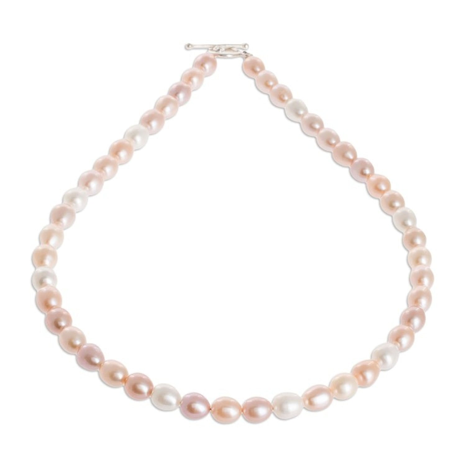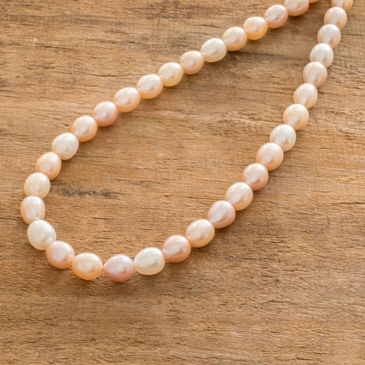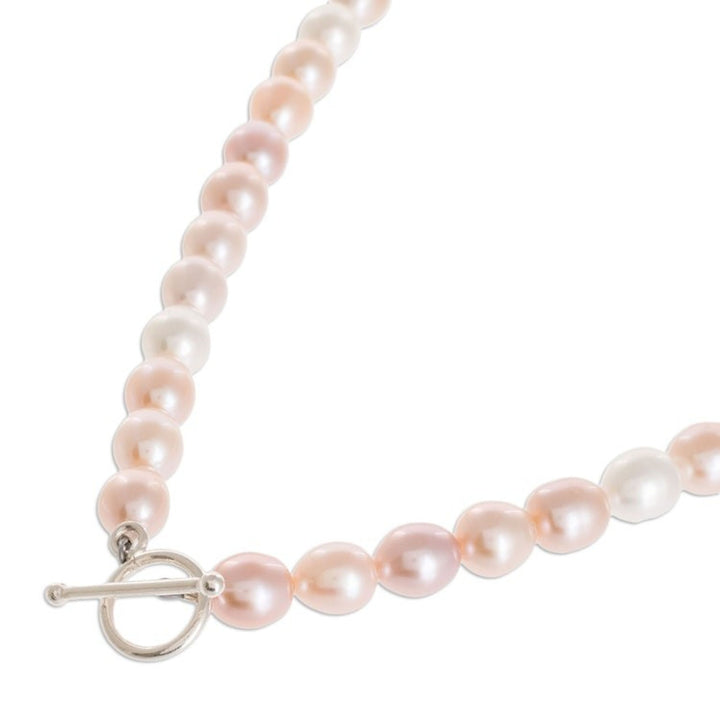 Pink and Peach Cultured Pearl Necklace 'Rosy Future' This 'Rosy Future' necklace is a classic strand created by Costa Rican artisan Miriam Bruten. Luminous cultured pearls in assorted shades of pink, peach, and cream make up the necklace, which is completed with a sterling silver toggle clasp. This piece is designed for everyday wear as well as special occasions, reflecting Bruten's love for quality and detail.