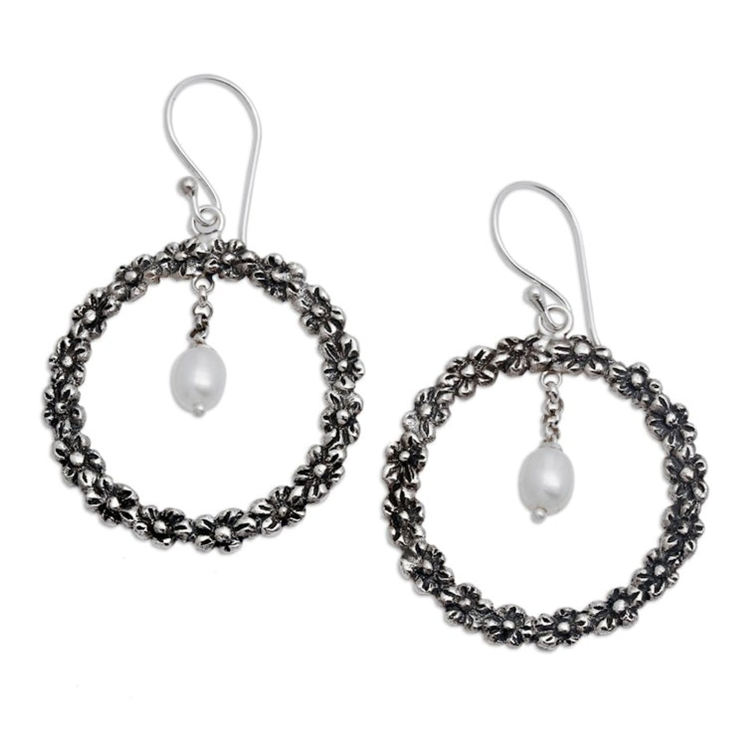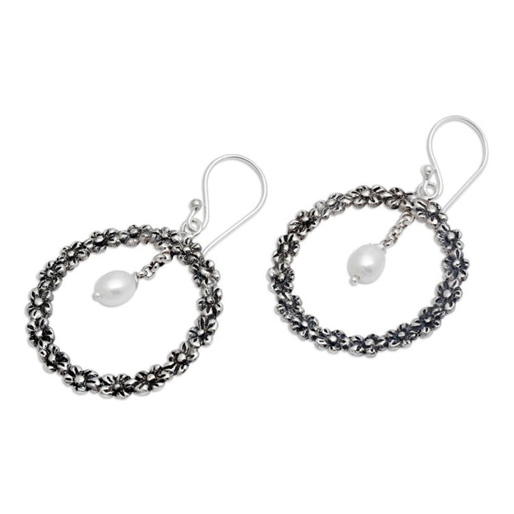 Plumeria-Themed Cultured Pearl Silver Dangle Earrings 'Plumeria Blossoms' These 'Plumeria Blossoms' dangle earrings from Independent Artisans are a stylish design by Balinese artisan Nyoman Rena. Gorgeous plumeria blooms adorn the sterling silver hoop structures, from which exquisite white cultured pearls with a lovely rose overtone sway gracefully. The piece is finished with a stunning combination of polished and oxidized surfaces, adding a touch of sophistication.
