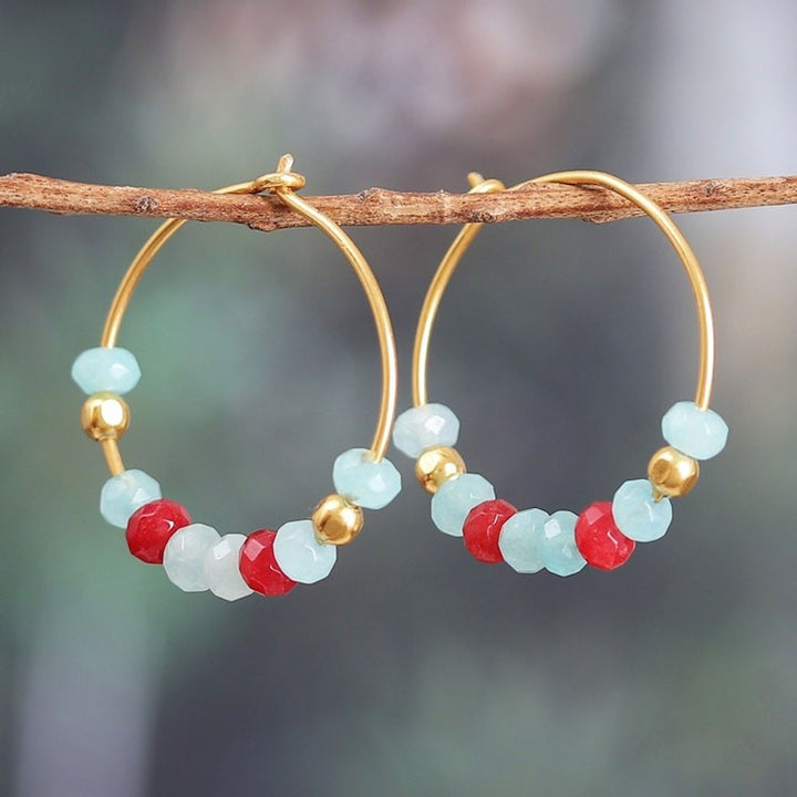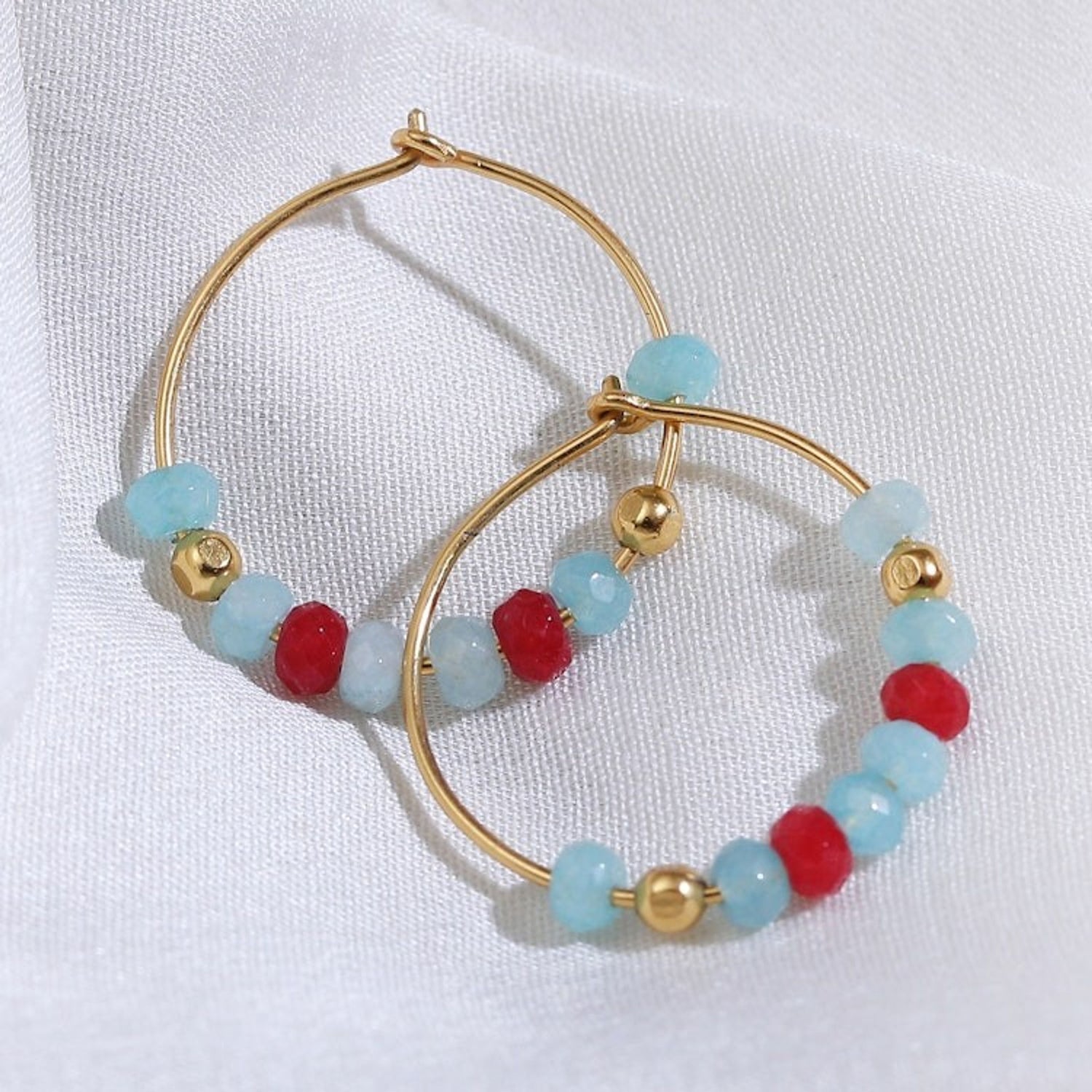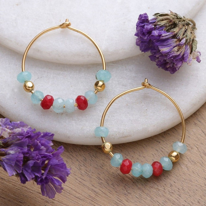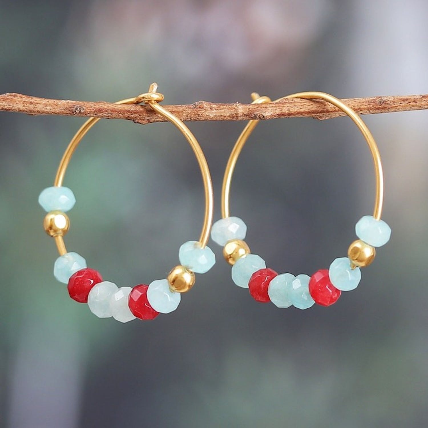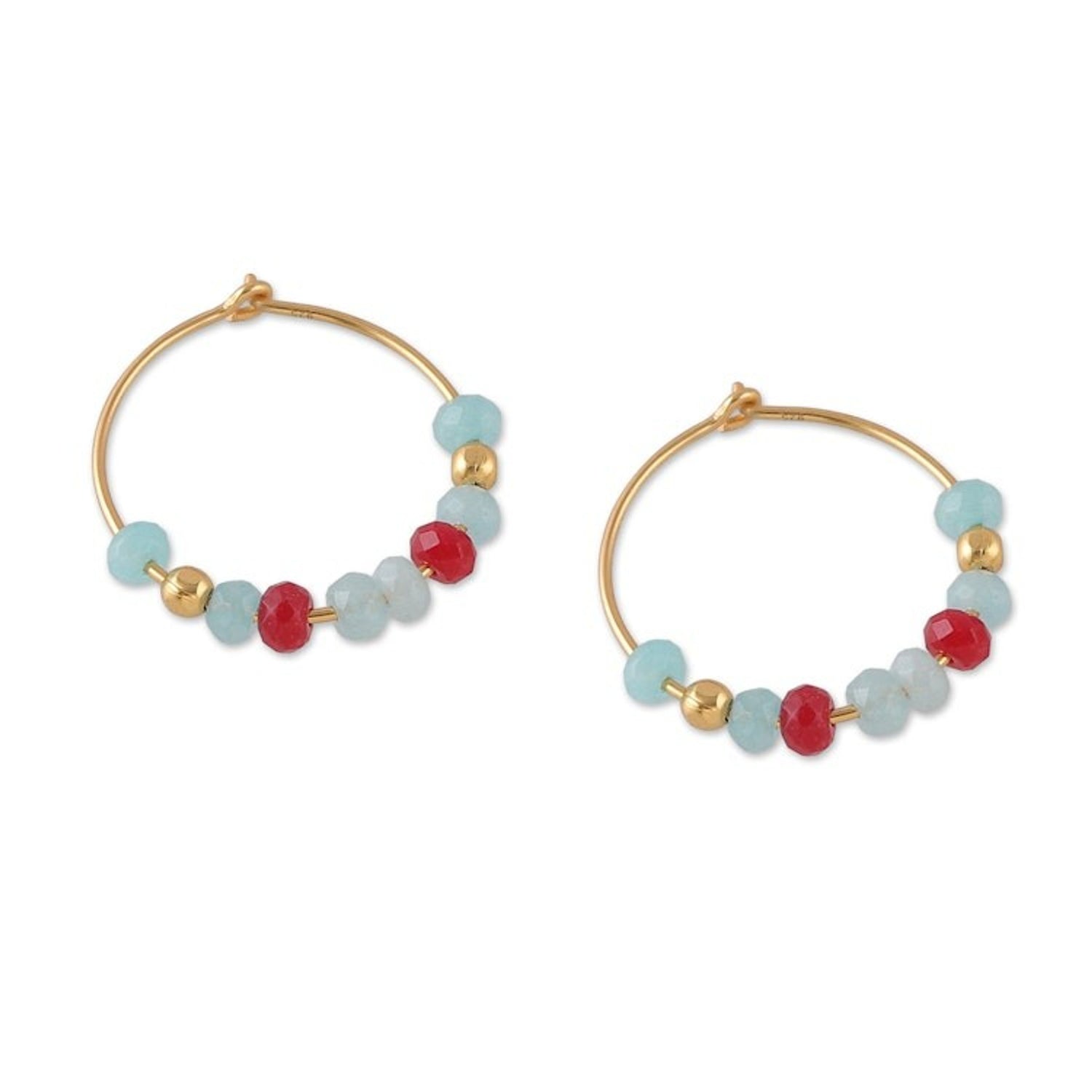 Polished 18k Gold-Plated Chalcedony and Onyx Hoop Earrings 'Gorgeous Cycles' These 'Gorgeous Cycles' hoop earrings are a sublime piece by Indian designer Neetu Barathi. Enriched by a glorious 18k gold plating, the earrings feature beads of chalcedony and red onyx that symbolize healing and courage. The accessories are polished for a radiant look and are designed to infuse your days with a sophisticated, joyful essence.