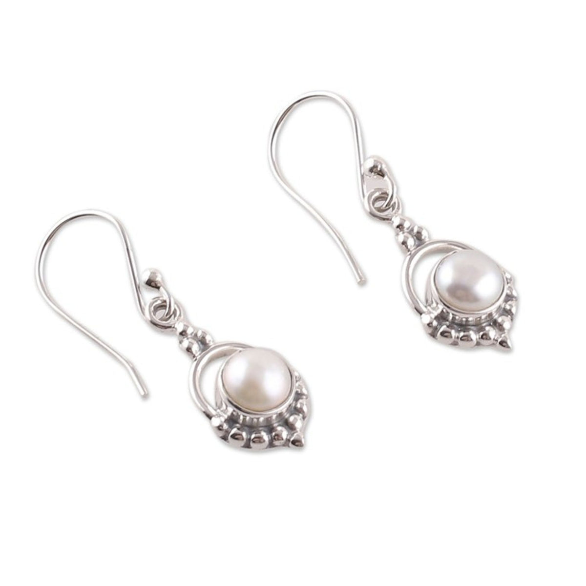 Polished Cream Cultured Pearl Dangle Earrings from India 'Pure Allure' These sterling silver 'Pure Allure' dangle earrings by Indian designer Narayani feature cultured pearls in a natural cream hue, which symbolizes innocence and purity. The design, gracefully adorned with advanced silversmithing, features classic accents that exude elegance. The piece complements the gems' charm with a polished finish and is crafted by local Indian artisans.