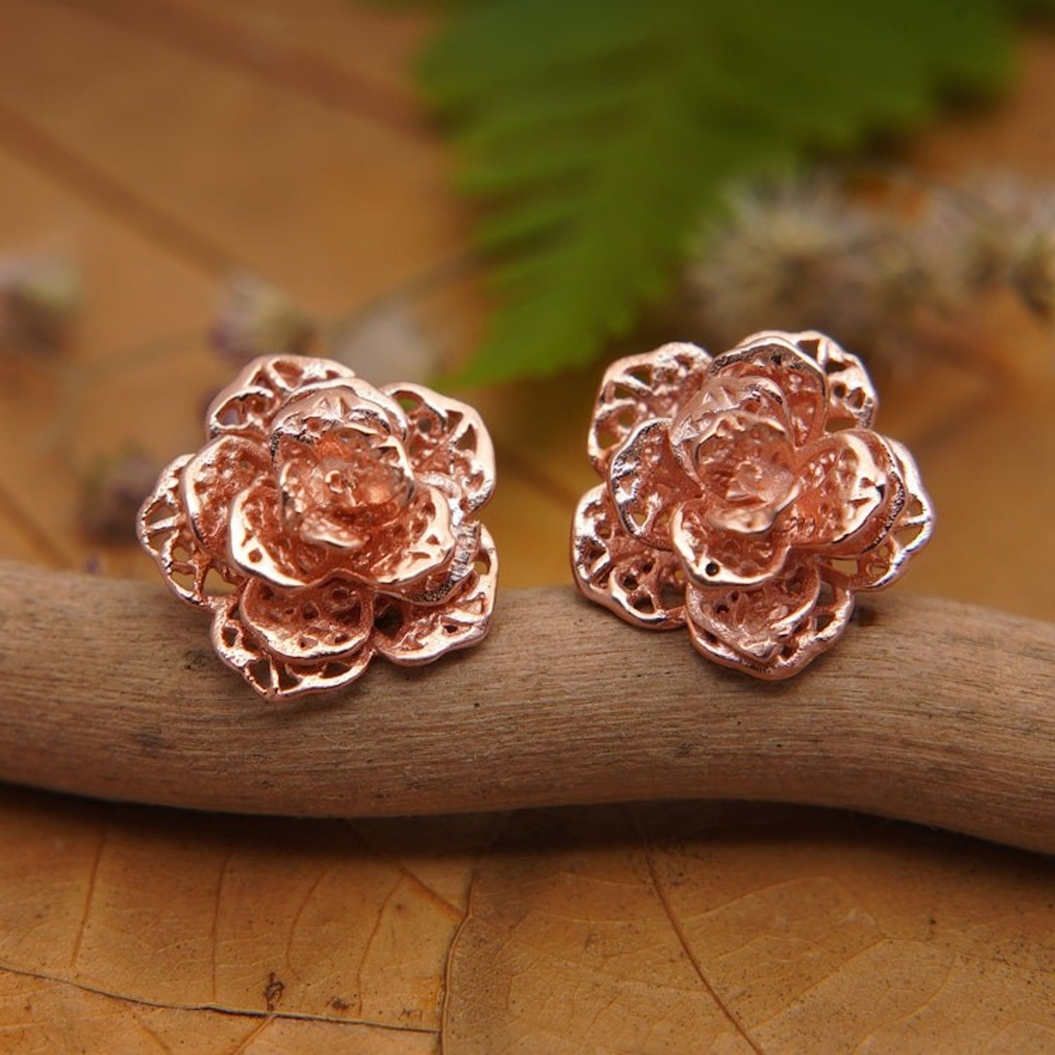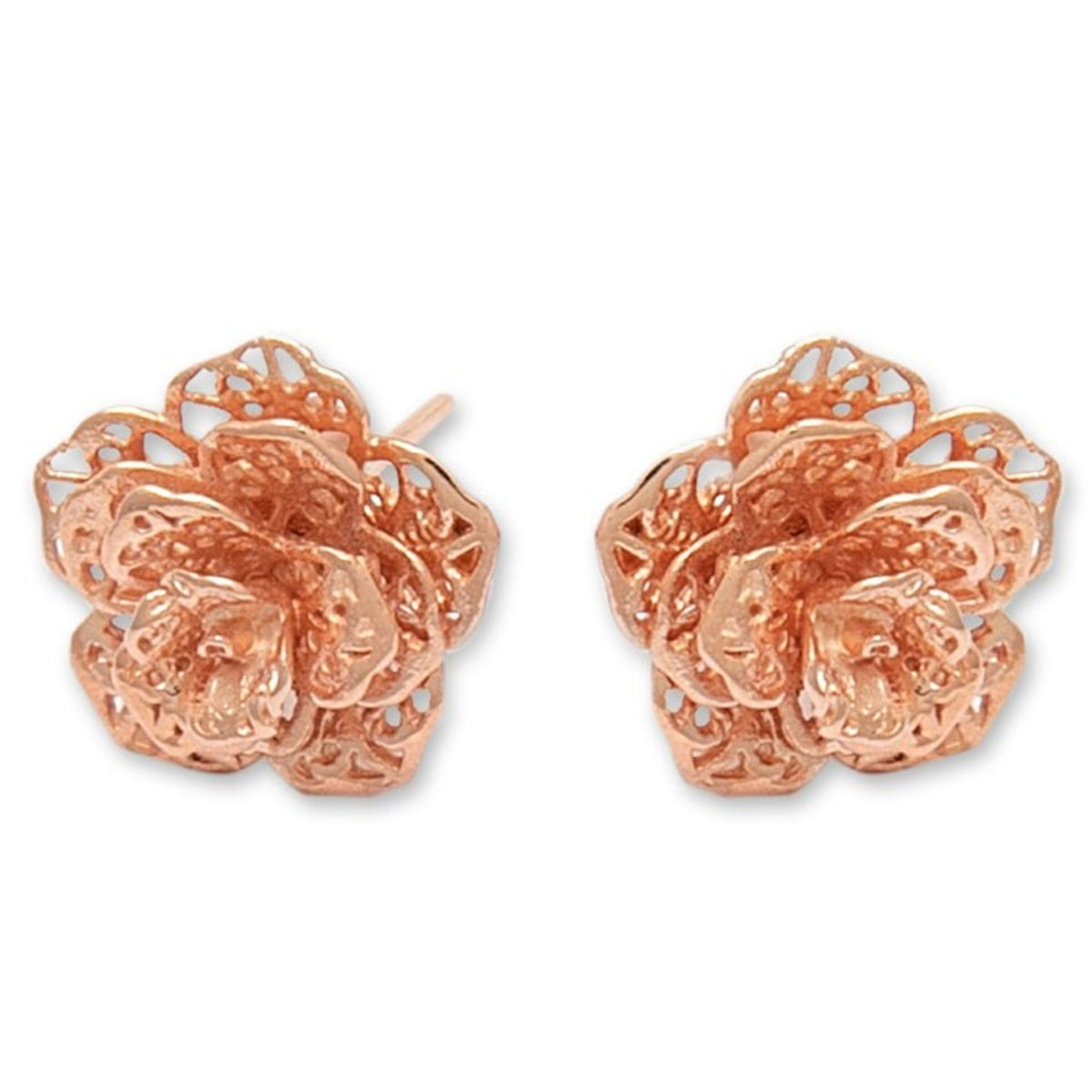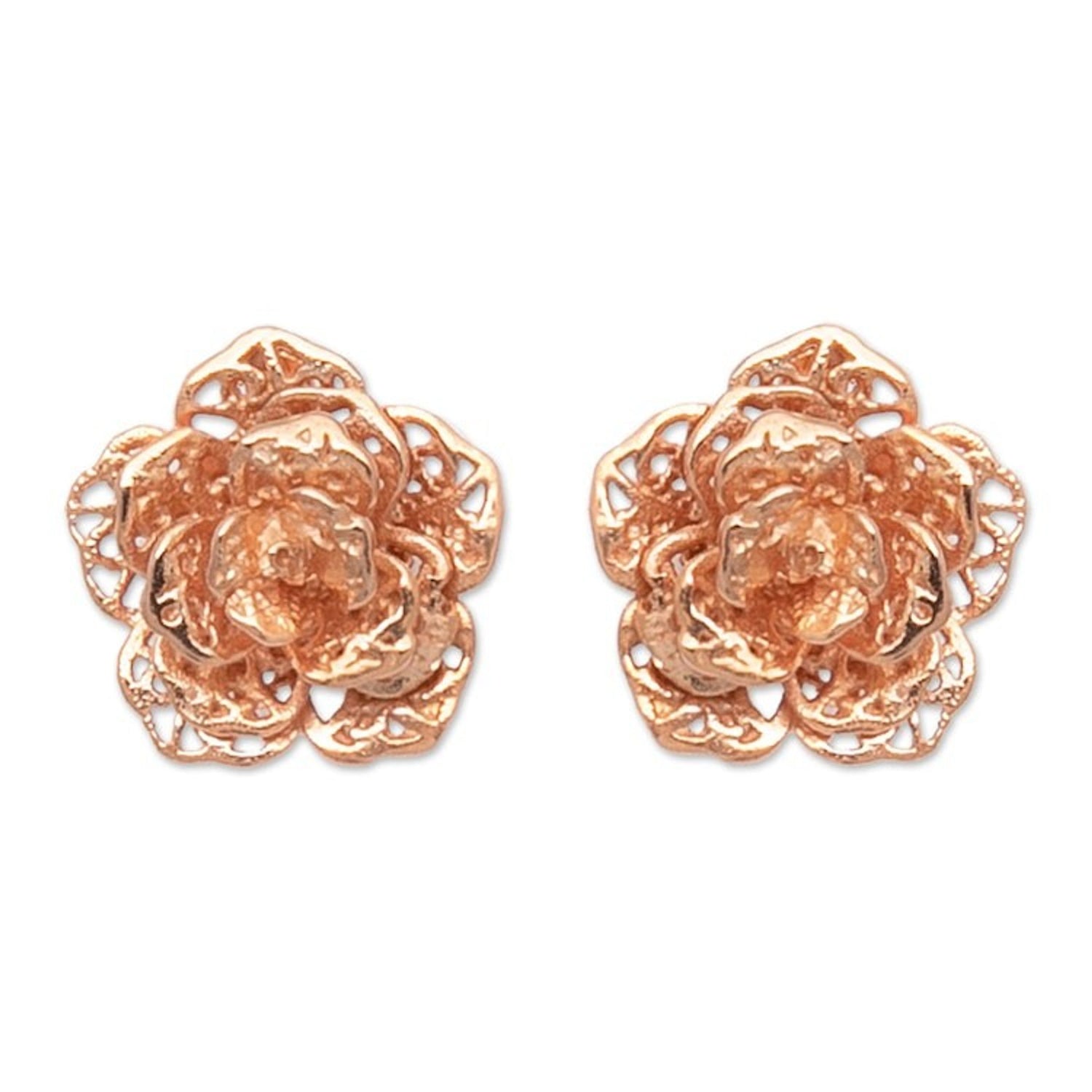 Polished Floral 18k Rose Gold-Plated Button Earrings 'Primaveral Rose' These 'Primaveral Rose' button earrings by Balinese designer Yuniati are inspired by roses and their romantic aura. The glamorous earrings' 18k rose gold plating adds a tender illusion that evokes a sweet spring day. Magic and charm emerge from the exquisite details.