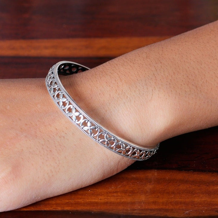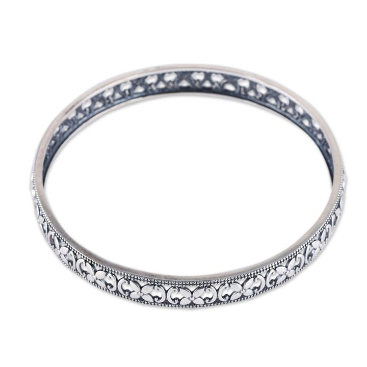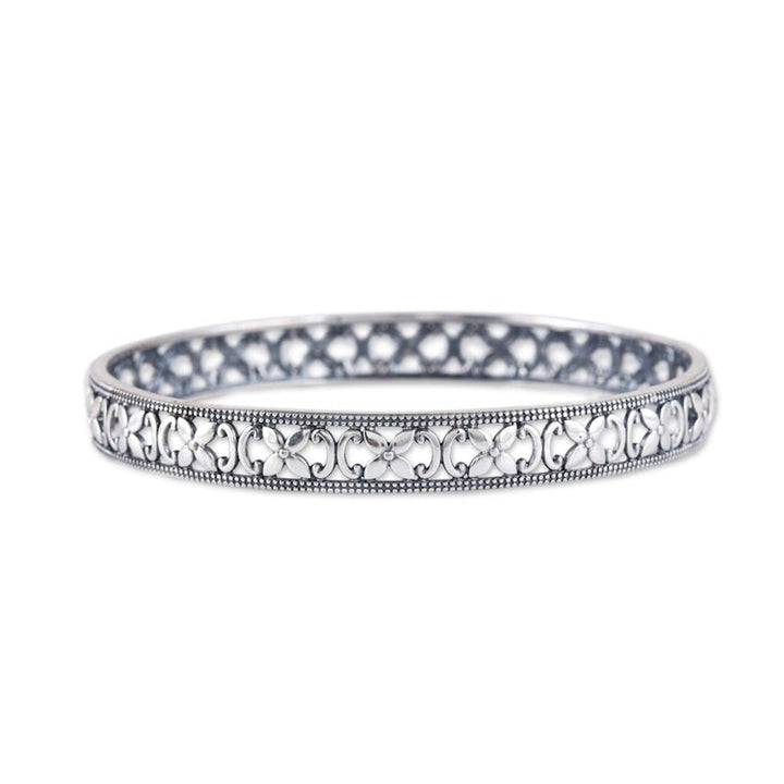 Polished Flower-Themed Sterling Silver Bangle Bracelet 'Spring Beauty' This sterling silver 'Spring Beauty' bangle bracelet by Indian artisan Bhavya Jain radiates elegance for any occasion. The polished design showcases intricate floral details inspired by the vitality of spring. The piece, which reflects both sophistication and a timeless appreciation for nature's beauty, is an exquisite example of Indian jewelry artistry.