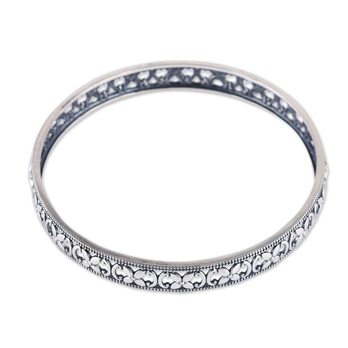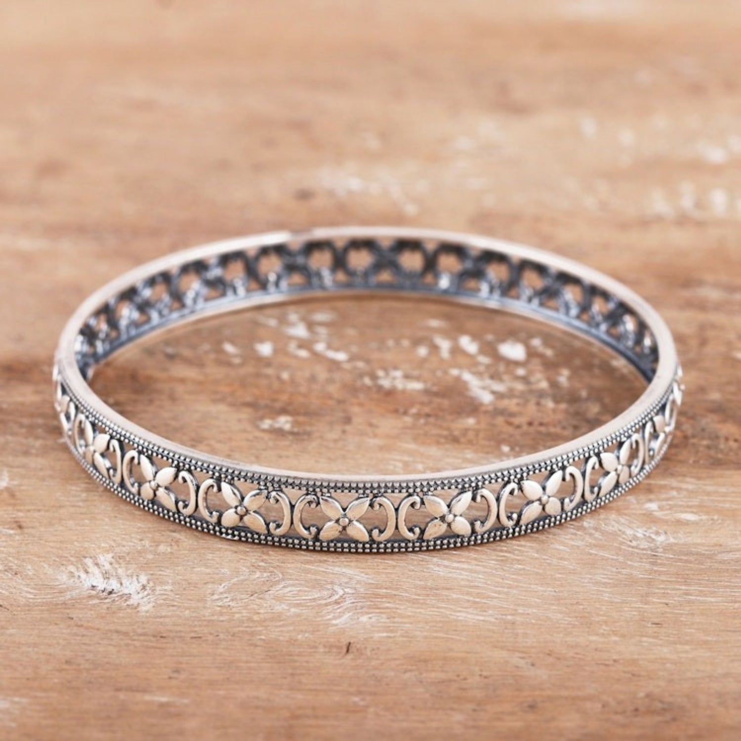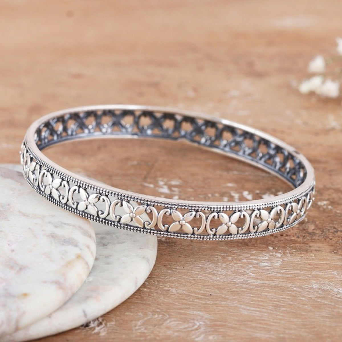 Polished Flower-Themed Sterling Silver Bangle Bracelet 'Spring Beauty'