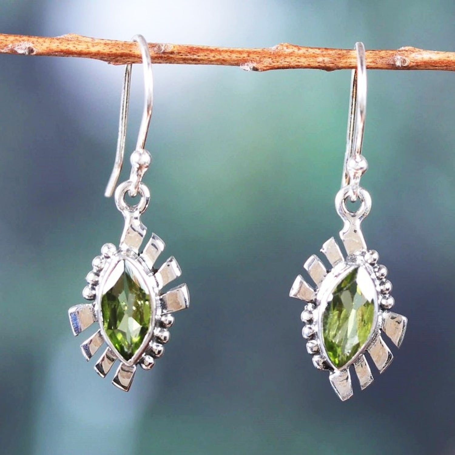 Polished Geometric Sterling Silver Peridot Dangle Earrings 'Fortunate Eyes' These 'Fortunate Eyes' dangle earrings by Indian designer Narayani feature natural marquise-shaped peridot stones that total two carats. Sharp sterling silver formations and little classic accents beautifully embrace the gems. The earrings shine with a refined green light, all thanks to their polished finish. In addition, the jewels are a famous amulet of good fortune, adding a mystic touch to this wondrous design.