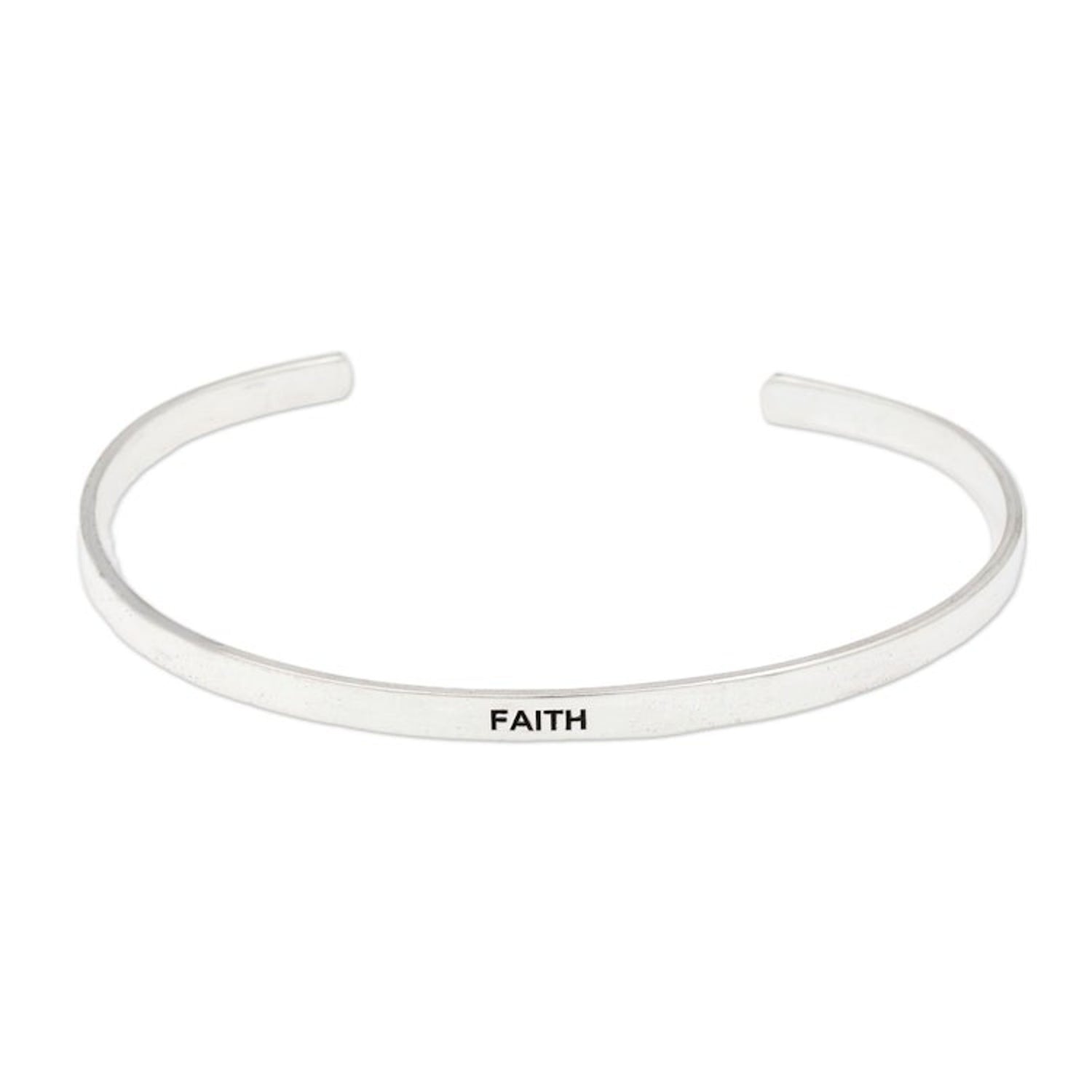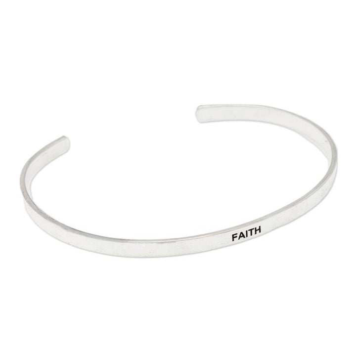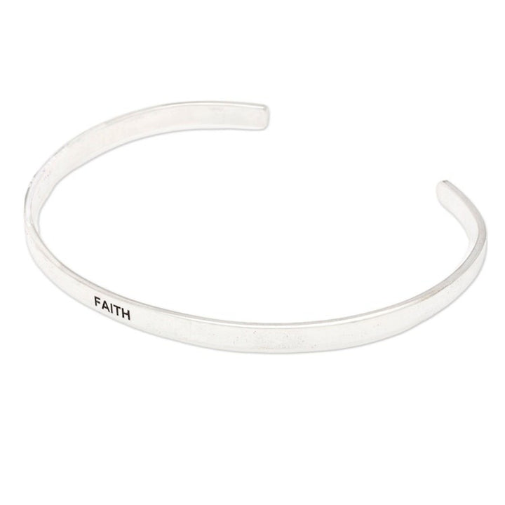 Polished Minimalist Sterling Silver Faith Cuff Bracelet 'Your Faith' This chic sterling silver cuff bracelet by Balinese artisan Griya Suarningsih is aimed at those souls with great spirituality. Inspired by minimalist trends, the bracelet comes with the word 'faith' engraved at the front, allowing you to express your identity and unique essence.