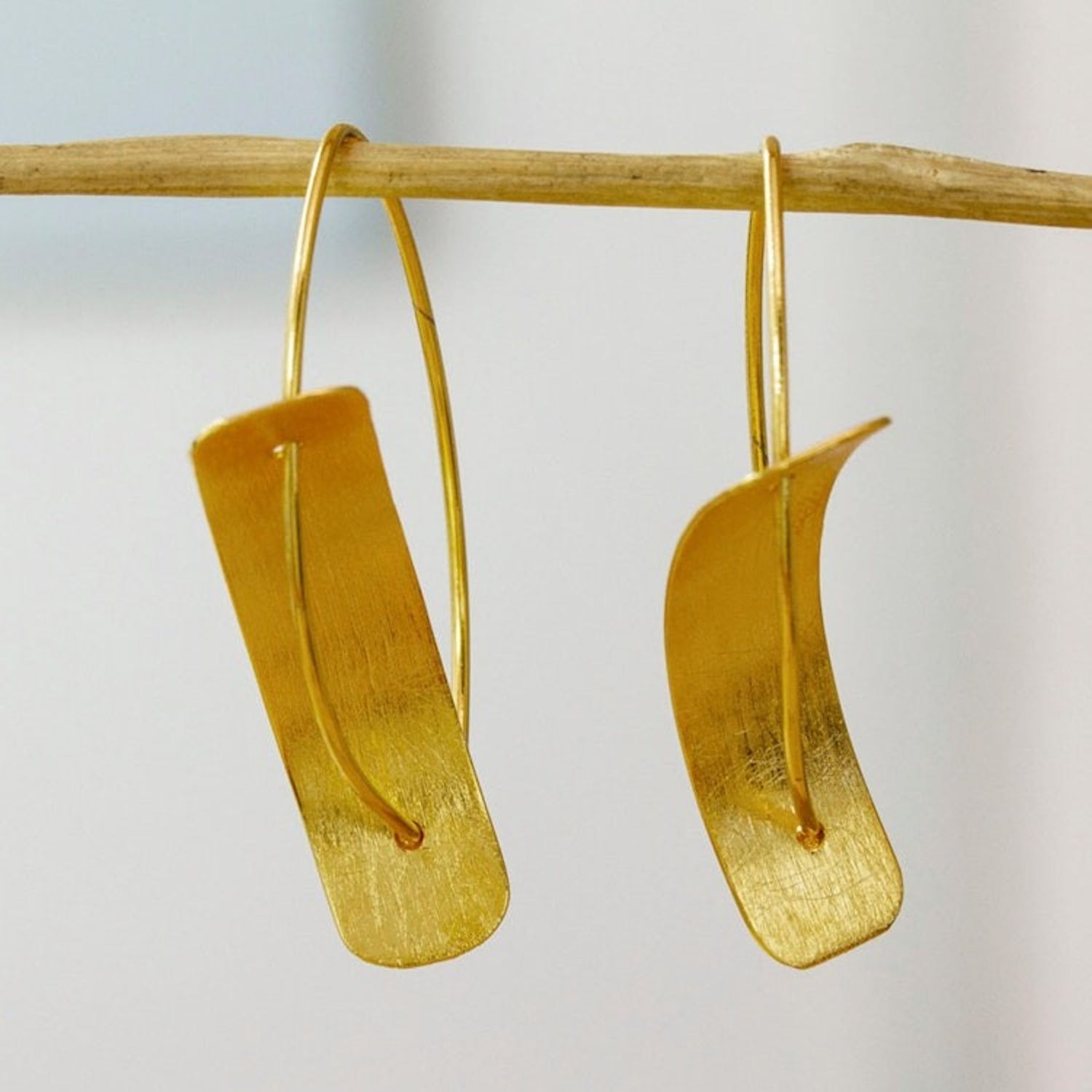 Handcrafted in Mexico from 24k gold-plated zinc with a high-polish finish. The earrings feature hook earrings and measure 1.8 inches L x 1.4 inches W.