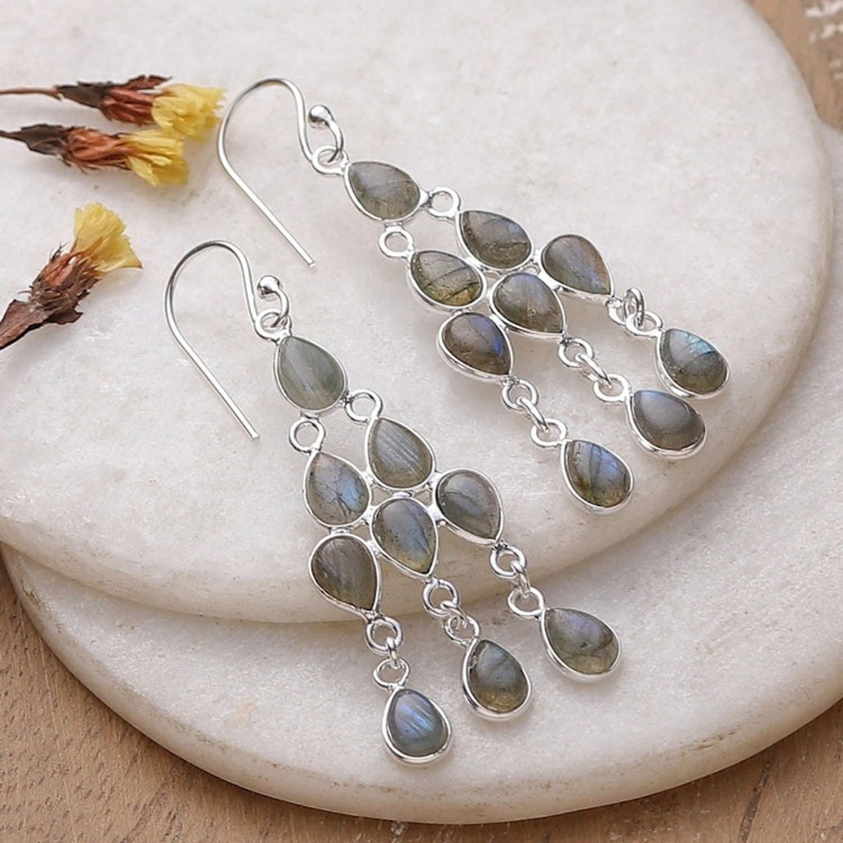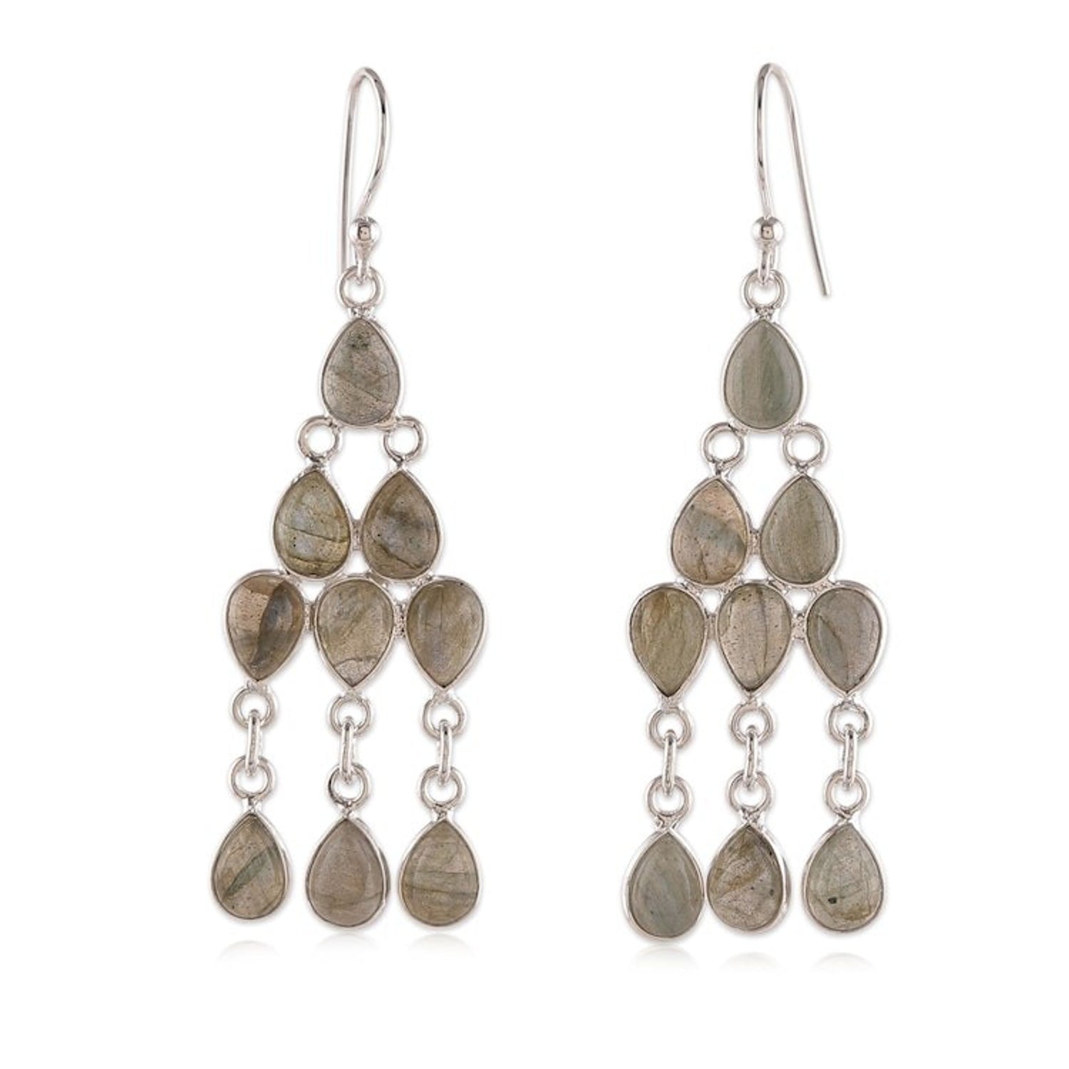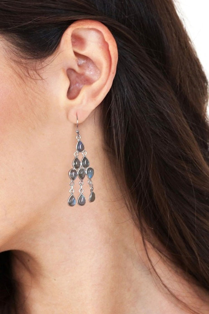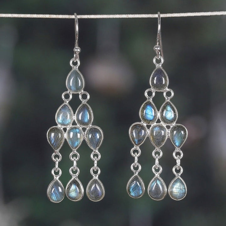 Polished Natural Labradorite Cabochon Chandelier Earrings 'Mystic Cascade' These 'Mystic Cascade' chandelier earrings by Indian designer Neetu Barathi are brought to life by labradorite cabochons that compose a cascade of mystic and captivating hues. Set in sterling silver, the gemstones catch the light inside this enigmatic design.
