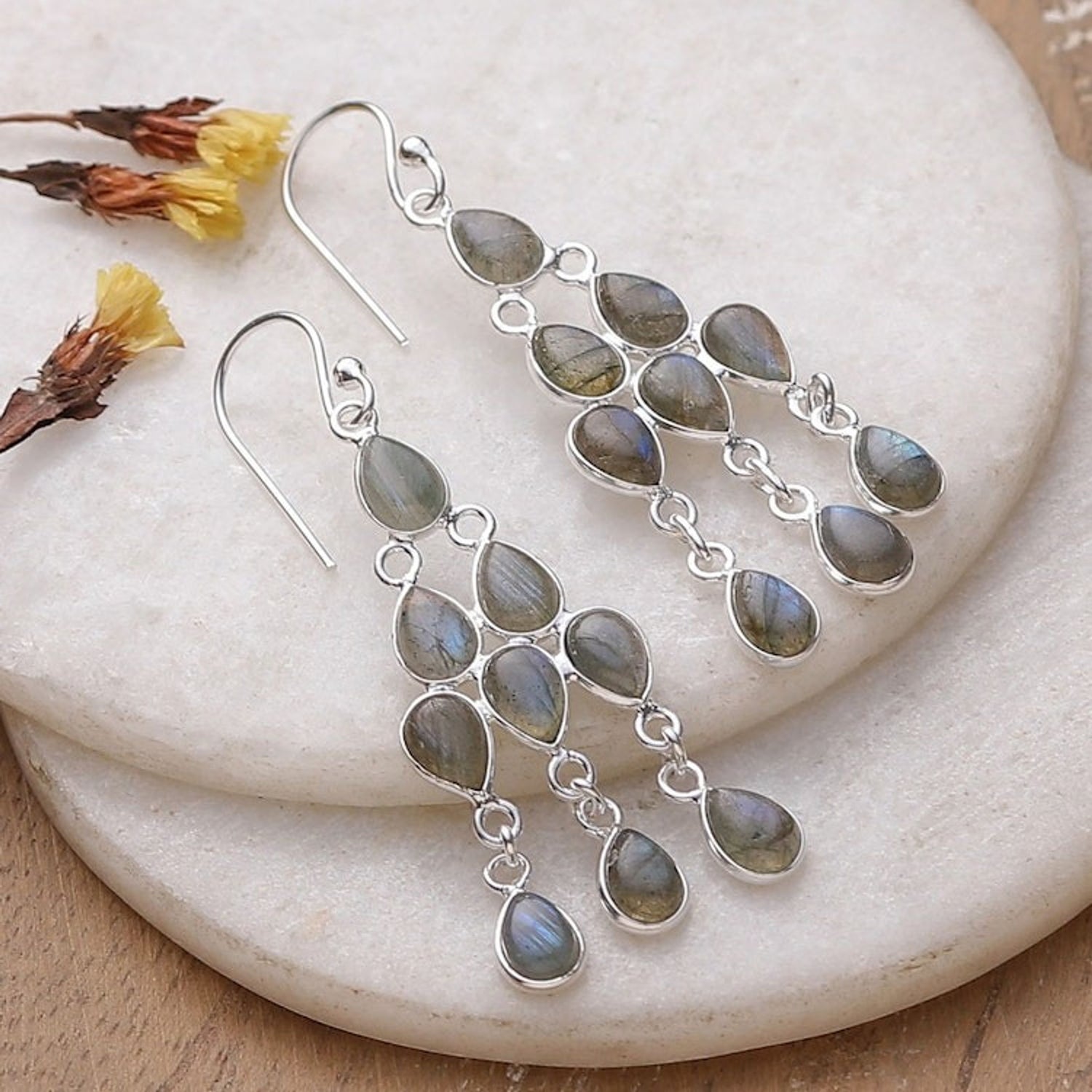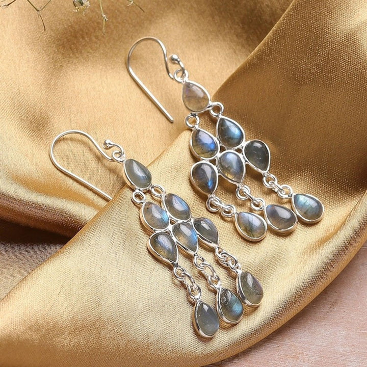 Polished Natural Labradorite Cabochon Chandelier Earrings 'Mystic Cascade'