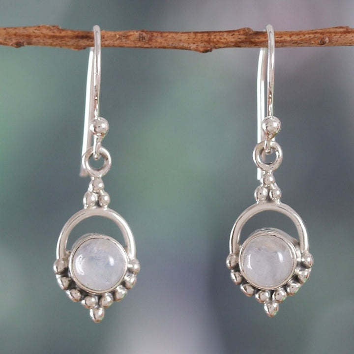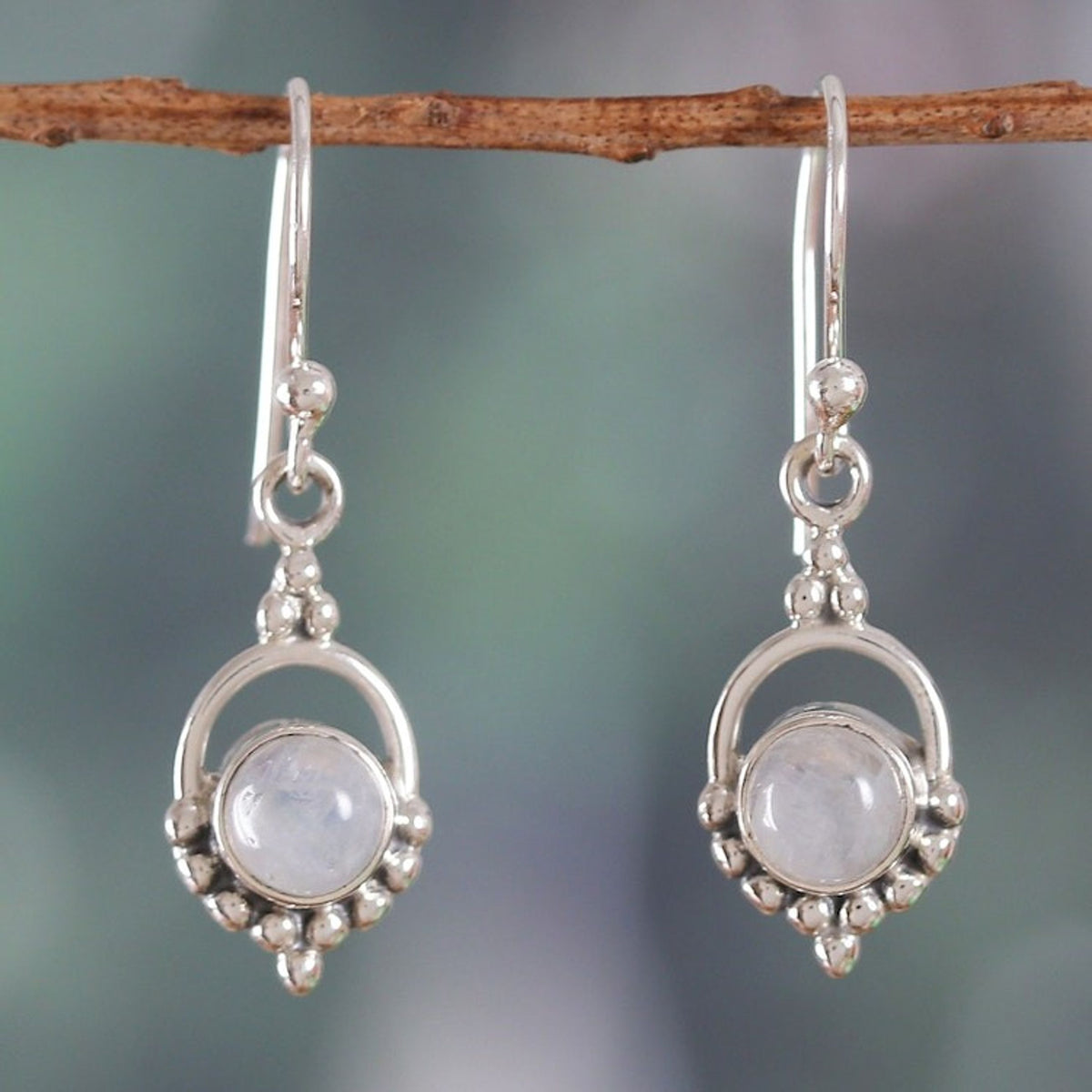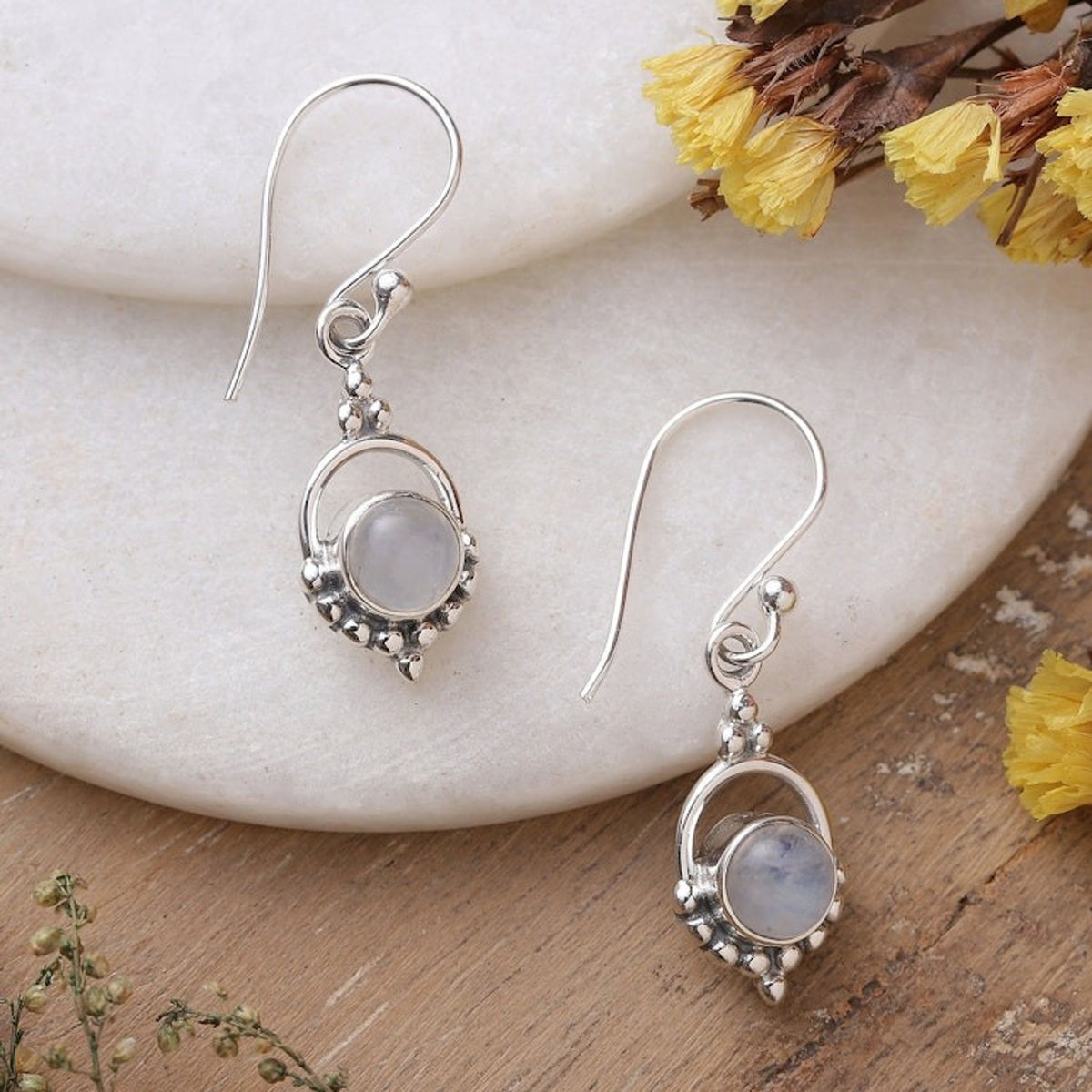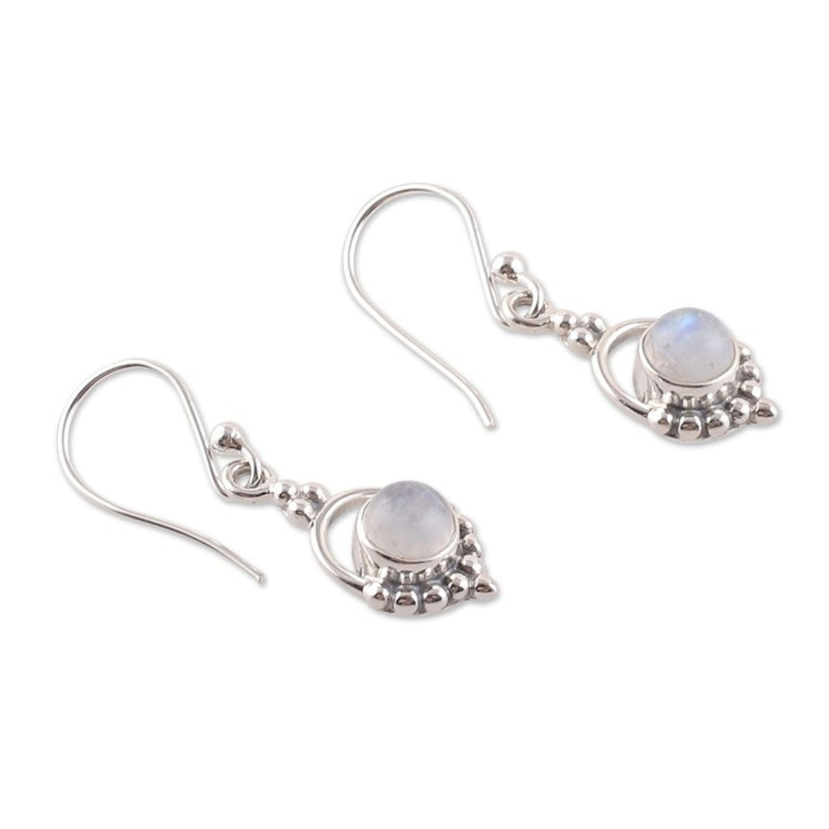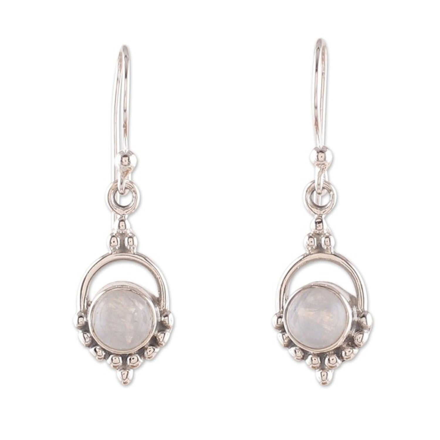 Polished Natural Rainbow Moonstone Dangle Earrings 'Ethereal Allure' These 'Ethereal Allure' dangle earrings by Indian designer Narayani boast the beauty of natural rainbow moonstones, symbolizing harmony. The sterling silver design features a polished finish and classic accents that exude heavenly vibes, complementing the gems' ethereal charm.