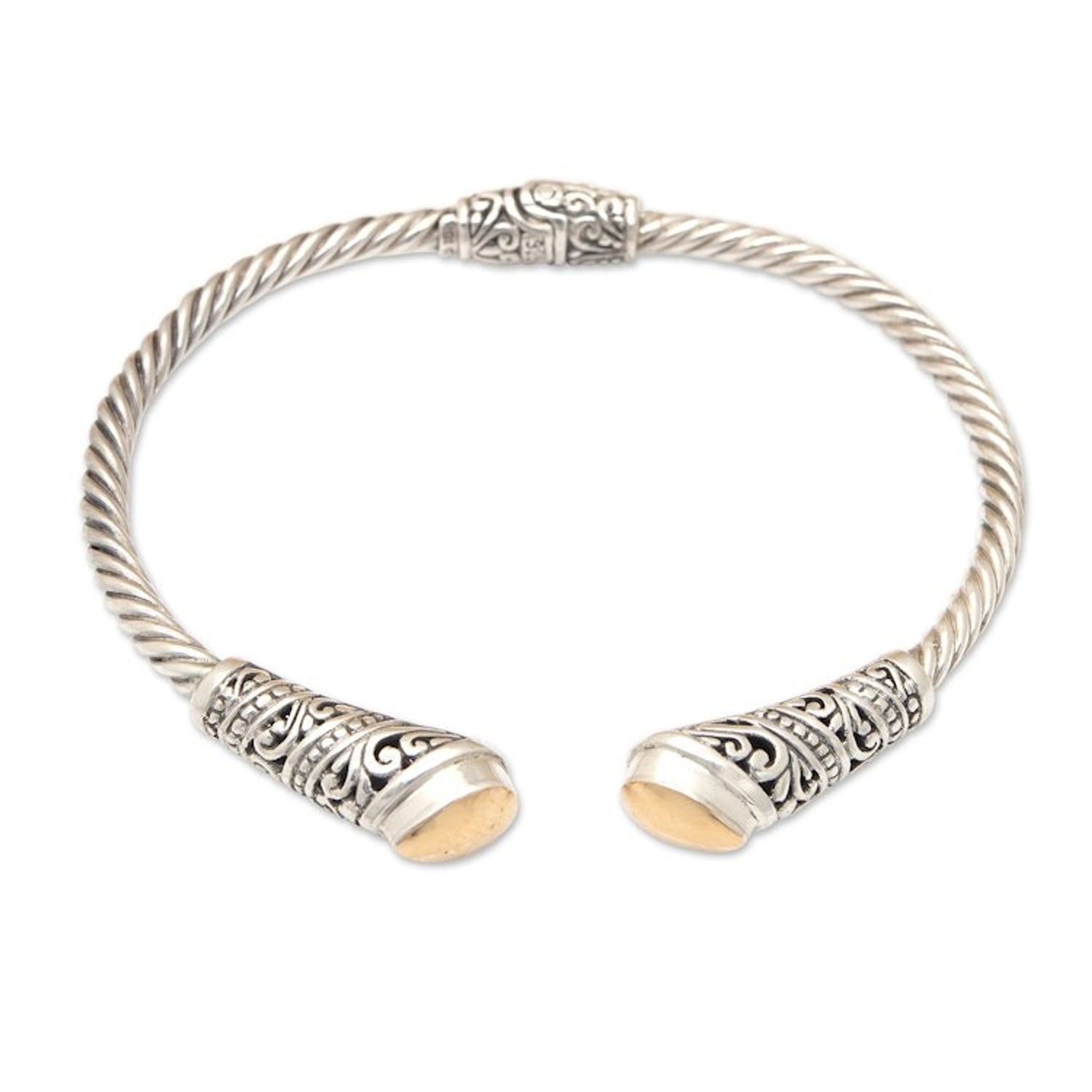 Polished Sterling Silver Cuff Bracelet with Gold Accents 'Gianyar's Soul' This 'Gianyar's Soul' sterling silver cuff bracelet by Balinese artisan Made Suyana captures the elegant essence of Gianyar. The accessory features traditional regional motifs in a polished finish and comes with 18k gold-plated accents that create a radiant aura around the piece.