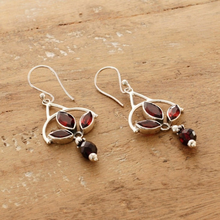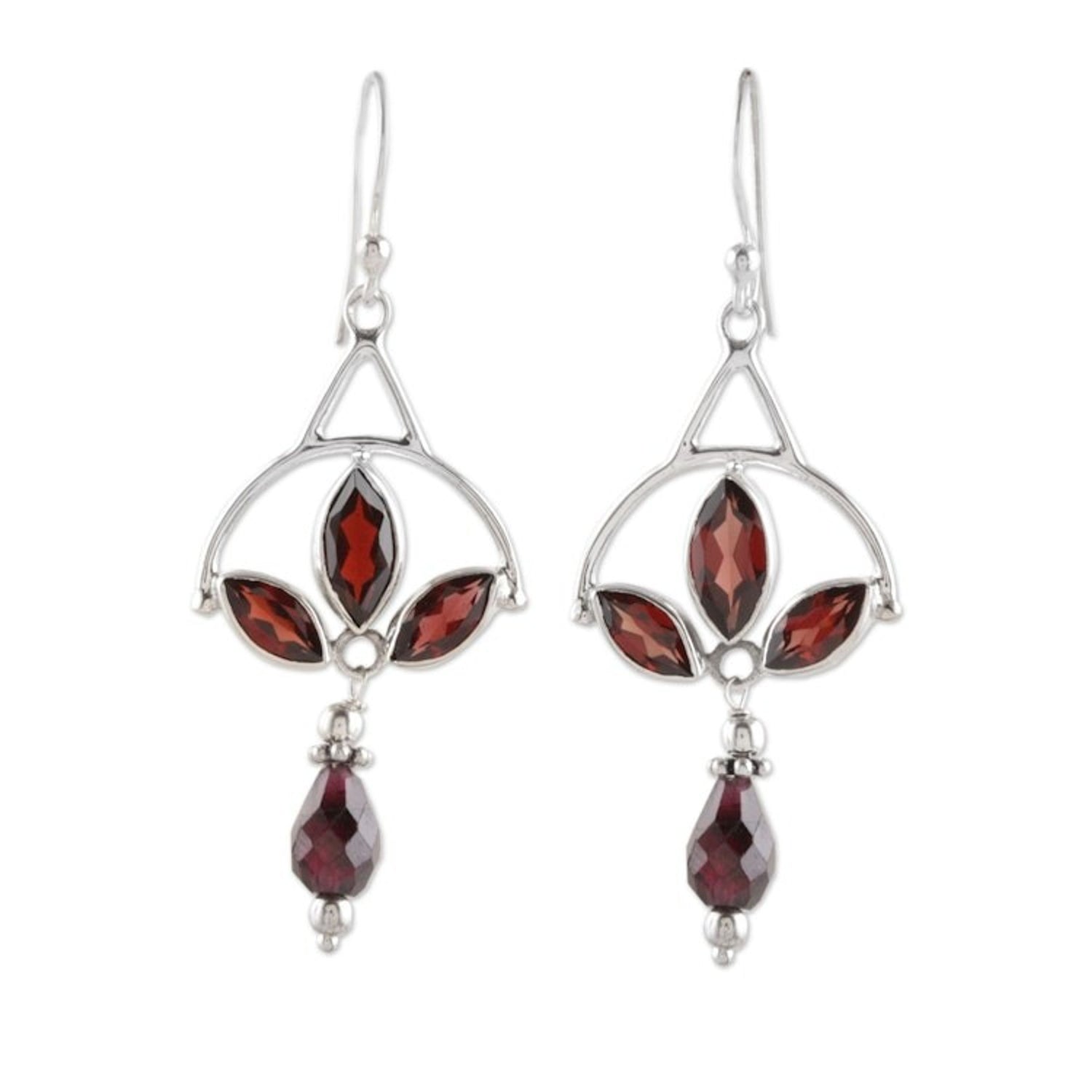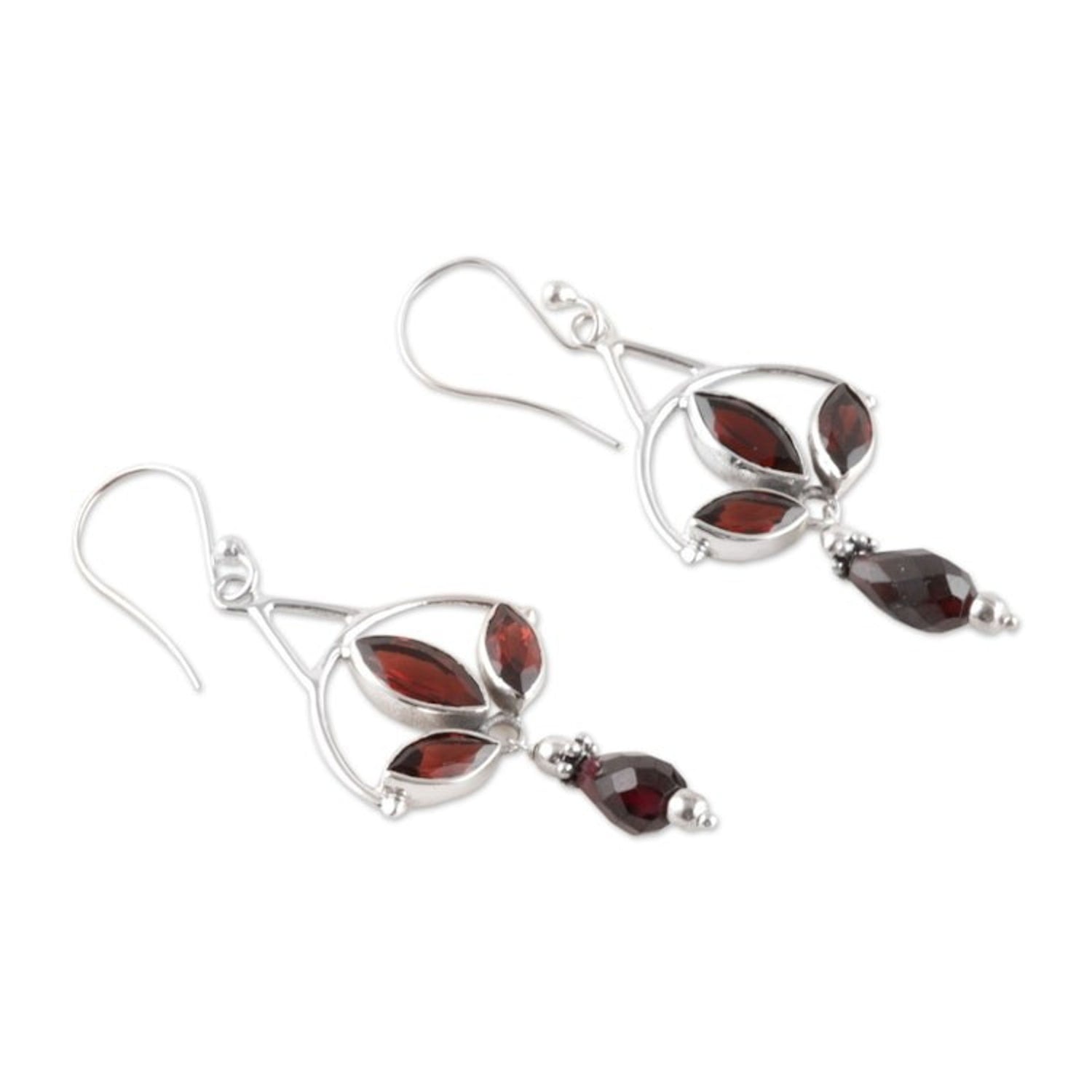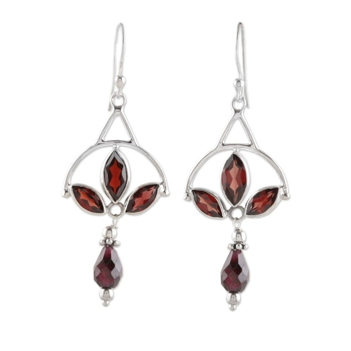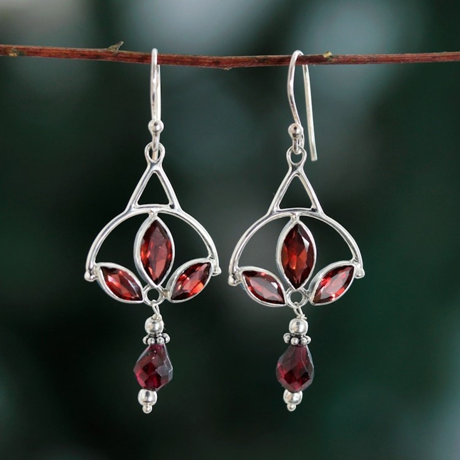 Polished Sterling Silver Dangle Earrings with Garnet Stones 'Enthralling Red' These 'Enthralling Red' dangle earrings by Indian designer Narayani feature garnet as the absolute protagonist. The vibrant gemstones, in beads and also marquise-shaped encased in bezels, beautifully decorate a polished sterling silver frame in this exquisite design.