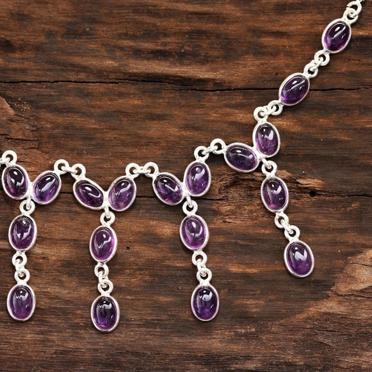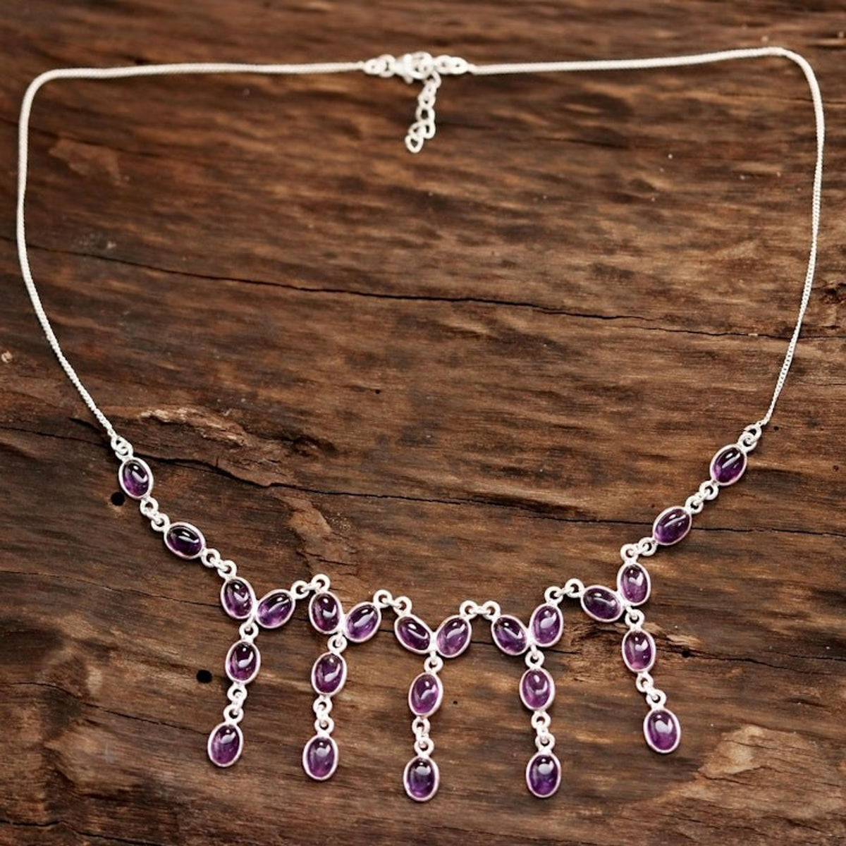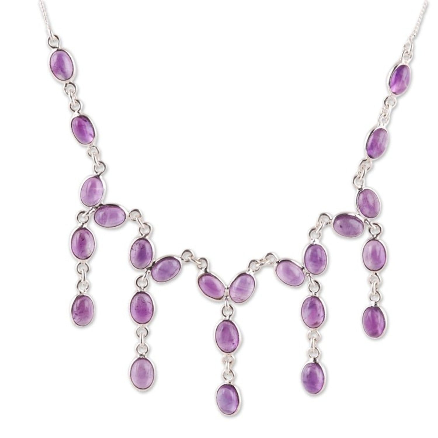 Purple Amethyst Waterfall Necklace from India 'Luxurious Luster' This 'Luxurious Luster' necklace by Indian artisan Alok Jain presents the enthralling beauty of a regal glow. A waterfall of amethyst gemstones trickles down from a sterling silver chain that gleams in the light.
