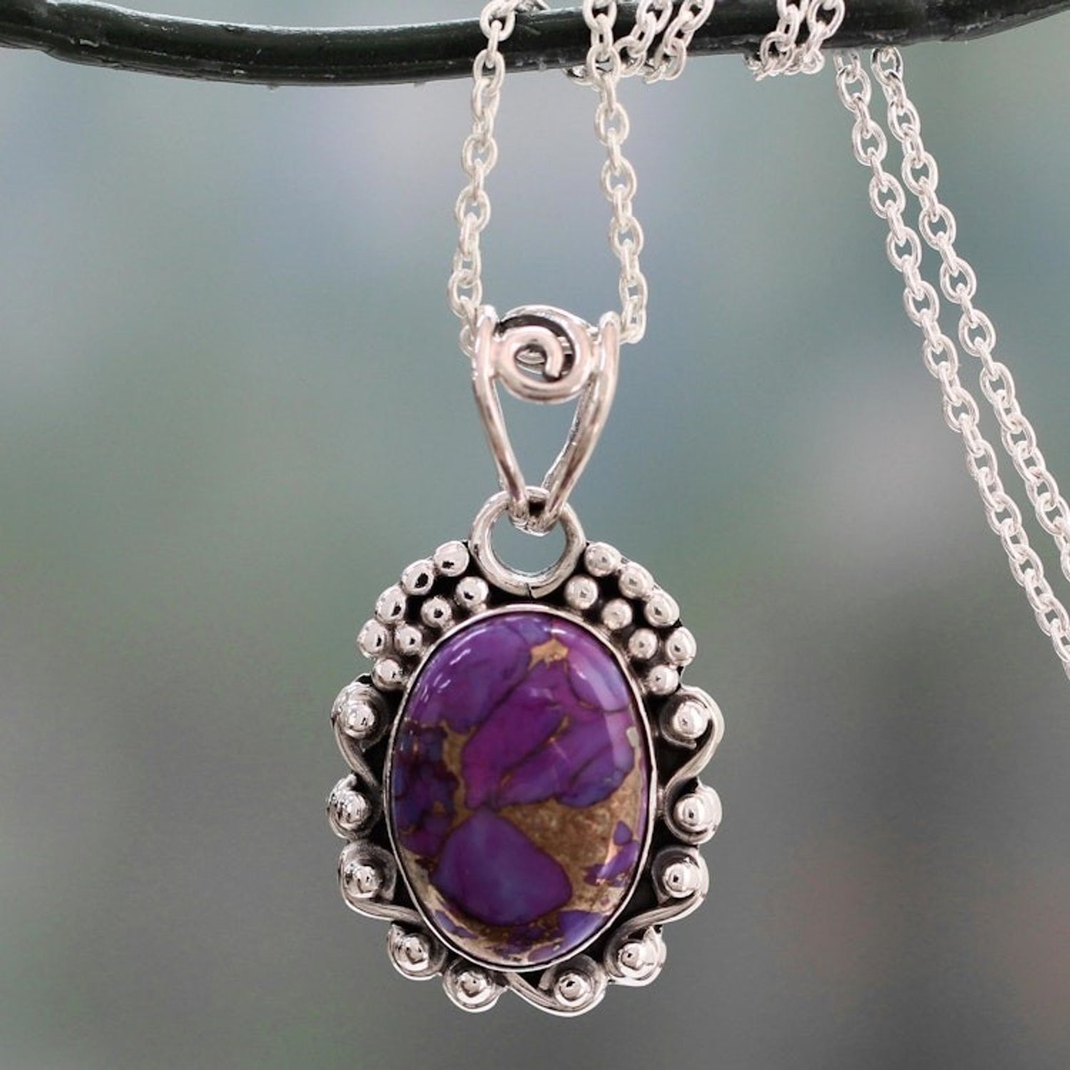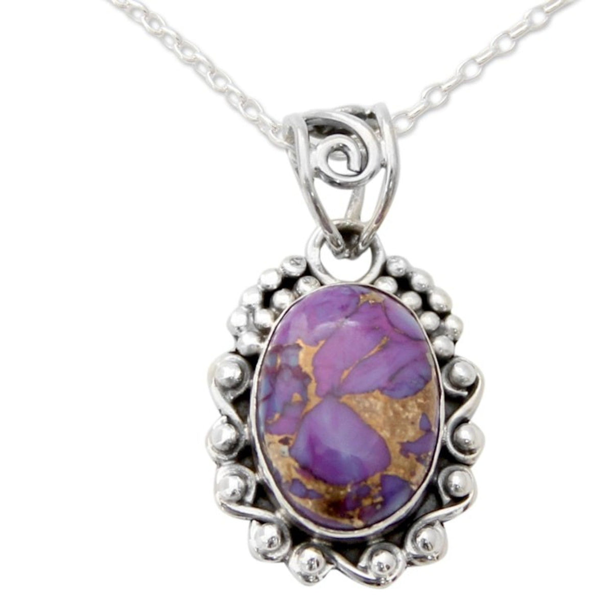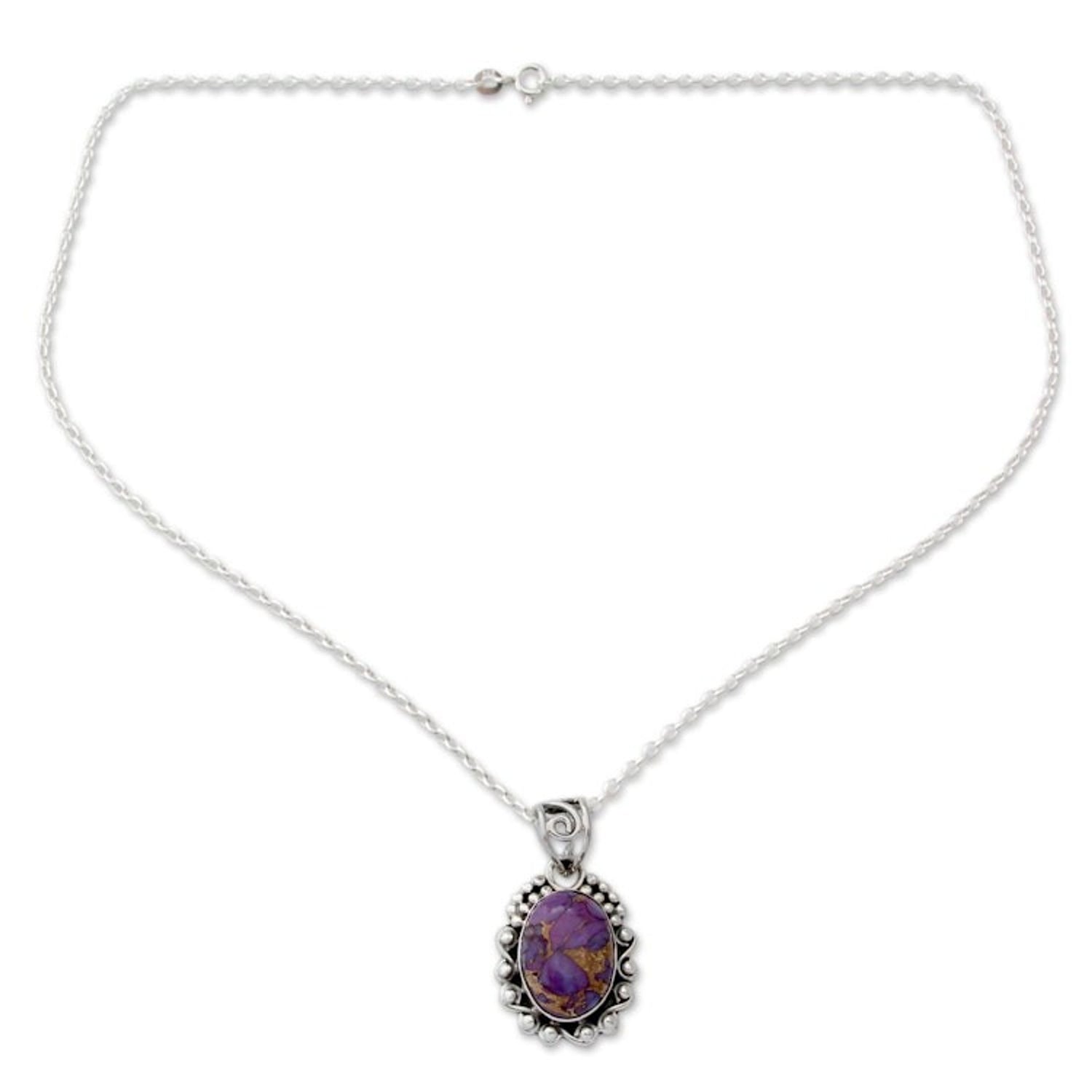Purple Composite Turquoise Necklace in Sterling Silver 'Purple Heavens' This 'Purple Heavens' necklace from Indian artisan Aparna features a rich purple gem shot through with golden streaks of copper. The composite turquoise stone is set in a sterling silver setting with bead and wire details and centered on a cable chain.
