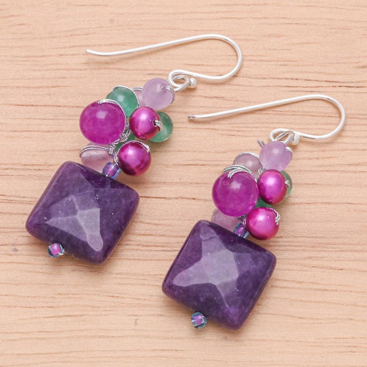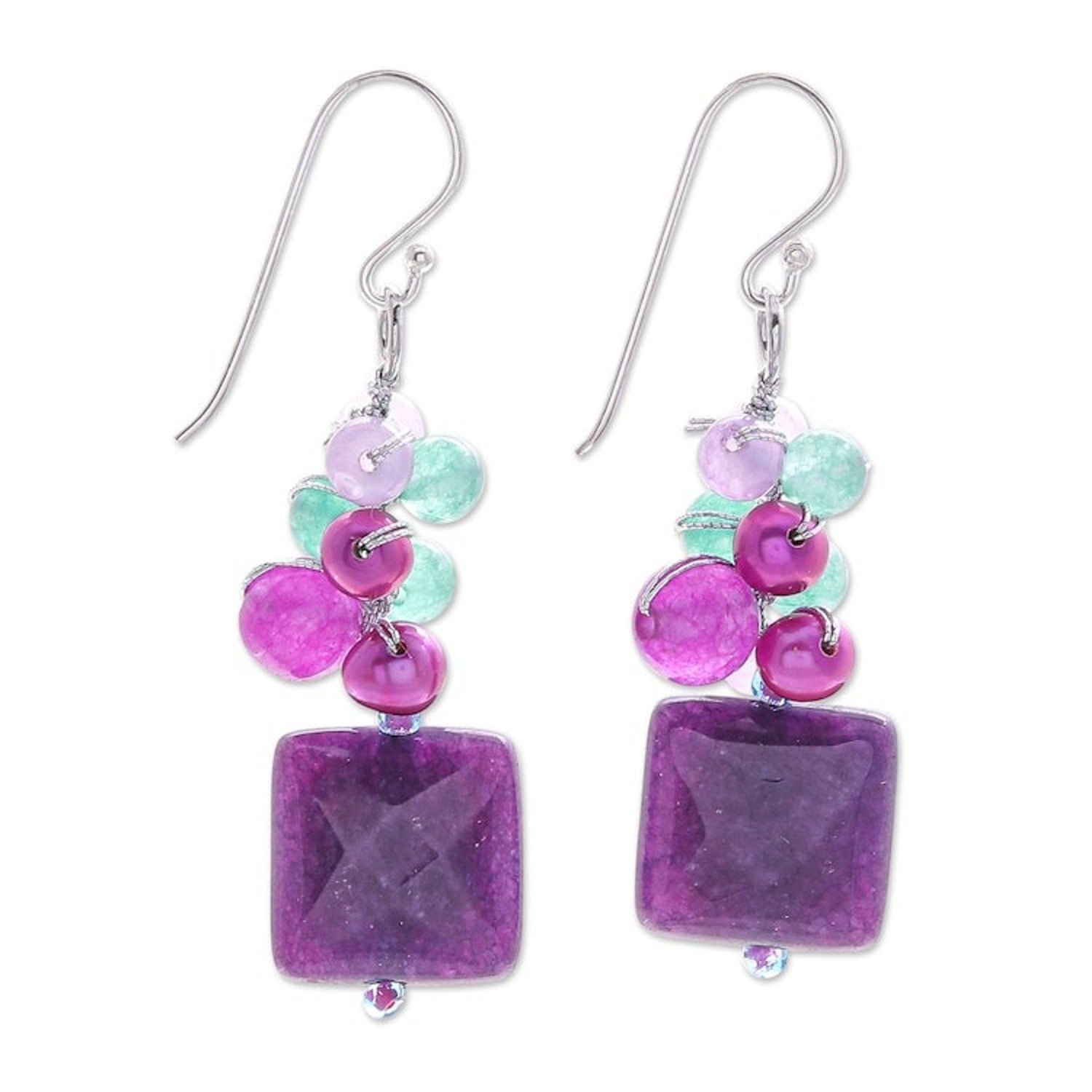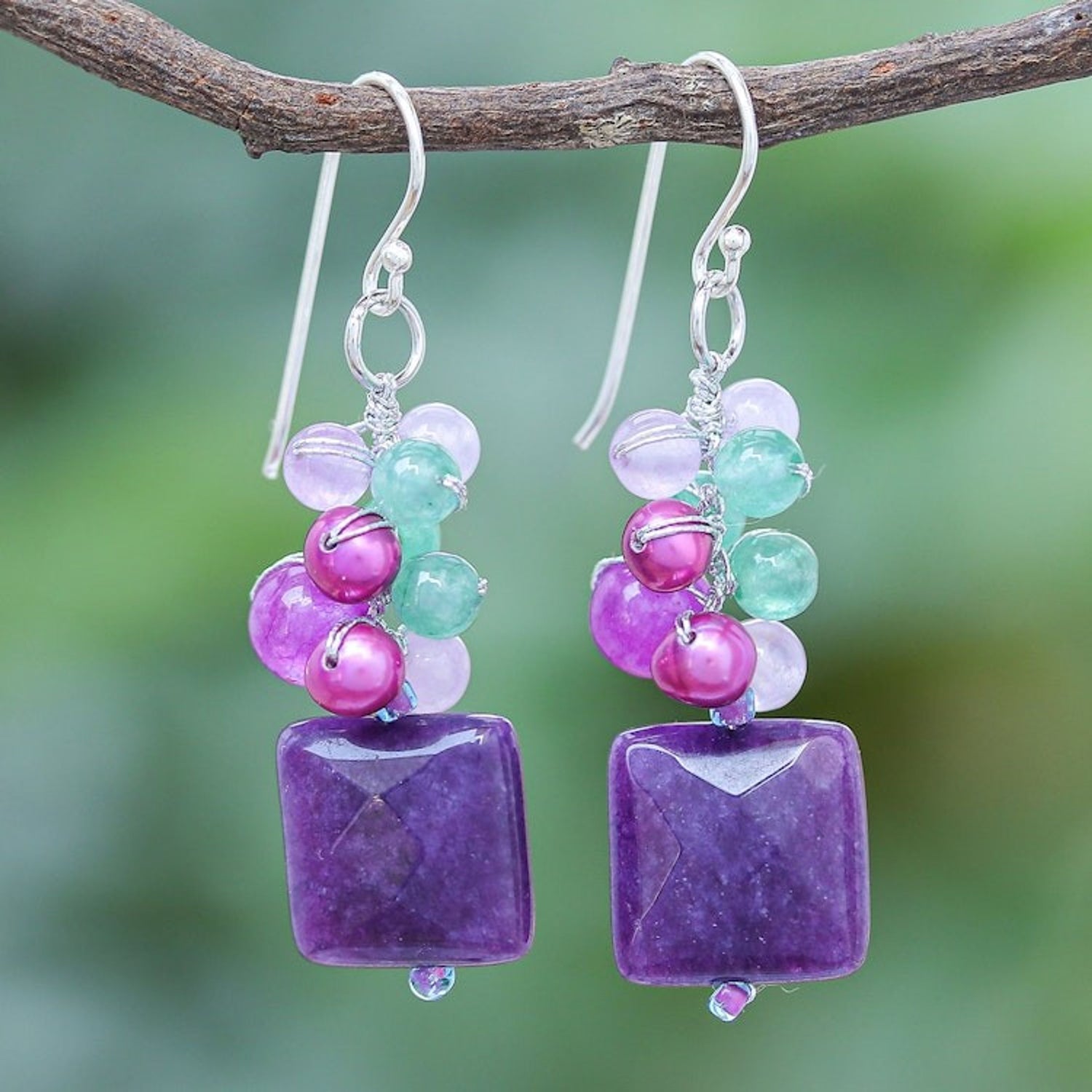 These Purple Quartz and Cultured Pearl Dangle Earrings 'Full of Dreams' by Independent Artisans are a whimsical and charming creation. Thai artisan Nareerat masterfully combines candy-colored quartz and cultured freshwater pearls, suspended on delicate silk thread. The soft pink pearls and pale purple and green quartz gems evoke a feeling of pure joy and playful elegance. Finished with sterling silver hooks, these earrings are a perfect blend of sweet sophistication and dream-like beauty, ideal for adding a touch of lighthearted color to your day.