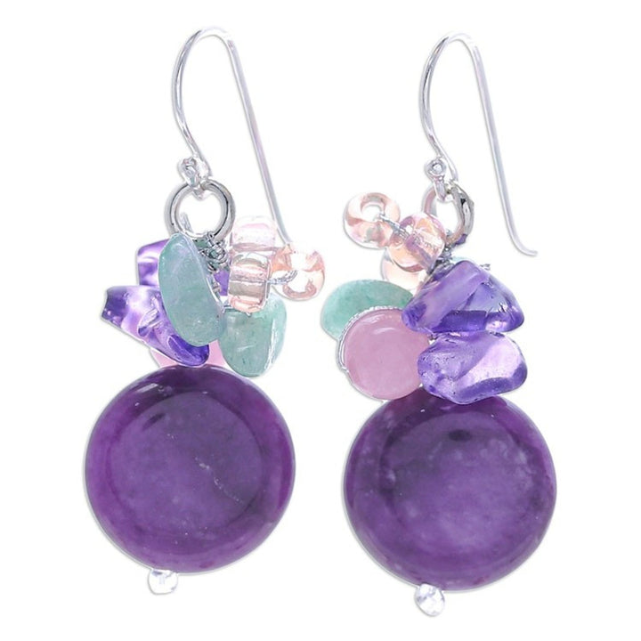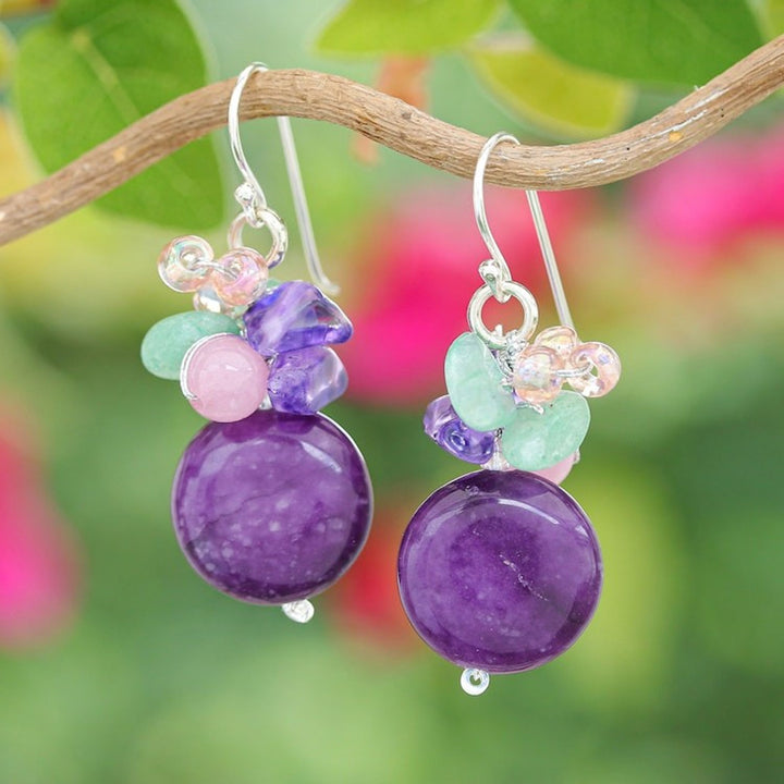 These Purple Quartz Glass and Resin Beaded Cluster Earrings 'Purple Perfect' by Independent Artisans are a vibrant and dynamic accessory designed to make a statement. Thai artisan Nareerat expertly combines quartz, glass, and resin beads into a lively cluster that promises to elevate any look with a pop of color. The rich purple tones are beautifully accented by golden metallic thread and polished sterling silver hooks, creating a harmonious balance of texture and shine that’s simply perfect for any occasion.