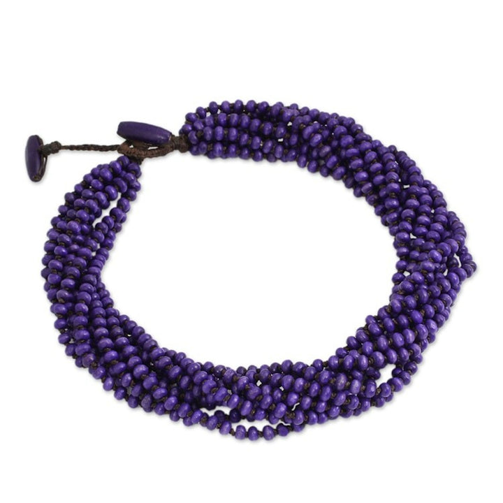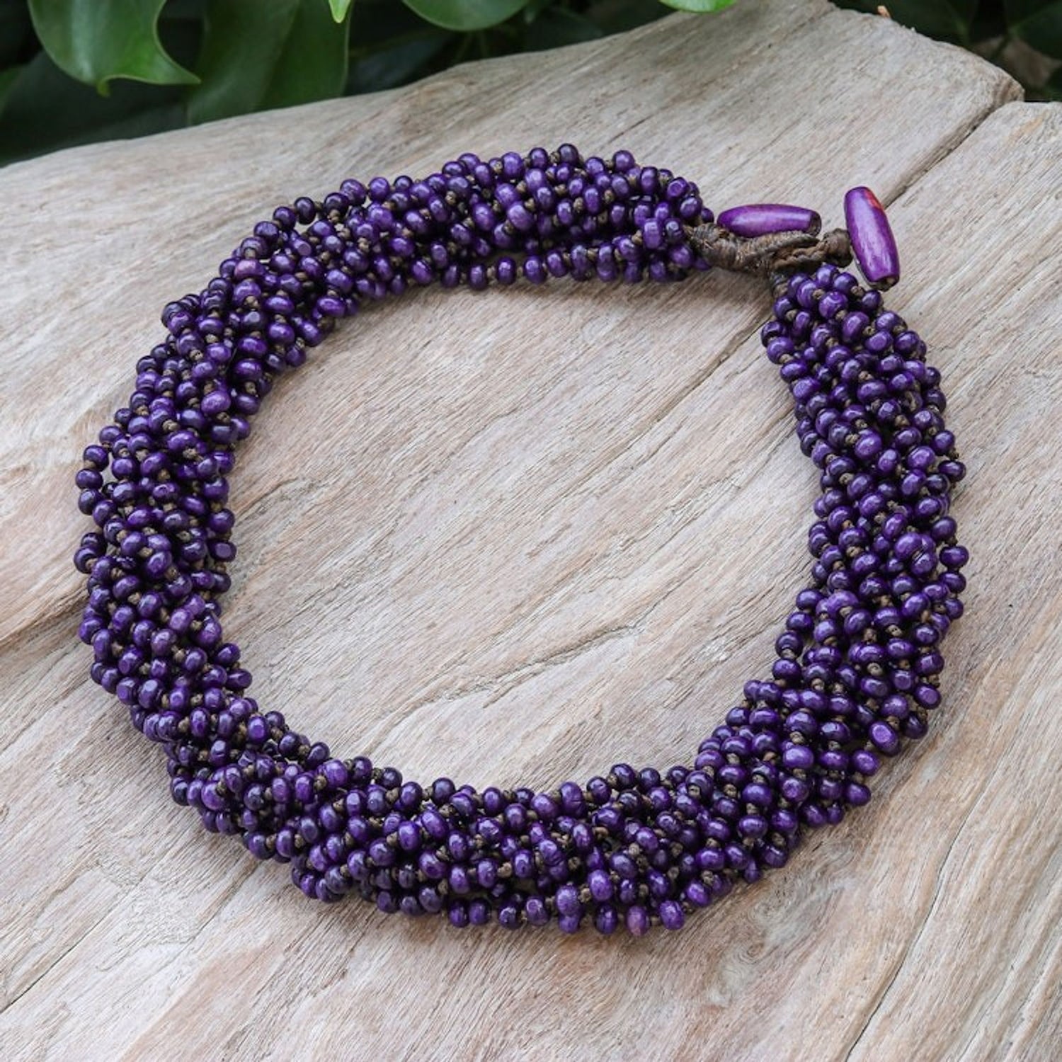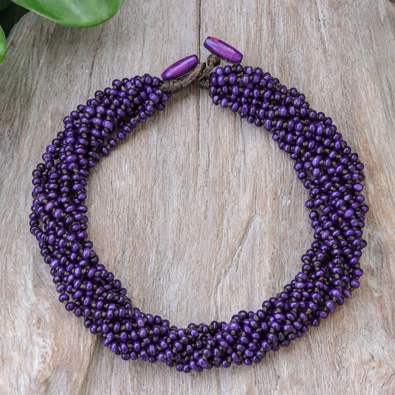 This Purple Torsade Necklace Wood Beaded Jewelry 'Nan Belle' by Independent Artisans is a beautiful celebration of simple, natural materials transformed by hand into a stunning accessory. Thai artisan Sumalee Nawakul hand-knots ten strands of dyed littleleaf boxwood beads, twisting them into a captivating torsade design. The rich purple and brown tones create an earthy yet elegant palette, and the multi-strand twist adds a textural dimension that makes this necklace a standout piece. It's an ideal choice for a free-spirited, bohemian aesthetic.