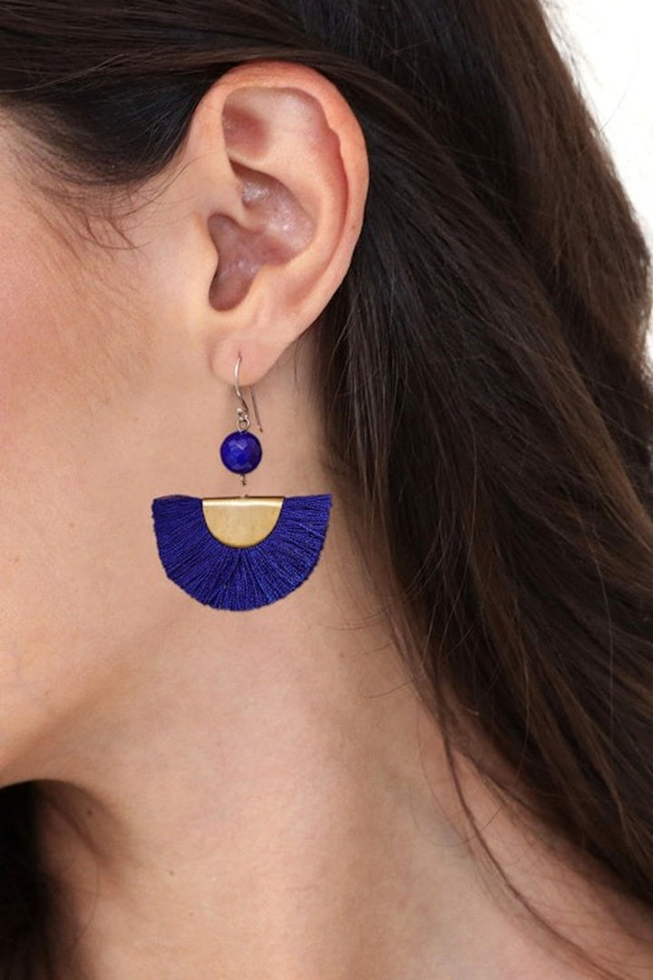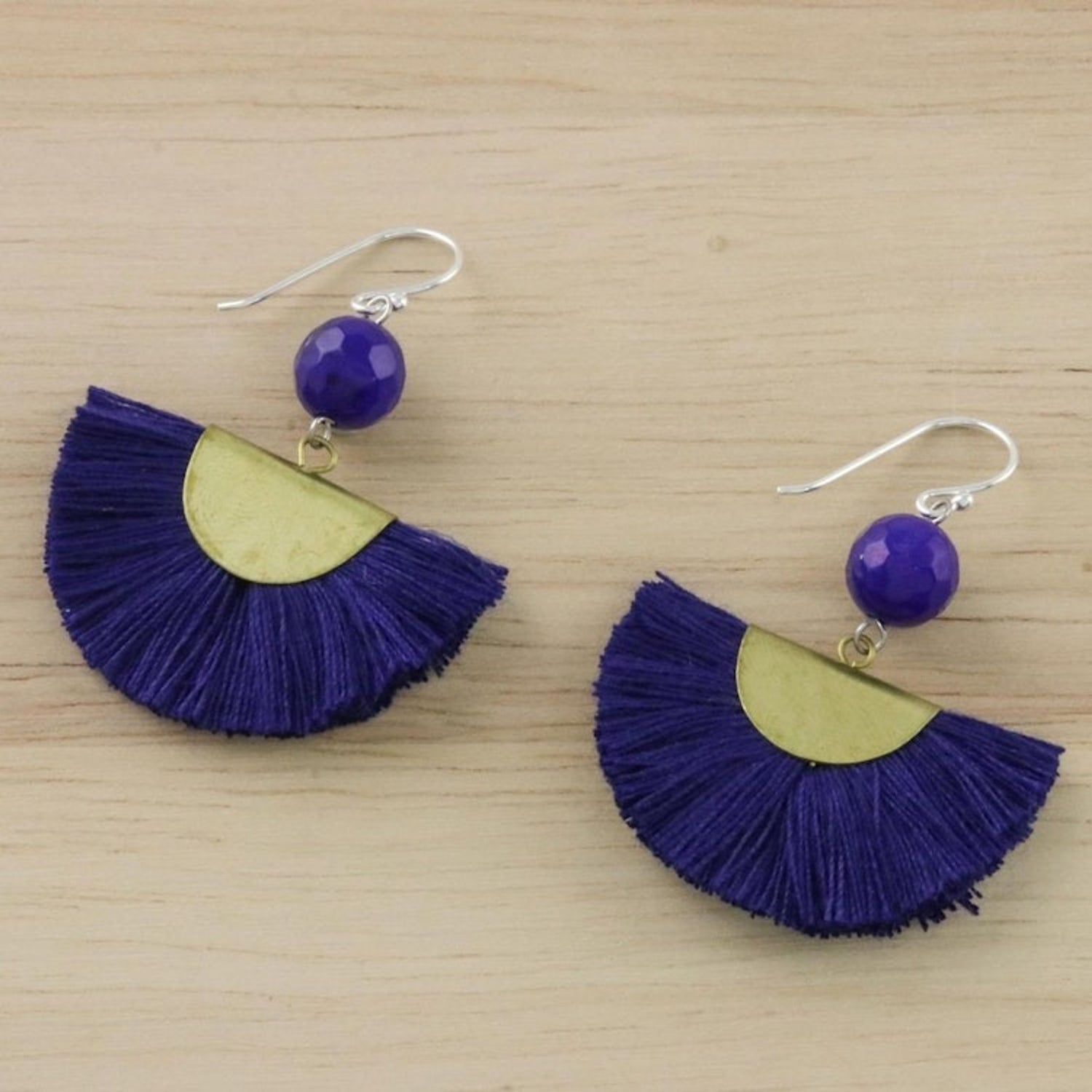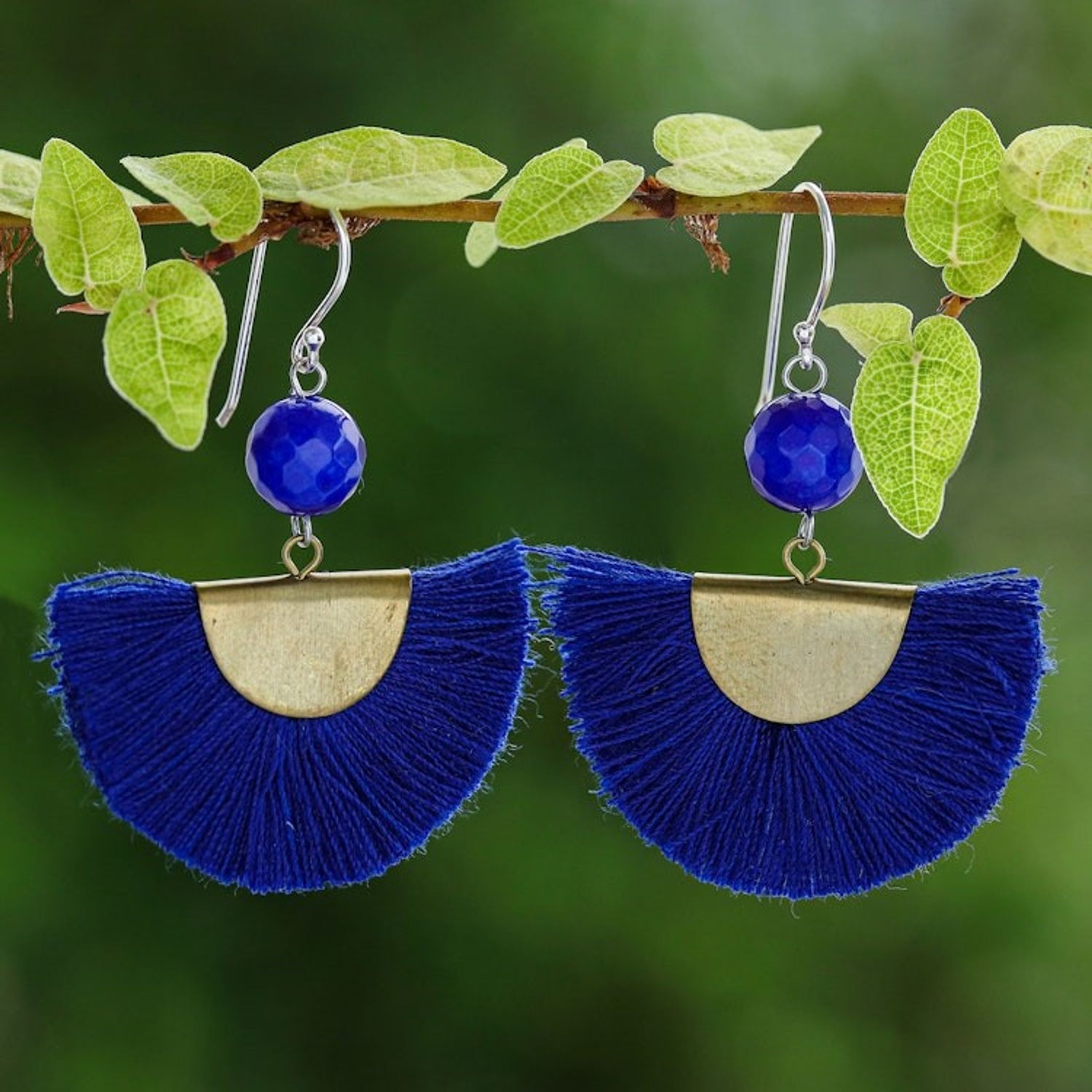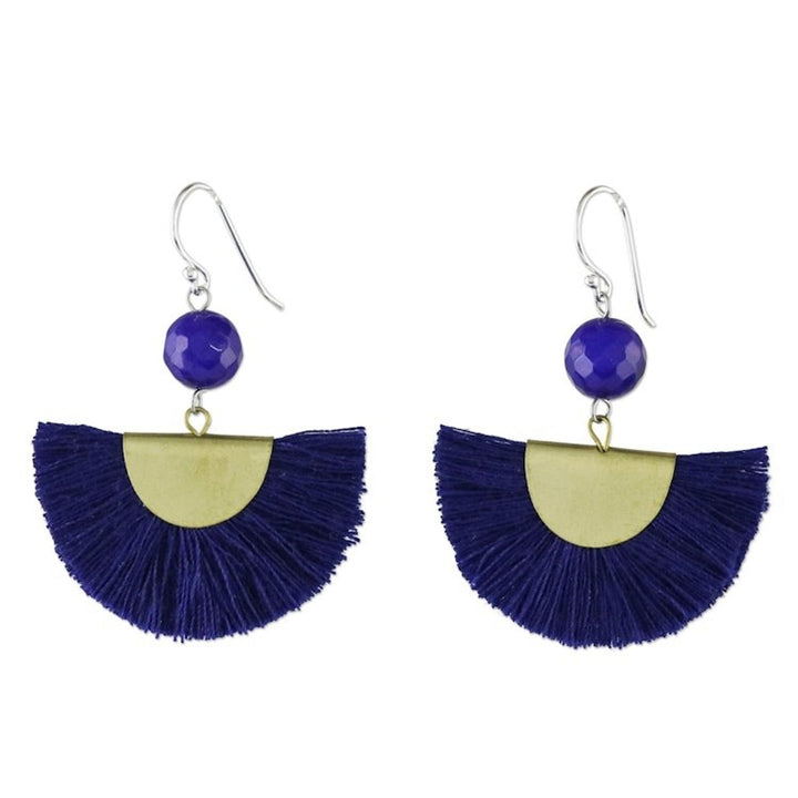 These Quartz and Brass Bead Dangle Earrings with Cotton Fringe 'Festival in Ultramarine' by Independent Artisans are a mesmerizing and dramatic accessory designed to capture attention. Thai artisan Nareerat expertly pairs an ultramarine quartz bead with a semi-circular brass accent. The design is made even more striking by the lovely blue-violet cotton fringe that fans out below, giving the earrings a sense of elegant movement and artistic flair. These are the perfect earrings for adding a vibrant, bohemian touch to your look.