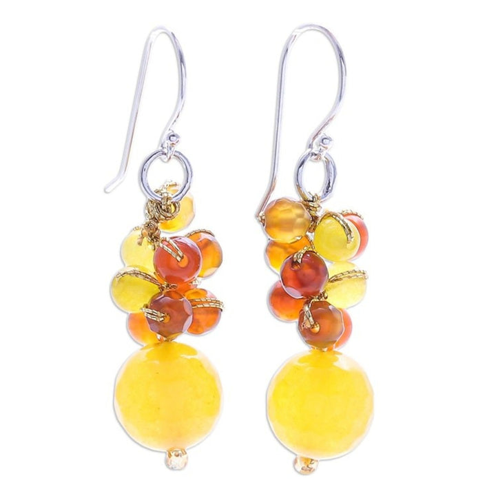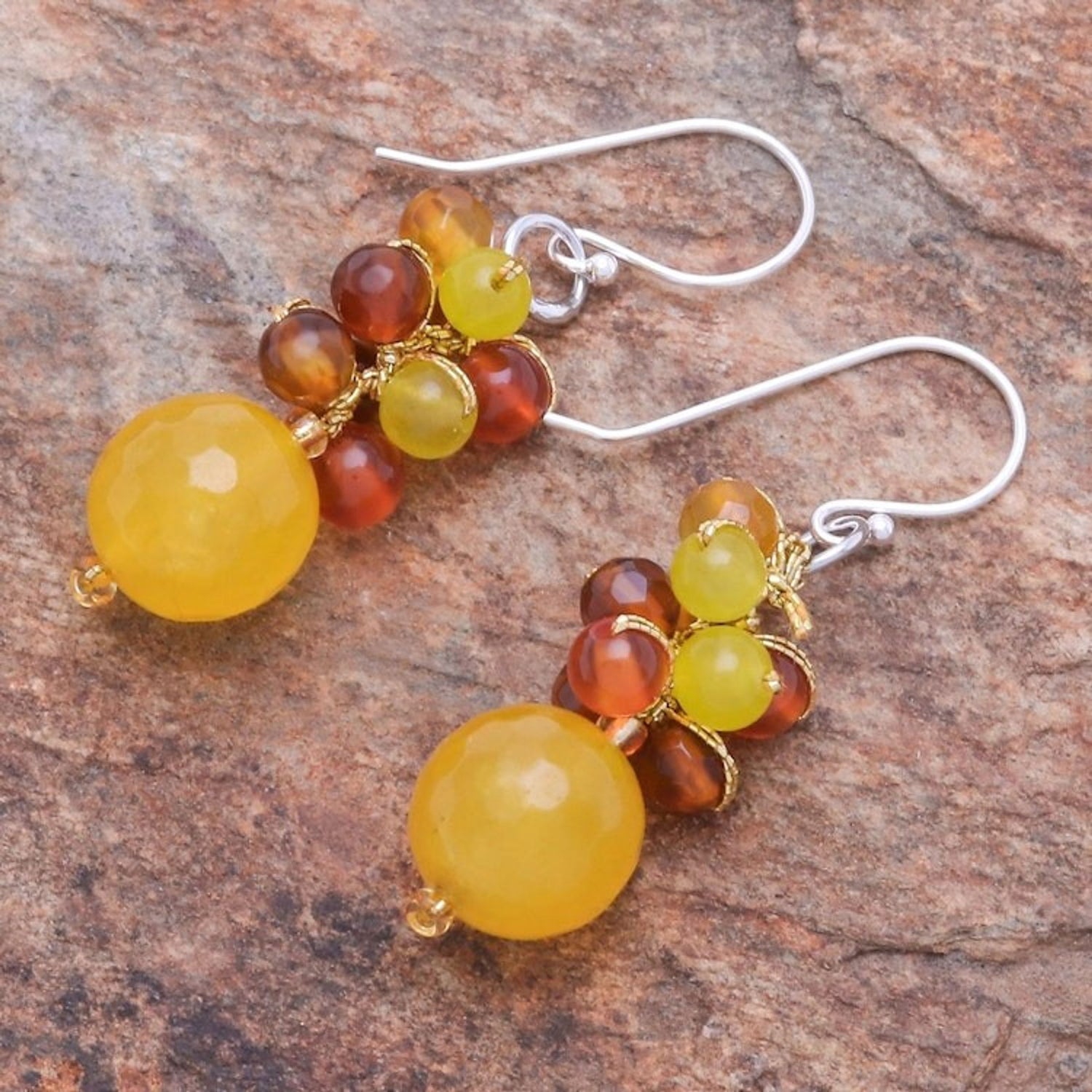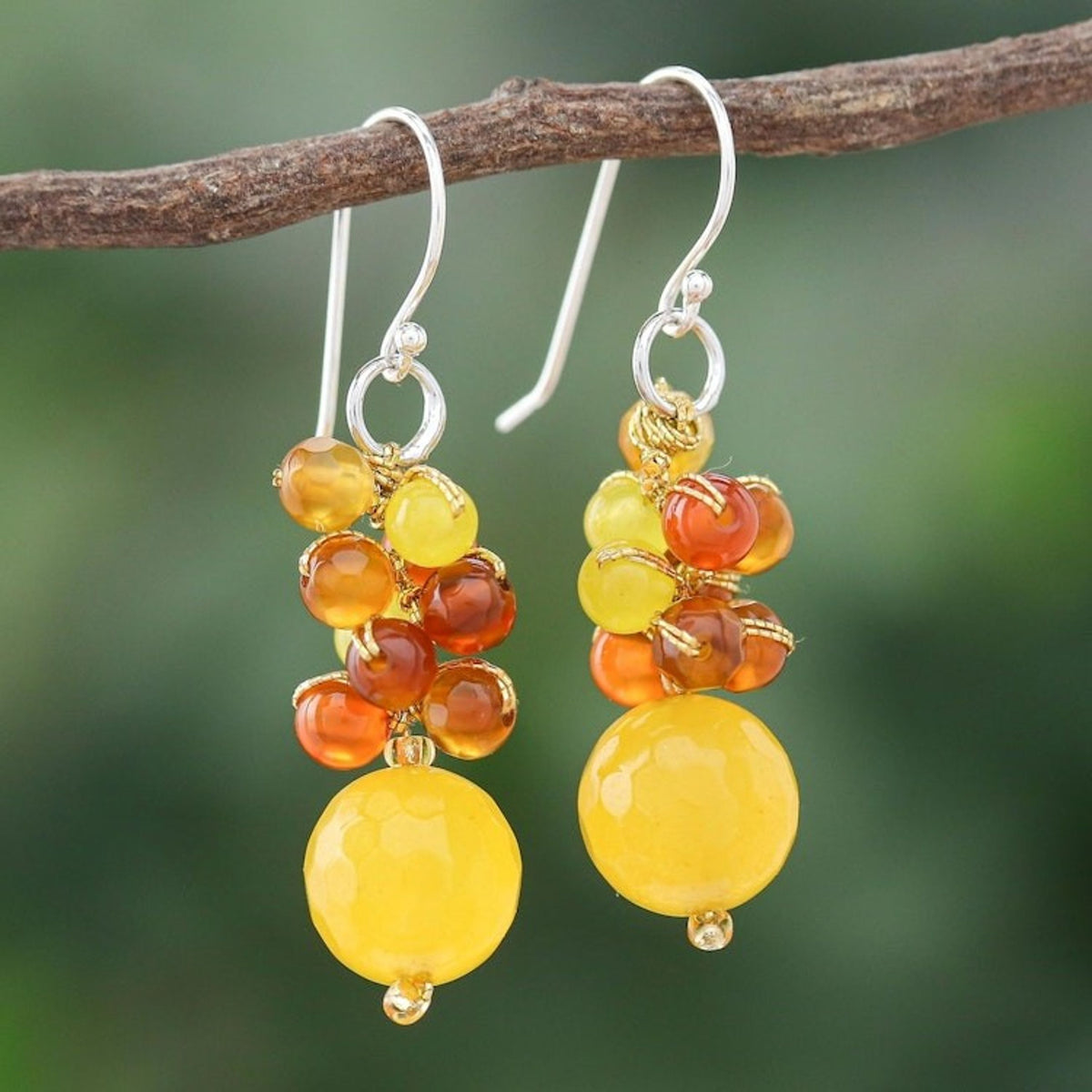 These Quartz and Carnelian Dangle Earrings 'Apricot Candy' by Independent Artisans are a bright and delightful accessory that feels as sweet as a summer's day. Thai artisan Nareerat hand-knots a vibrant cluster of carnelian and quartz beads with shimmering metallic thread, creating a rich and textural top. Below, a single faceted yellow quartz bead glows, swinging gracefully. These earrings are a charming and joyful way to bring a touch of sunshine and playful elegance to your style.