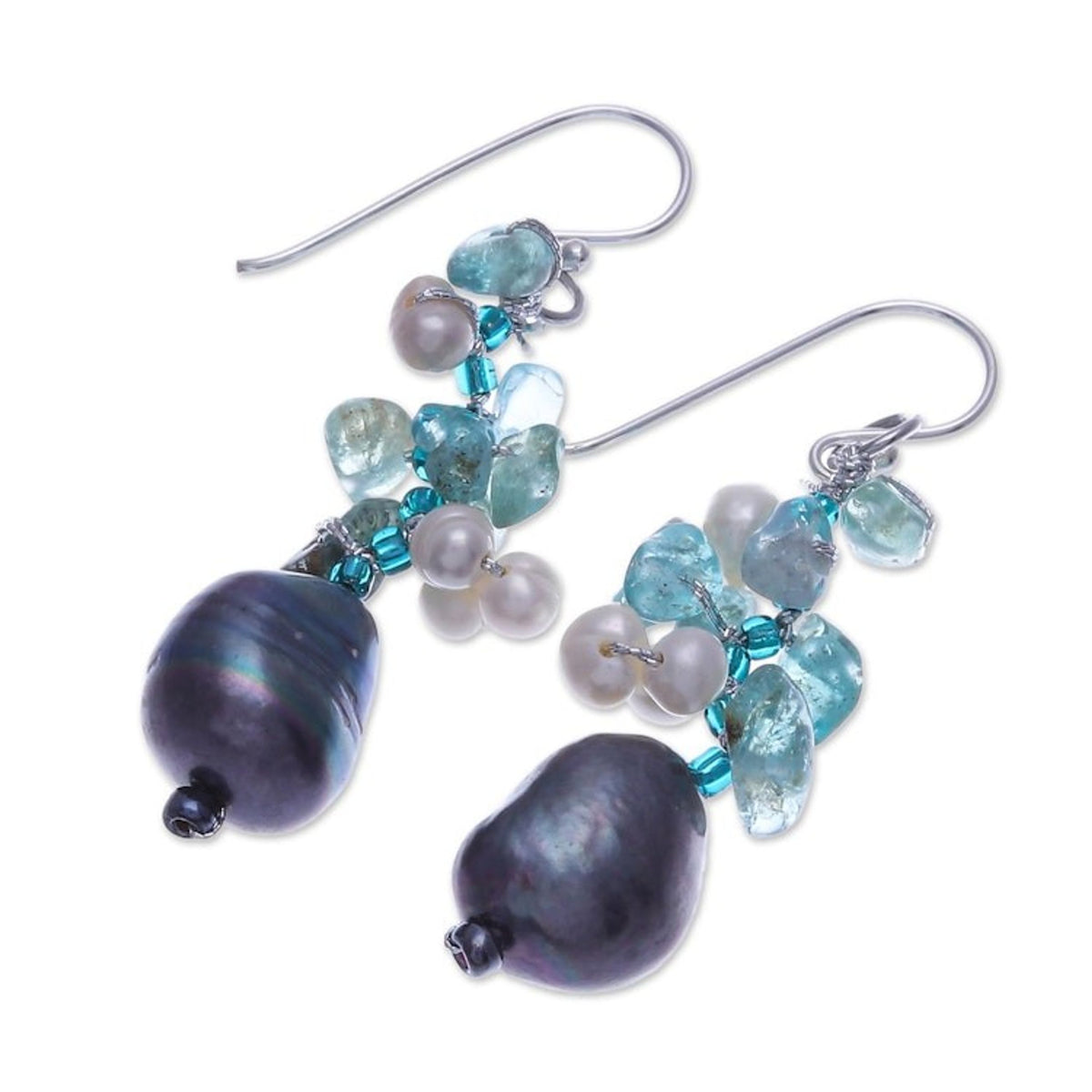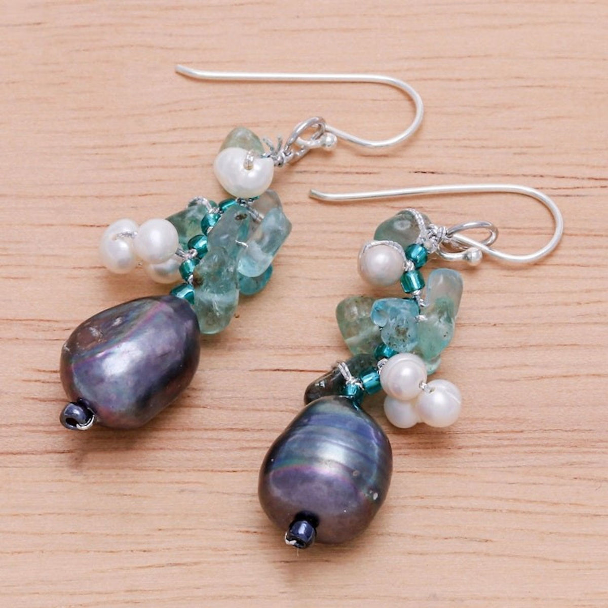 These Quartz and Cultured Pearl Cluster Earrings 'Arctic Pearl' by Independent Artisans are a radiant and elegant expression of Thai craftsmanship. Artisan Nareerat hand-knots shimmering metallic thread to create a luminous cluster of quartz, cultured pearls, and translucent glass beads. Suspended below this brilliant cascade, a single, dark gray pearl adds a dash of mysterious allure, creating a beautiful contrast. These earrings feel both fresh and timeless, perfect for elevating a minimalist style or complementing a more formal ensemble.