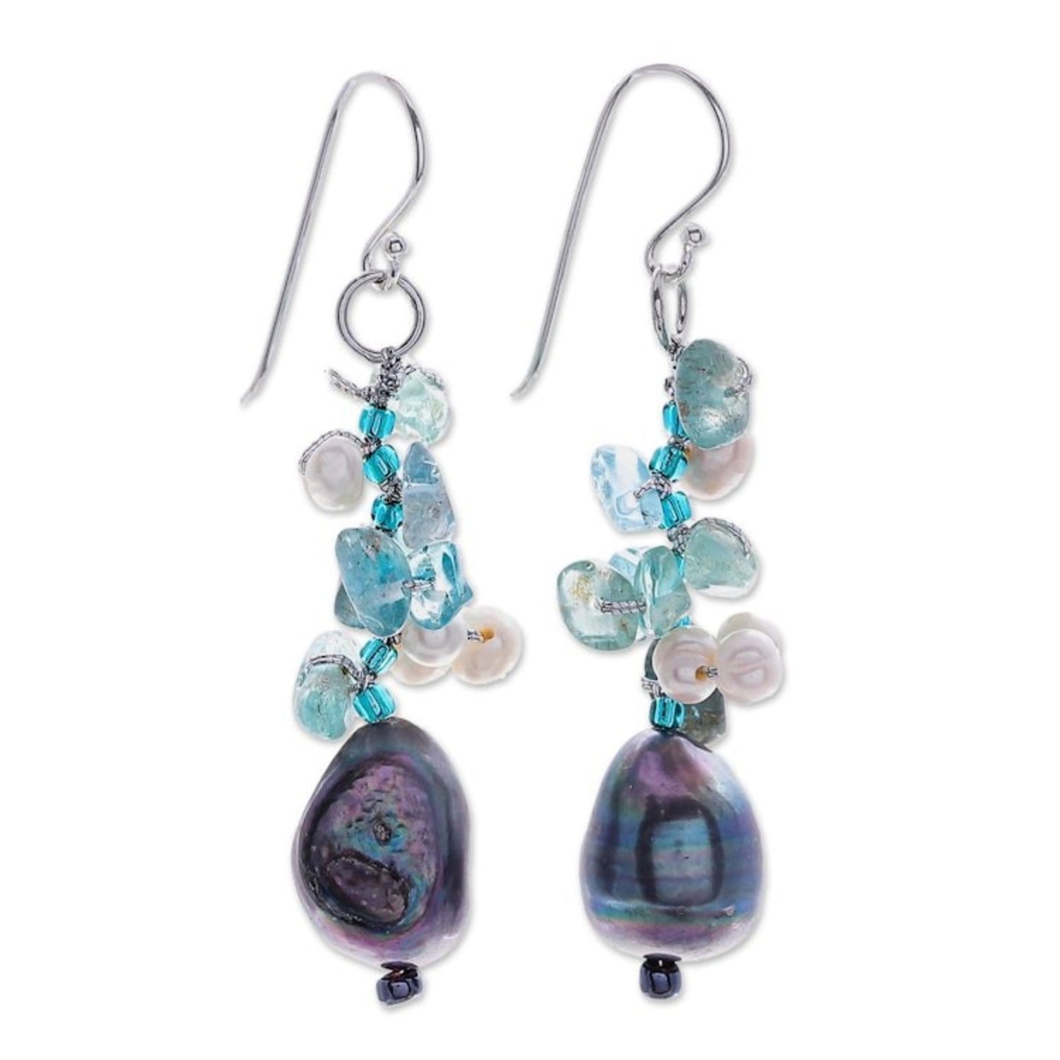 Handcrafted from quartz, cultured pearl, and glass beads with metallic thread and .925 sterling silver hooks, these earrings measure 1.9 inches L x 0.5 inches W and have a high-polish finish.