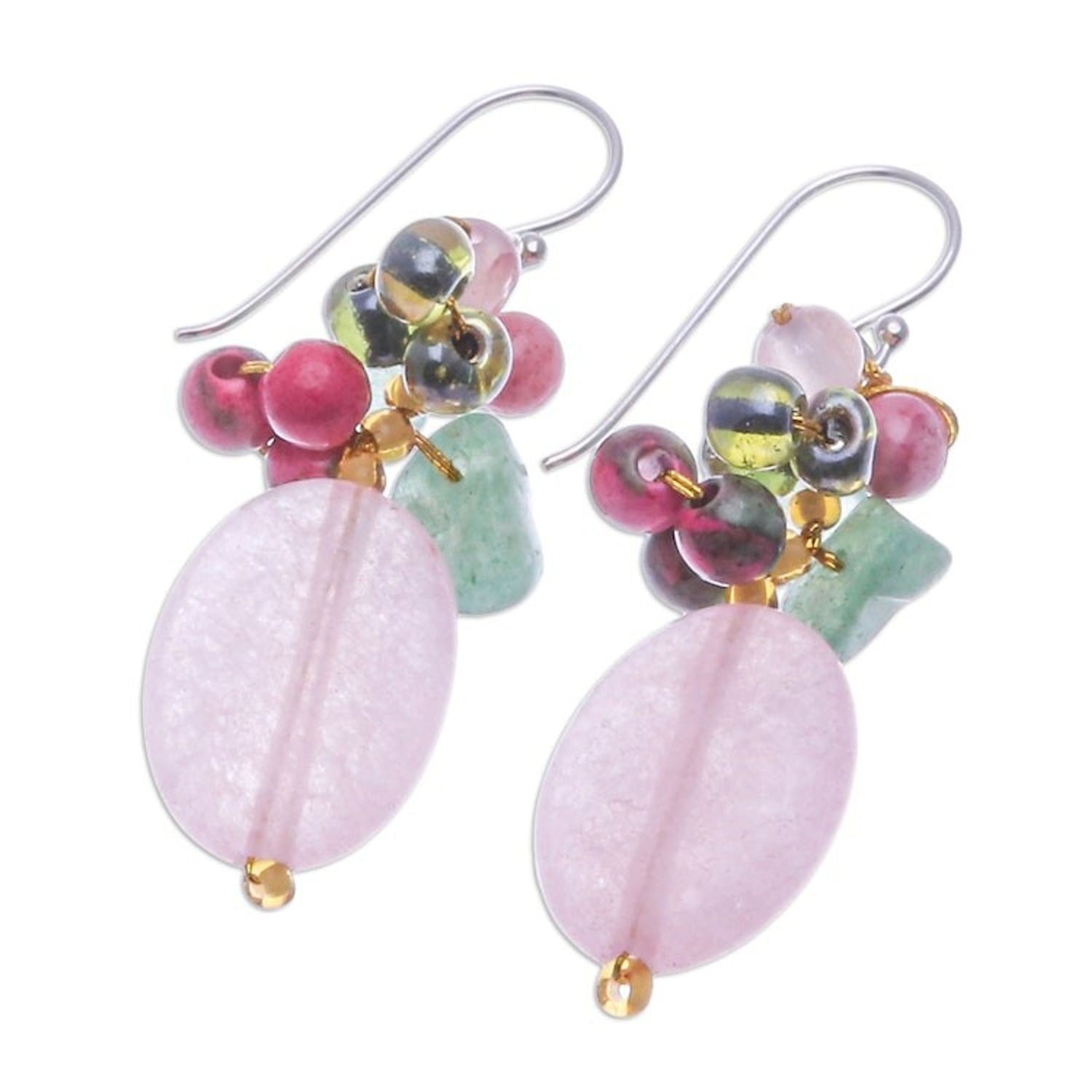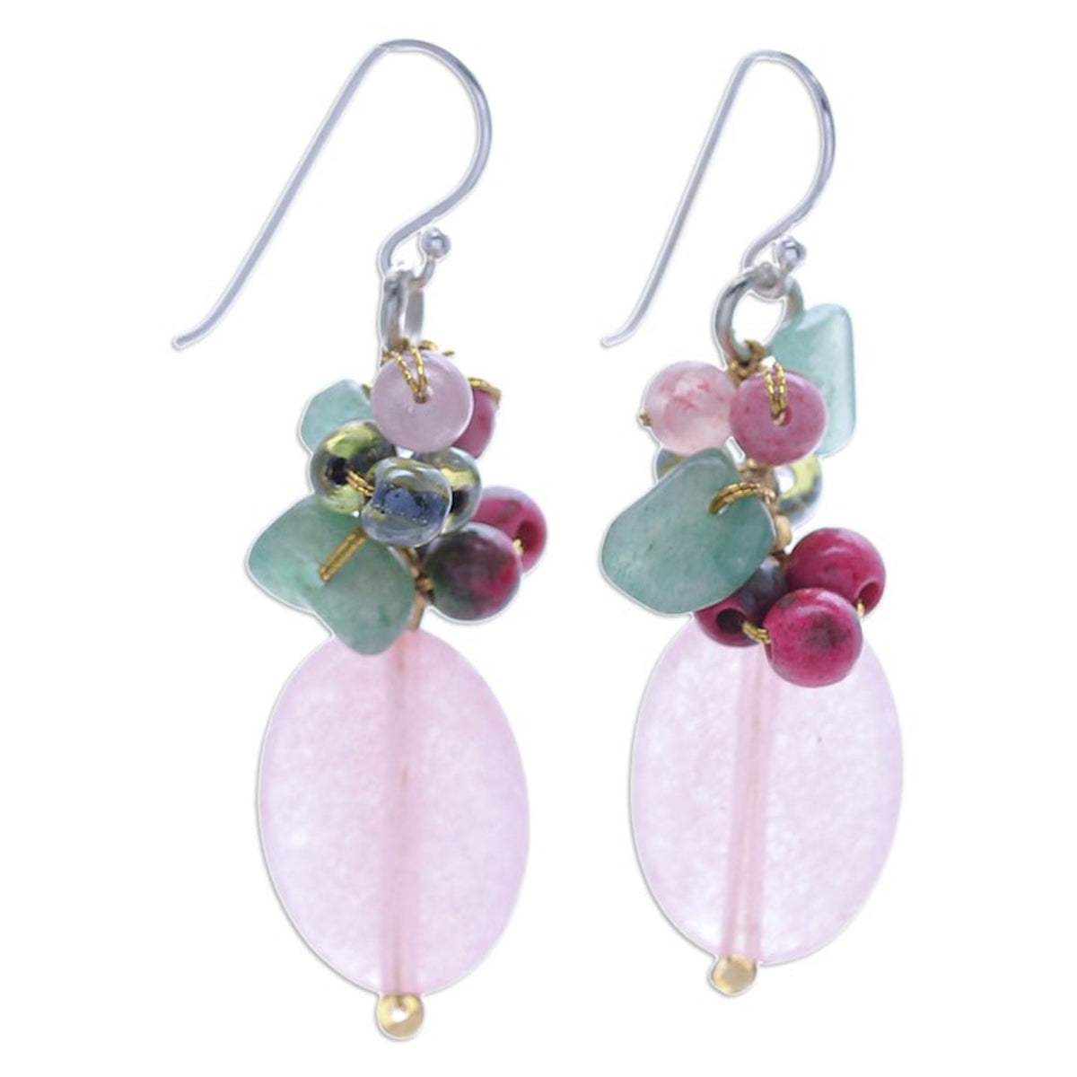 These Quartz Aventurine Glass and Resin Beaded Cluster Earrings 'Pink and Green Chic' by Independent Artisans are a lively and glamorous accessory that will make any outfit pop. Designed by Thai artisan Nareerat, a masterful combination of colorful quartz, aventurine, glass, and resin beads is expertly arranged with golden metallic thread. The vibrant color palette and intricate design ensure you’ll turn heads wherever you go. Finished with lustrous sterling silver hooks, these earrings are the epitome of chic sophistication and playful style.