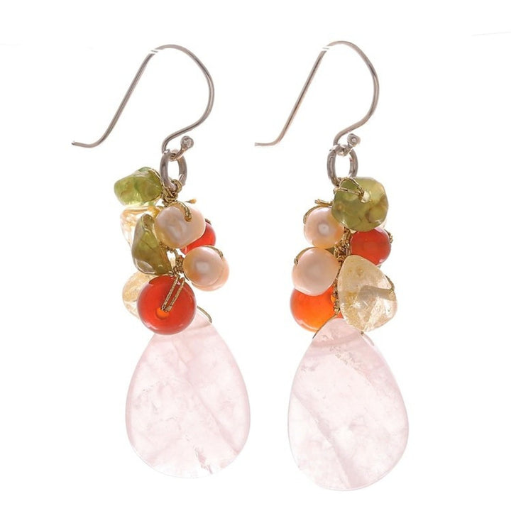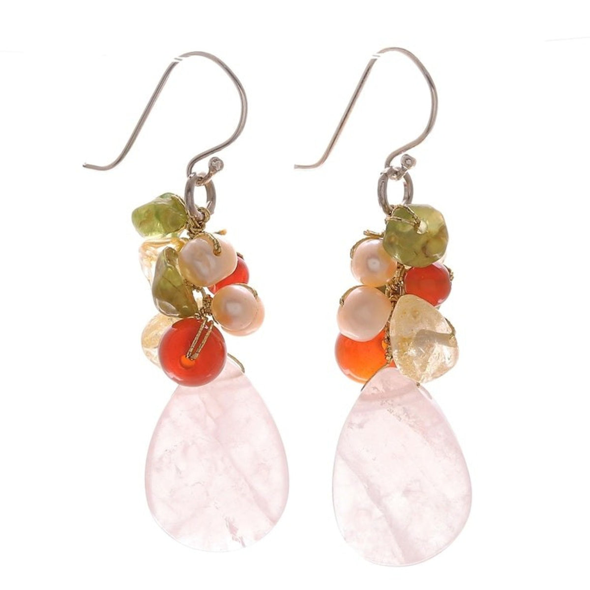Handcrafted from rose quartz, carnelian, citrine, peridot, and cultured pearl with sterling silver hooks and silver-plated brass, these earrings measure 1.8 inches L x 0.5 inches W.