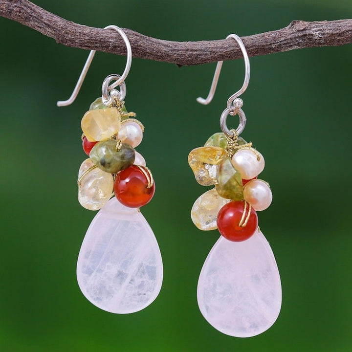 These Quartz Carnelian Citrine Cluster Earrings 'Tropical Garden' by Independent Artisans are a radiant and vibrant piece that brings the lushness of a tropical garden to your ears. Thai artisan Nareerat hand-knots gemstones on golden strands, creating a captivating cluster of rose quartz, bright carnelian, golden citrine, and brilliant peridot, accented with luminous pearls. The combination of colors and textures creates a joyful and harmonious look, perfect for a special occasion or for simply brightening up your day.