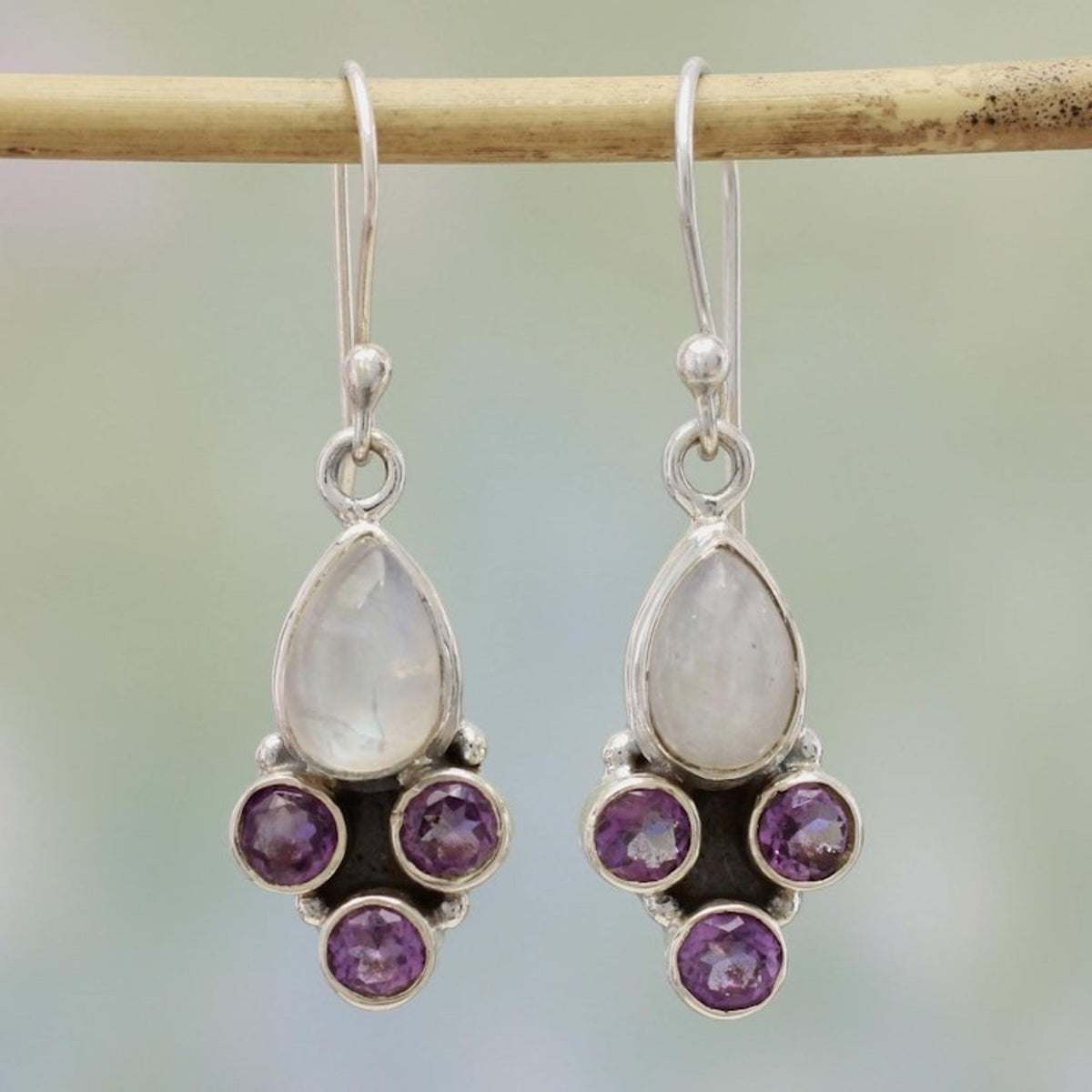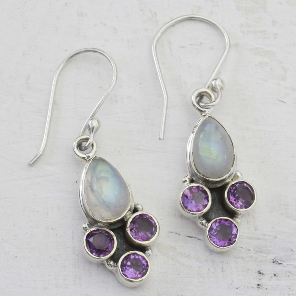 These Rainbow Moonstone and Amethyst Dangle Earrings from India 'Enthralling Sky in Purple' by Independent Artisans are an enchanting pair that captures the beauty of a twilight sky. Indian artisan Shanker presents these elegant sterling silver dangle earrings, where teardrop-shaped rainbow moonstones are gracefully suspended above one carat of sparkling, circular amethyst stones. The design is both simple and sophisticated, allowing the natural allure of the gemstones to take center stage, creating a truly alluring and graceful accessory.