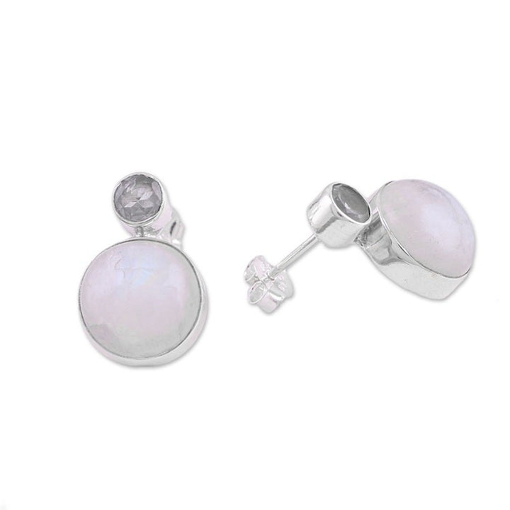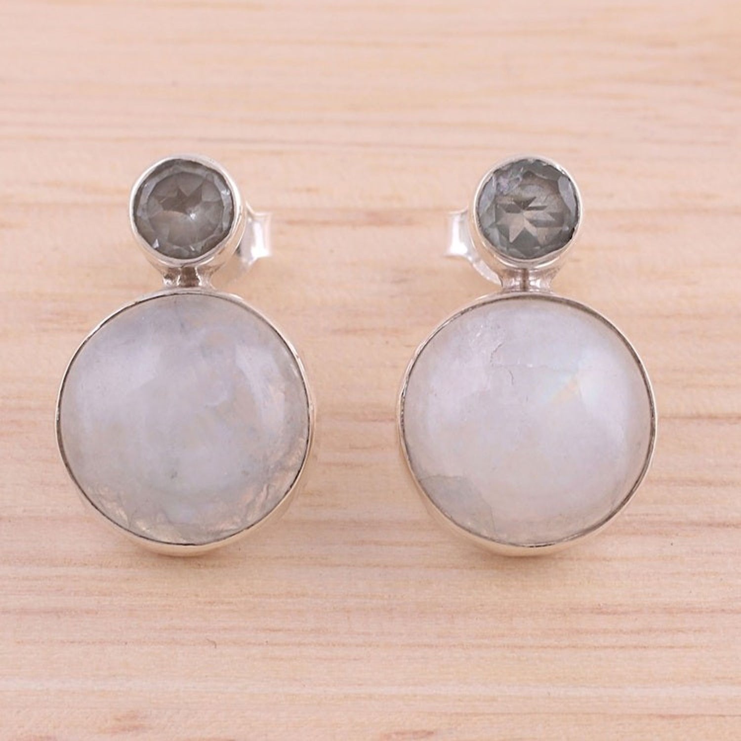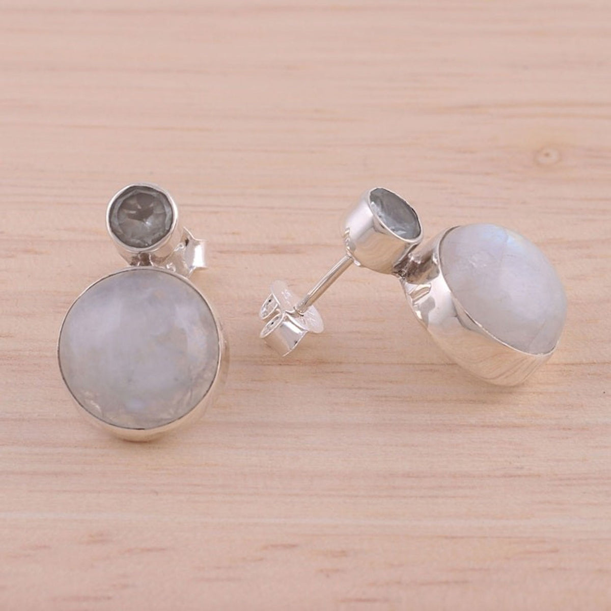 These Rainbow Moonstone and Blue Topaz Drop Earrings from India 'Delhi Diva' by Independent Artisans are a stylish and vibrant pair of drop earrings. Indian artisan Shanker showcases alluring rainbow moonstones, which gleam within sterling silver bezels. Each earring is topped with a sparkling blue topaz, creating a beautiful and eye-catching design. These handcrafted earrings are a perfect blend of modern style and traditional gemstone work, making them a great choice for adding a touch of 'Diva' glamour to your day.