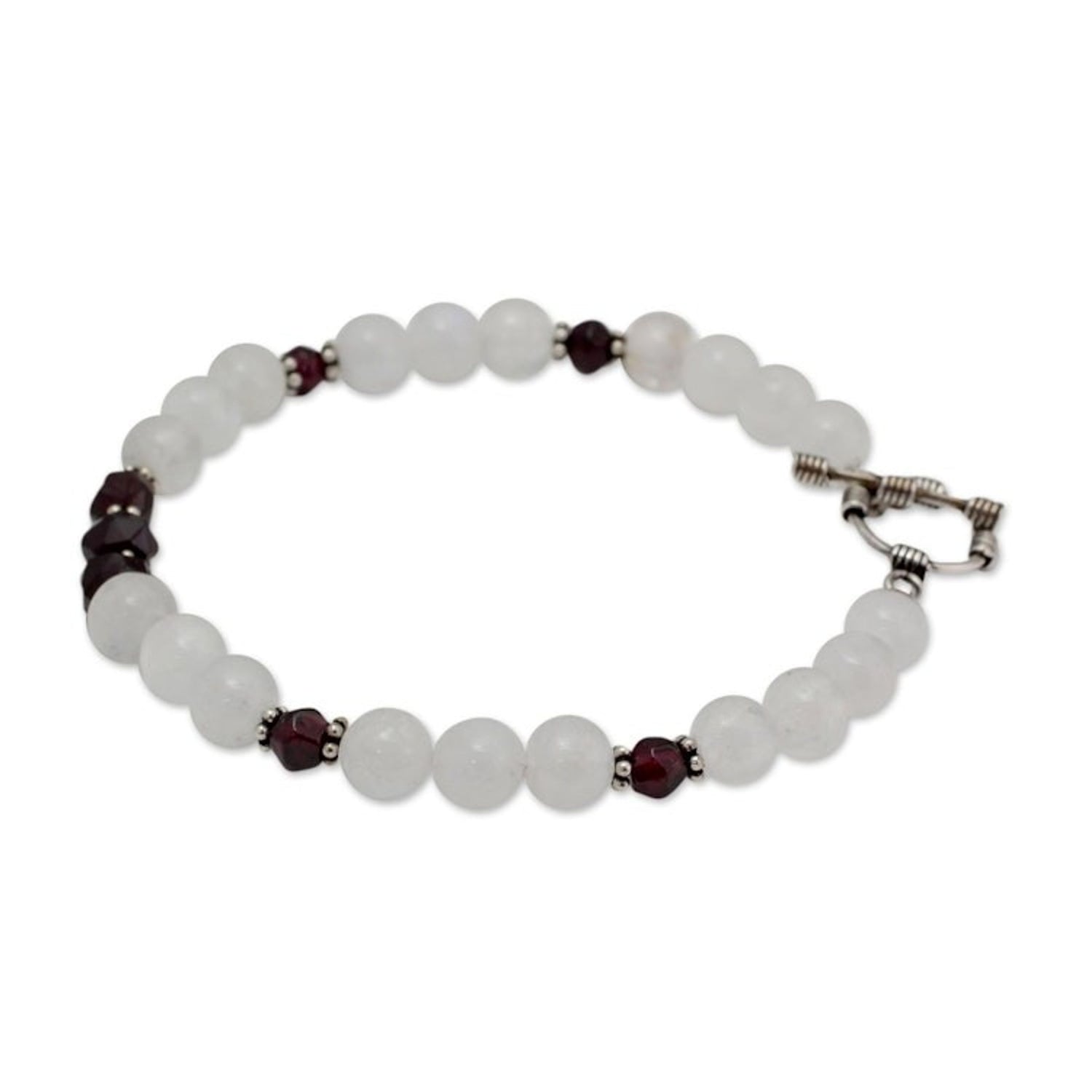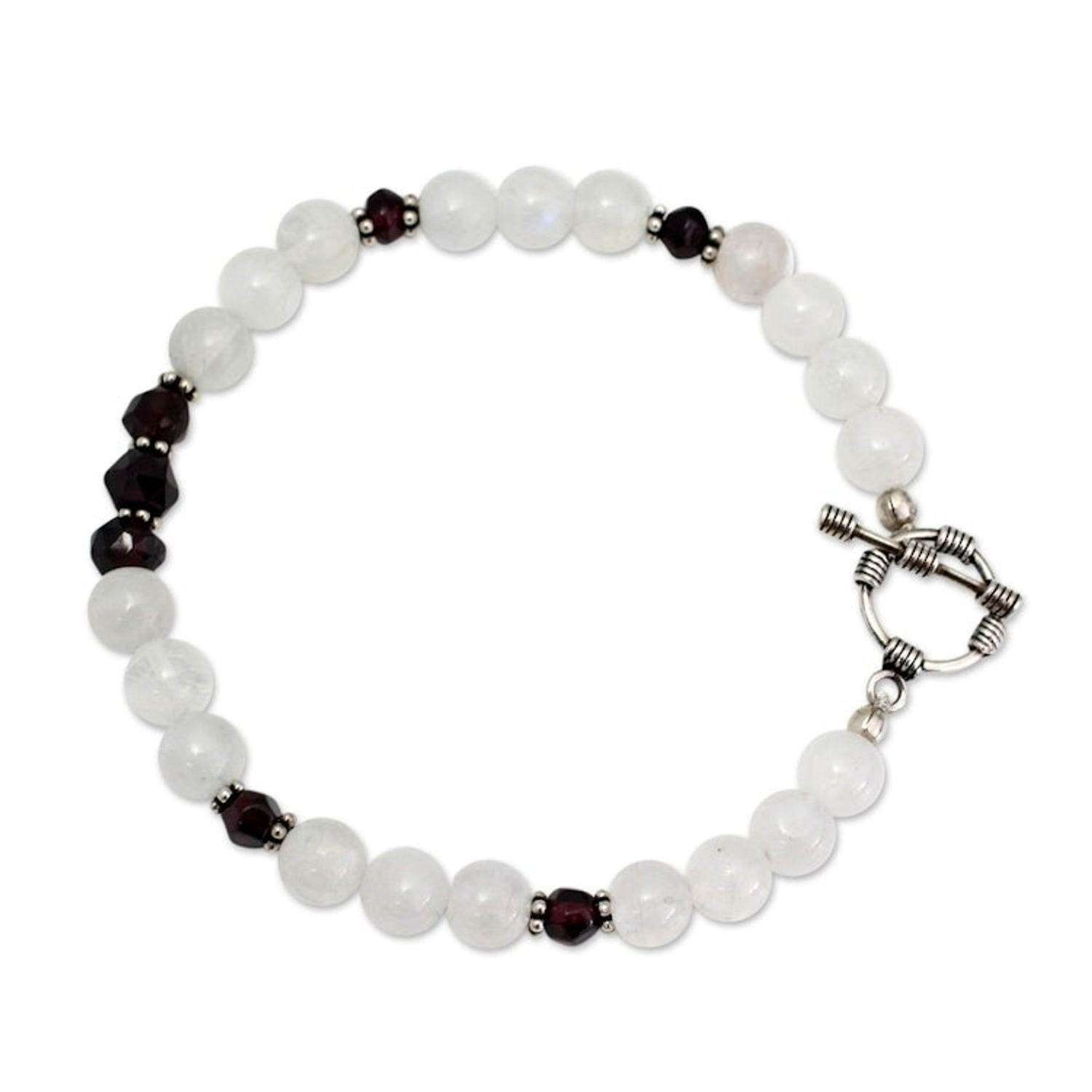 Handcrafted from rainbow moonstone, garnet, and sterling silver, this bracelet measures 7.8 inches L x 0.3 inches W and features a combination finish and a toggle clasp.