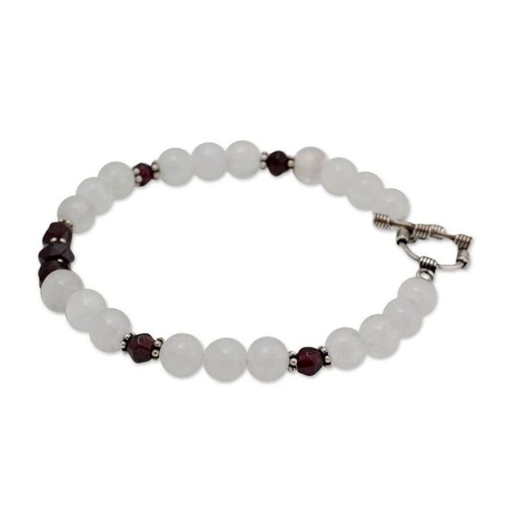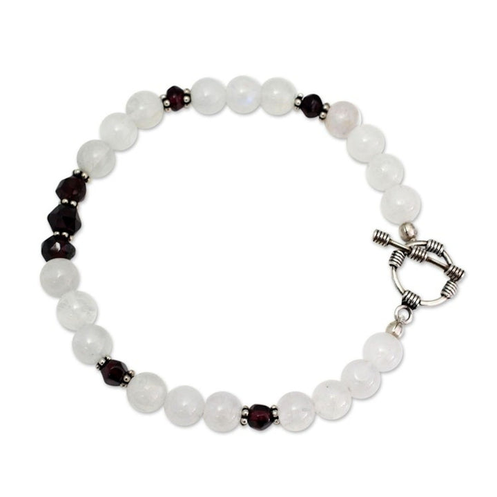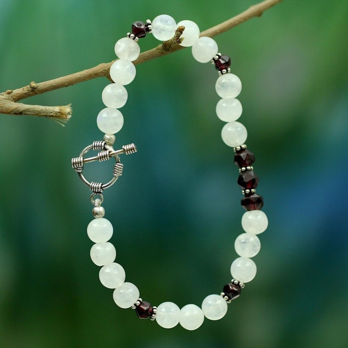 This Rainbow Moonstone and garnet beaded bracelet 'Rajasthan Dancer' by Independent Artisans is an elegant and rhythmic design that captures the spirit of a Rajasthani dancer. Indian artisan Narayannii artfully arranges bright red garnets and luminous rainbow moonstones along a delicate path, accented by sterling silver beads. The combination of the deep red and the iridescent glow creates a beautiful, graceful movement. With over ten carats of garnet, this bracelet is a stunning and captivating accessory.