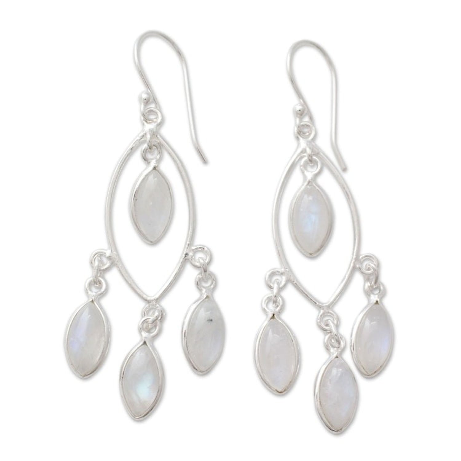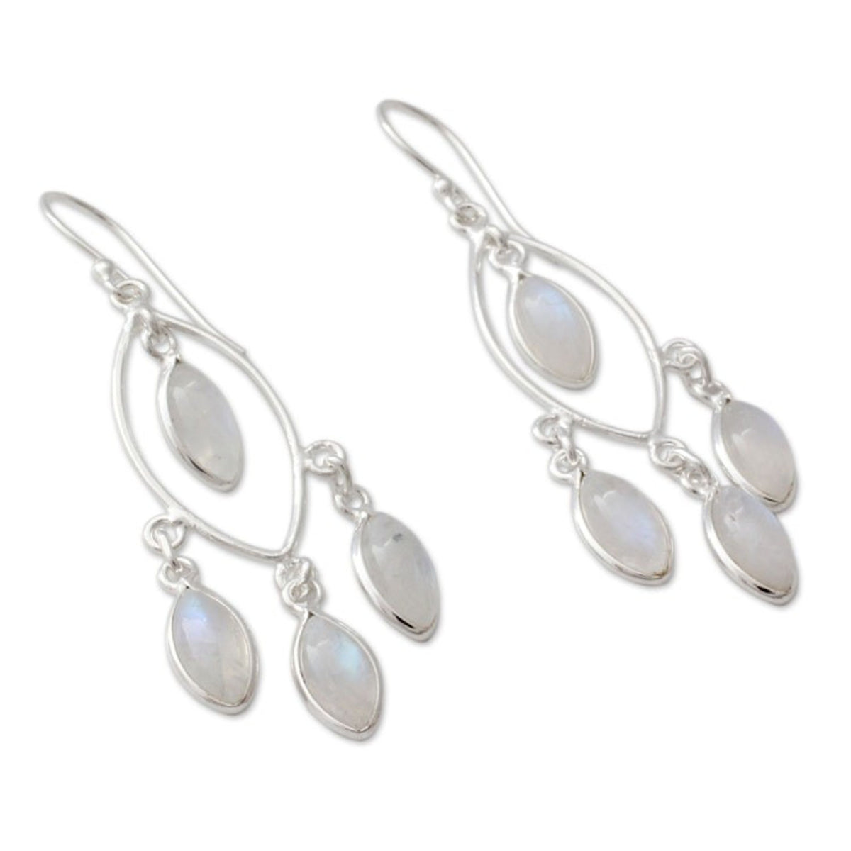 These Rainbow Moonstone and Sterling Silver Chandelier Earrings 'Luminous Dew' by Independent Artisans are a truly mesmerizing pair that celebrates the enchanting beauty of natural moonstones. Indian artisan Alok Jain presents these lovely chandelier earrings, where the iridescent moonstones are poised like dewdrops in their elegant sterling silver settings. Associated with new beginnings and hope, these translucent gems are believed to foster happiness and good fortune, making these earrings not just a beautiful accessory but also a meaningful charm.