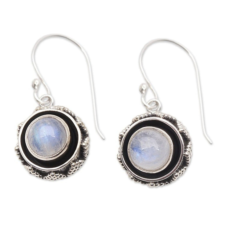 These Rainbow Moonstone and Sterling Silver Dangle Earrings 'Batur' by Independent Artisans are a captivating pair inspired by the natural beauty of Bali's active volcano. Balinese artisan Made Sugi highlights the unique, iridescent allure of rainbow moonstone, placing a lovely pair of these stones at the center of a dynamic sterling silver design. The earrings feature classic Balinese motifs, such as swirling patterns, and a combination finish that adds depth and texture. These earrings are a meaningful and distinctive accessory that celebrates the artistry and culture of Bali.