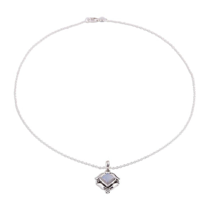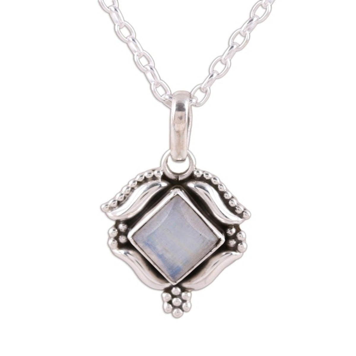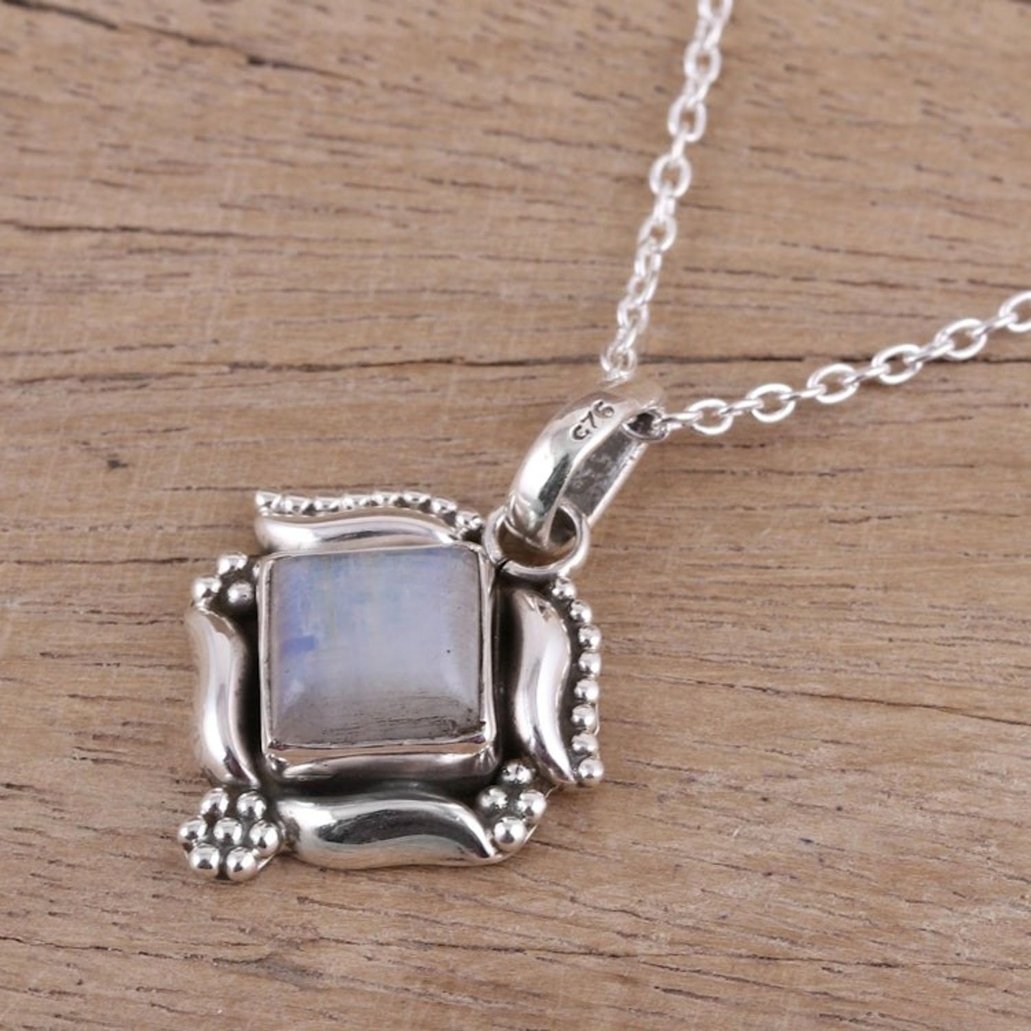 This Rainbow Moonstone and Sterling Silver Pendant Necklace 'Ethereal Promise' by Independent Artisans is a stunning accessory that adds a mystical allure to any look. Presented by Indian artisan Aparna, the handcrafted sterling silver pendant features a beautiful square cabochon of rainbow moonstone that shimmers from a bezel setting. The luxurious design is bordered by delicate waves and orbs of silver, which accentuate the central gem's glow. This necklace beautifully connects the wearer to Jaipur's rich traditions while offering a timeless, elegant beauty.