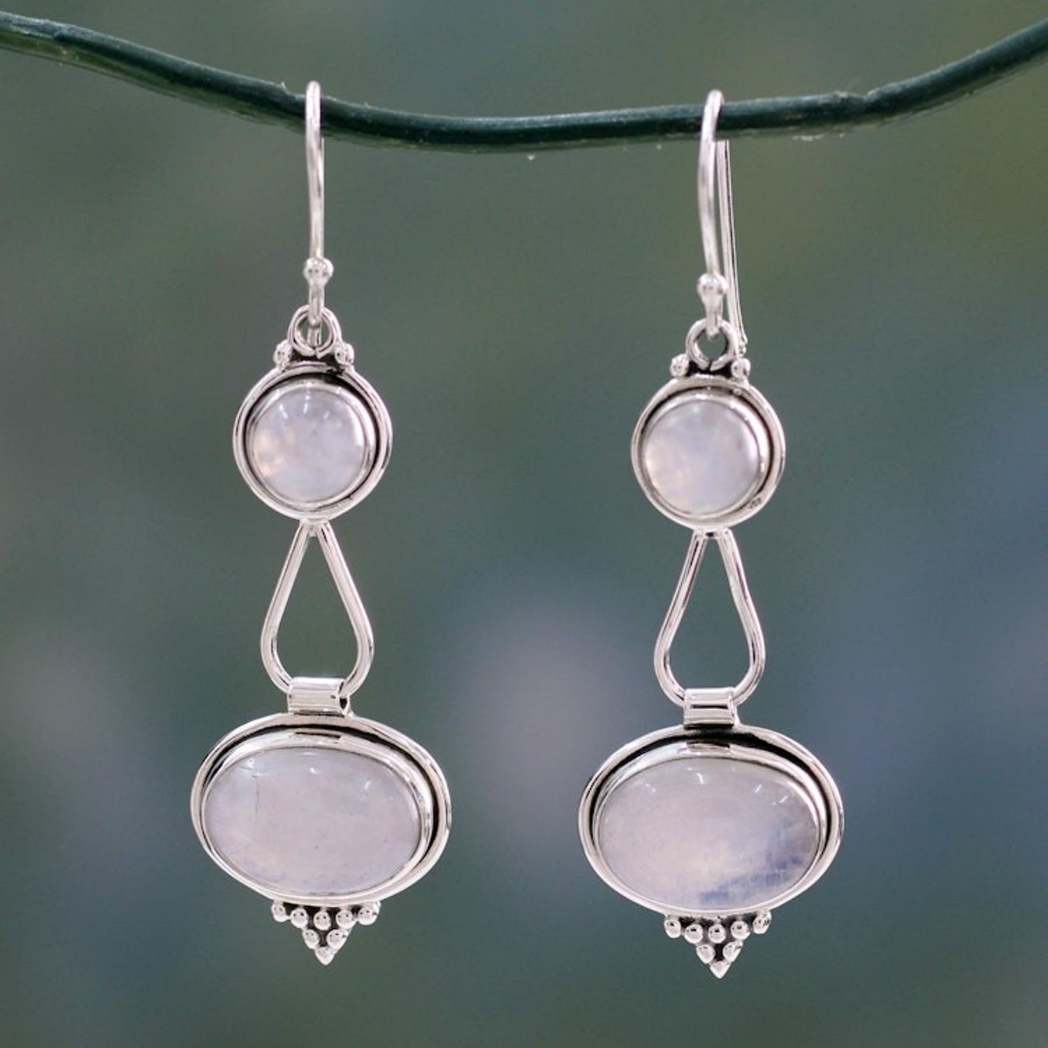 These Rainbow Moonstone Earrings Sterling Silver Handmade 'Goddesses' by Independent Artisans are a captivating pair that celebrates the ethereal beauty of rainbow moonstone. Designed by Shanker, these sterling silver earrings feature the sacred stone of the moon goddess, which is believed to foster hope, happiness, and humanitarian love. The luminous gems are beautifully showcased in a sleek and modern design, making them a powerful and elegant accessory for any occasion.