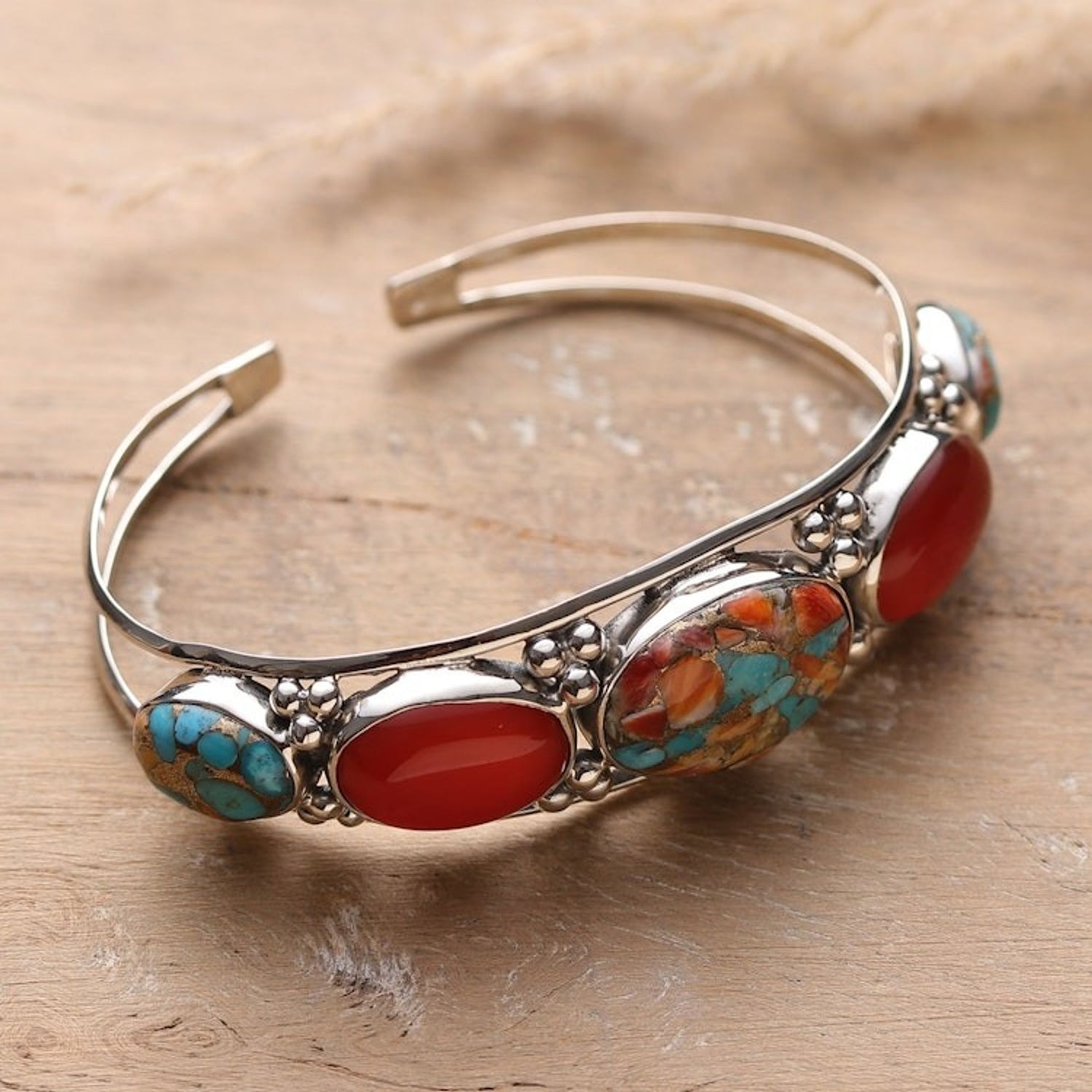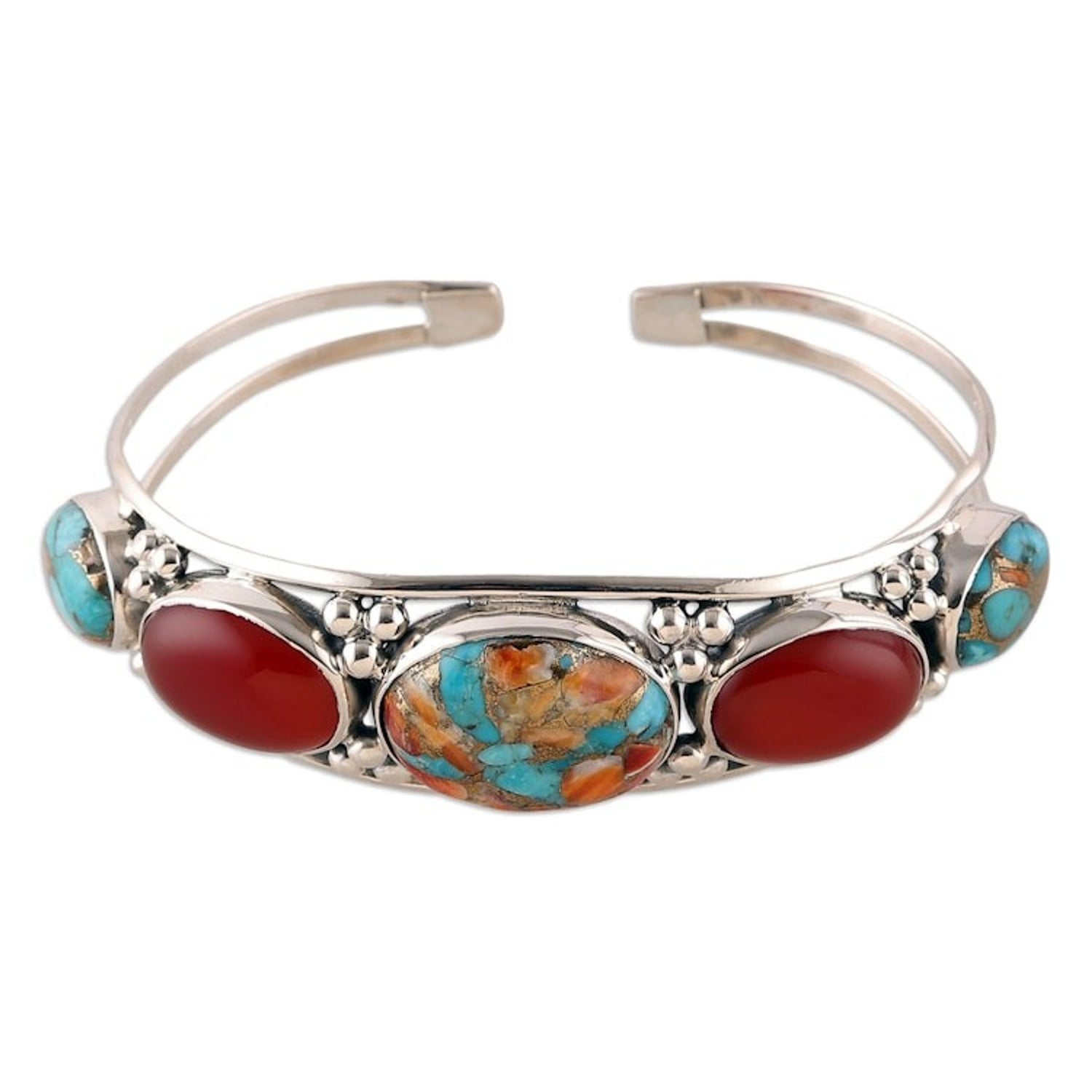 This Reconstituted Turquoise Carnelian Silver Cuff Bracelet 'Lively Allure' by Independent Artisans is a dazzling cuff bracelet that adds a pop of color to your wrist. Presented by Neeru Goel, this sterling silver bracelet features reconstituted turquoise and carnelian, which shine brilliantly against the silver backdrop. The bracelet, with an estimated 38 carats of gemstones, also has delicate granulated dot accents that add a touch of timeless elegance and handcrafted detail.