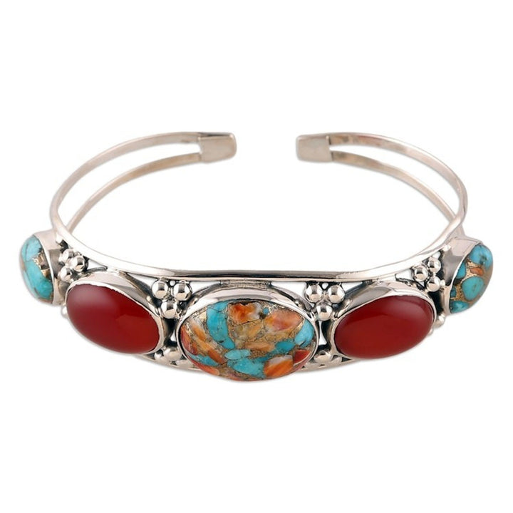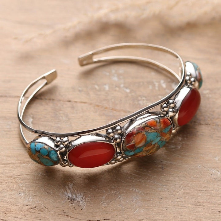 Reconstituted Turquoise Carnelian Silver Cuff Bracelet 'Lively Allure'