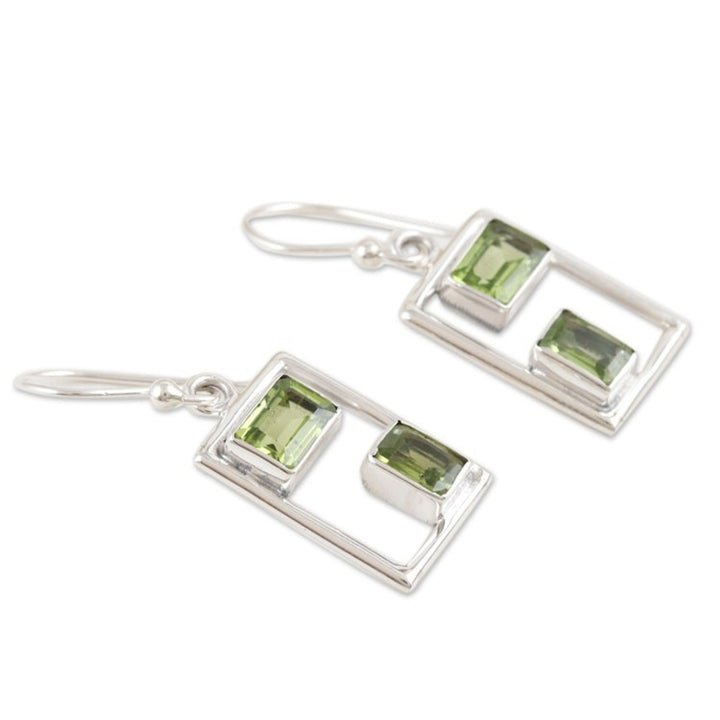 These Rectangular Faceted Peridot Dangle Earrings from India 'Fortune Order' by Independent Artisans are an elegant pair that adds a futuristic vibe to any outfit. Presented by Narayani, these sterling silver dangle earrings feature rectangular faceted peridot stones. The high-polish finish and clean design make them a beautiful complement to any look and an amulet of good fortune. This accessory reflects the artisan's quiet strength and enduring love for beauty.