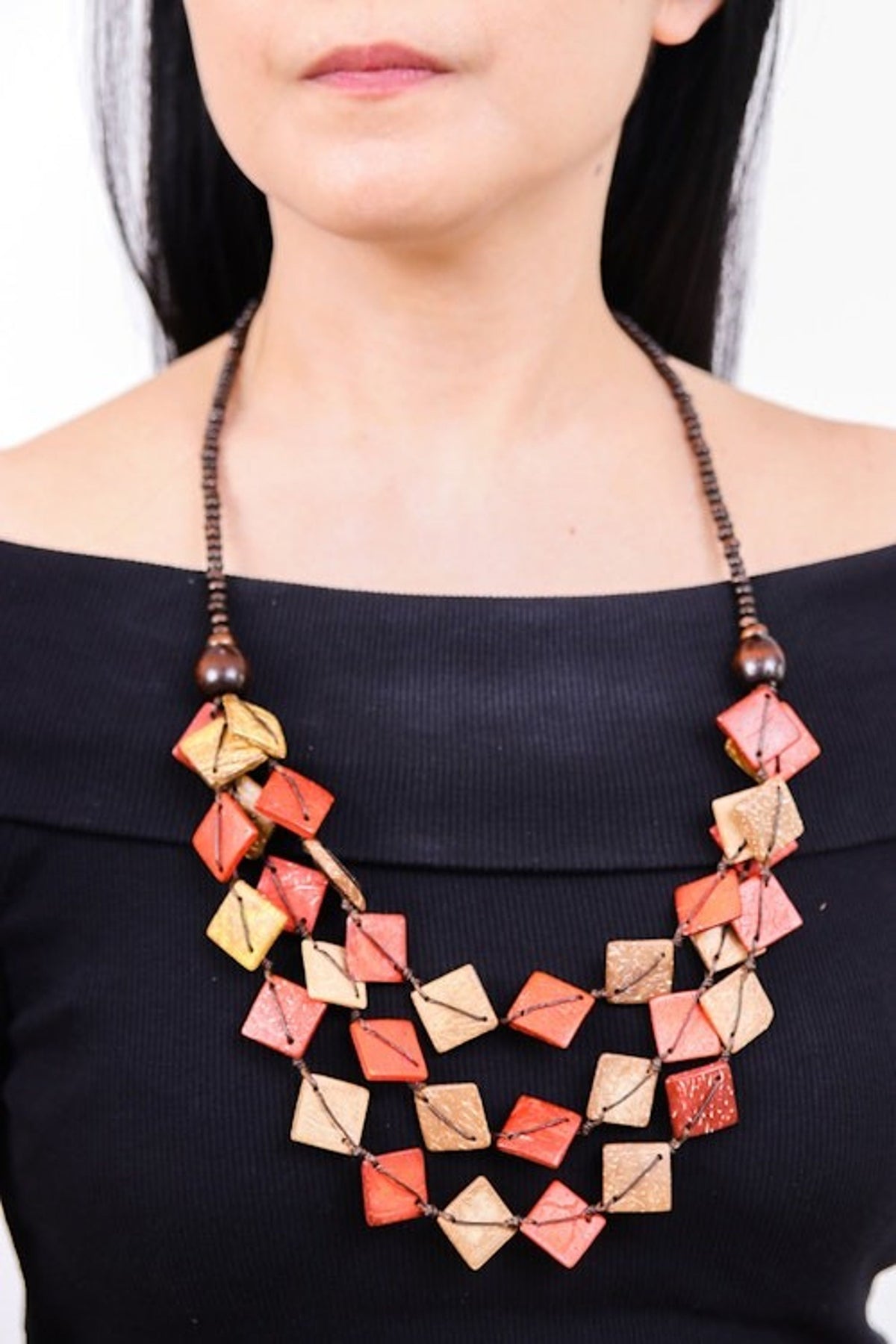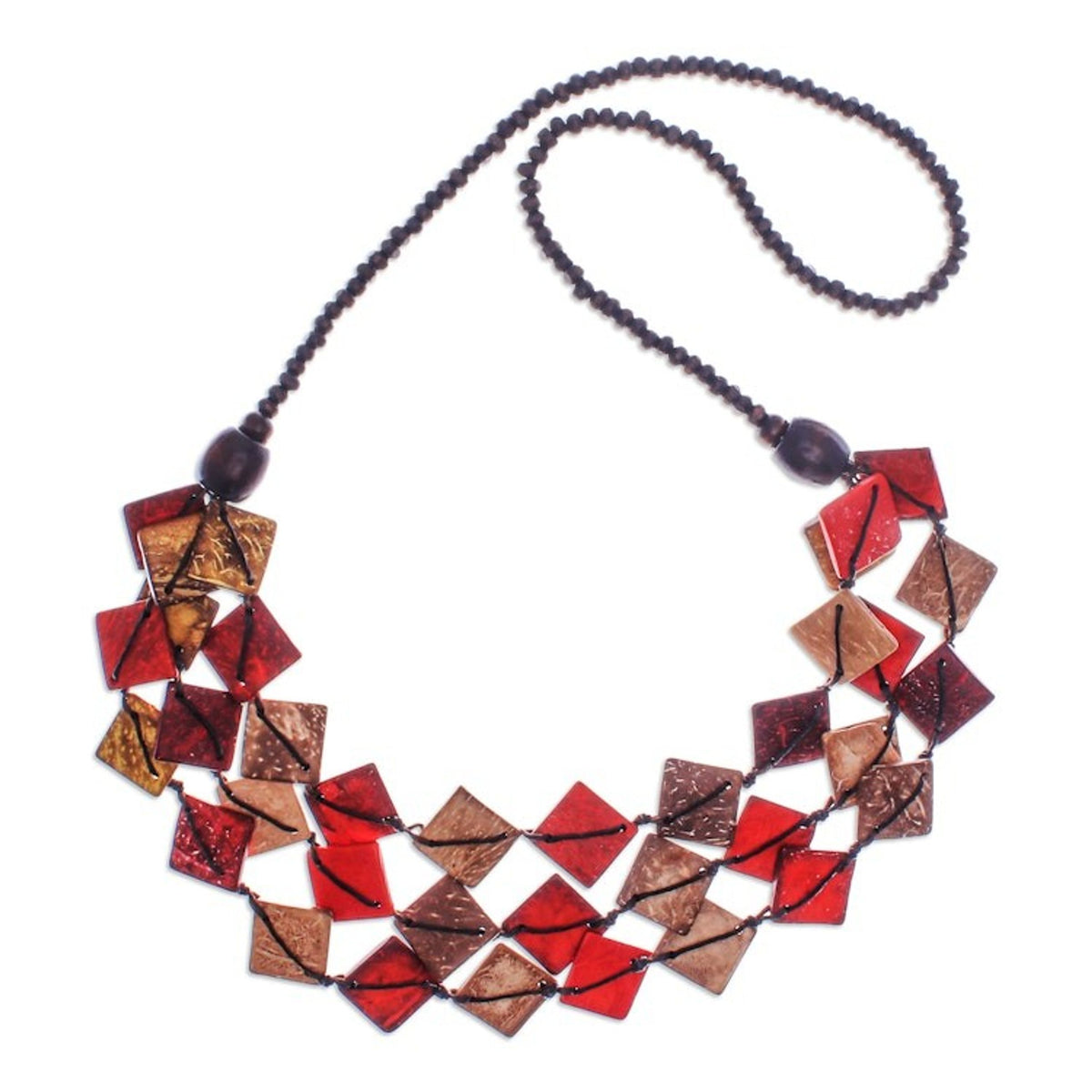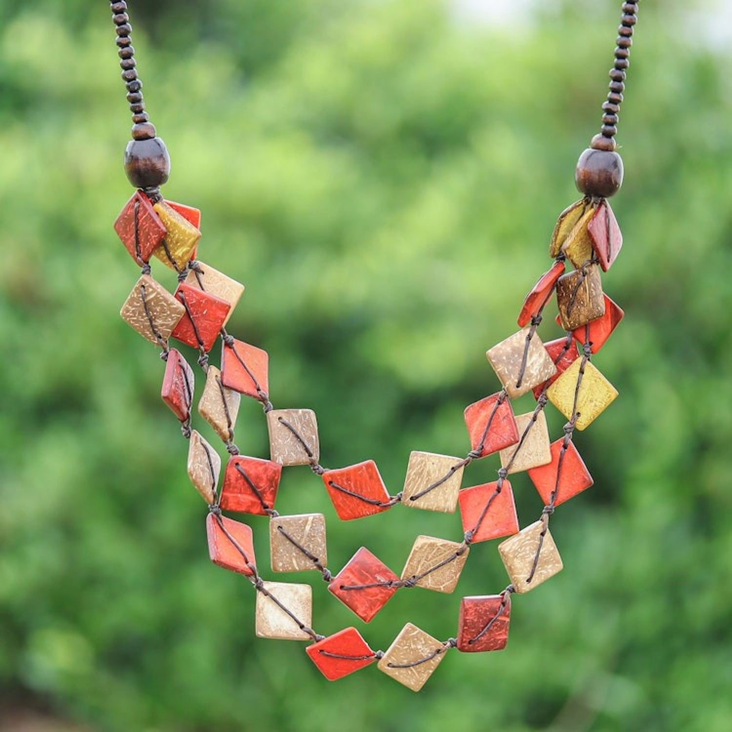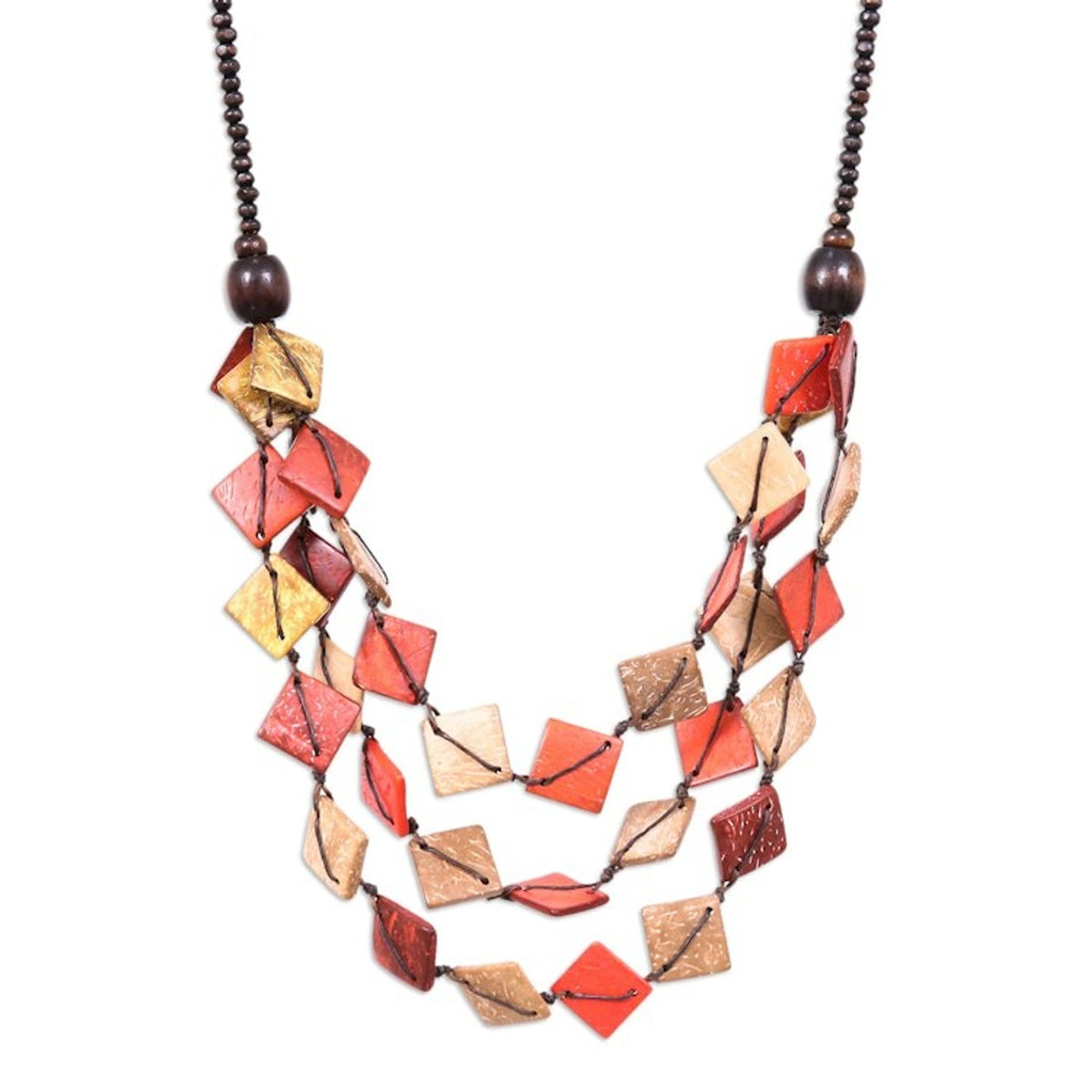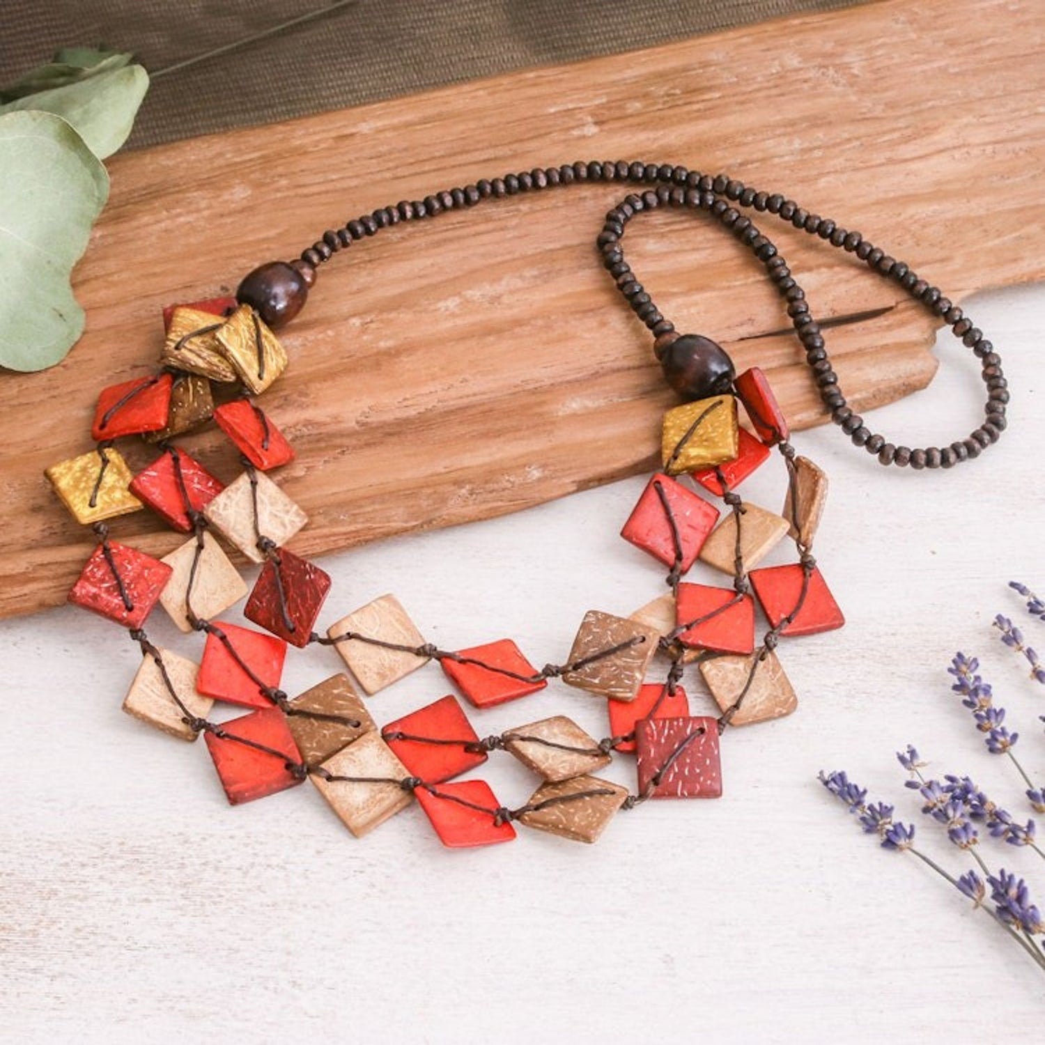 This Red and Golden Wood and Coconut Shell Beaded Strand Necklace 'Fire Diamonds' by Independent Artisans is a dapper accessory that captures the beauty of the fire element. Designed by Sumalee Nawakul, the three-strand necklace features coconut shell pendants shaped like diamonds and painted in red, brown, beige, and golden hues, imitating a captivating flame. Little leaf wood beads add a bohemian touch, and the piece is a testament to the artist's determination to uplift others through her craft.